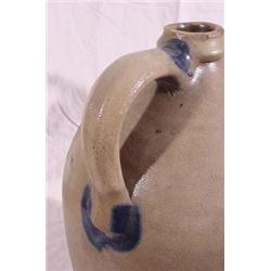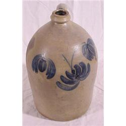 Cobalt Blue Decorated Stoneware 2 Gallon Jug; With incised "2" above a beautiful cobalt blue double flower, with a splash of blue on handle, shiny glaze seems worn from area on side, otherwise nice condition, 13.5"t x 9.75"dia. Est. $200 - $300.