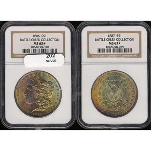 Lot of Two Toned Battle Creek Morgans.. Obverse toned 1886 NGC MS63* & Reverse toned 1887 NGC MS63*. (#7166)<p><i>from The Battle Creek Collection, Part III</i>