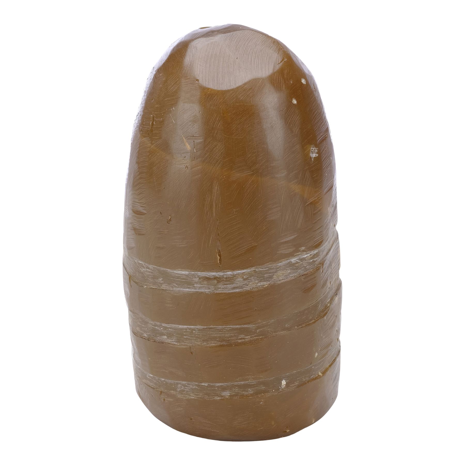 Two styles of stones were produced for the film: non-illuminating opaque versions for when the stones were at rest and semi-translucent illuminating versions for when the stones' magic would make them glow. This static, opaque, amber-colour resin stone, originally from the collection of Prop Master Barry Wilkinson, is textured to appear ancient with white horizontal stripes carved into the bottom. Its top exhibits chipping and bits of paper remain adhered to the base from production. Dimensions: 9 cm x 9 cm x 15.25 cm (3.5" x 3.5" x 6")
