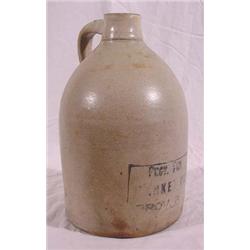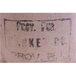 One Gallon Stoneware Jug with Advertising; 1 gallon jug with printed inscription which includes "Prve. Pur. … Rket Co. Prov. R.I." 11.25"t x 7.25"dia. Est. $80 - $125.