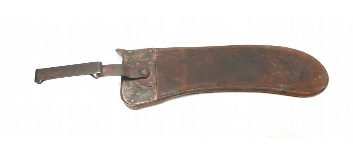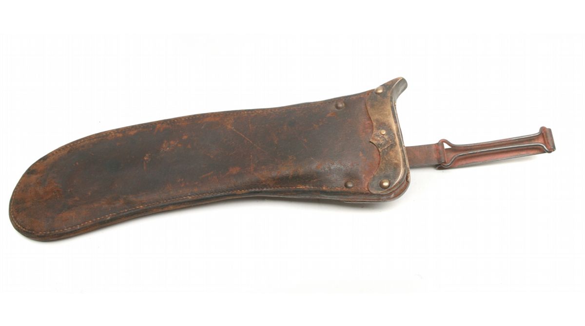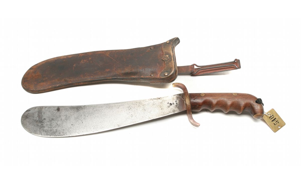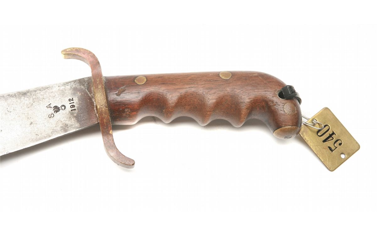 Model 1904 - 17.25" overall, 12" blade - left ricasso marked SA (Springfield Armory)/flaming bomb/1912 - right ricasso marked US/28602 - brass S-guard/pommel - walnut handles with deep finger grooves - crack to right handle - freckling on blade - some pitting/rust - leather scabbard with wear - blackened brass throat - metal hanger - numbered brass tag - non-ffl - 25CRRMA069