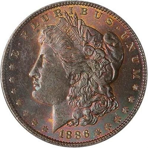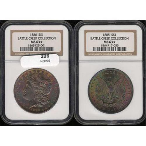 Lot of Two Toned Battle Creek Morgans.. Obverse toned 1886 NGC MS63* & Reverse toned 1885 NGC MS63*. (#7166)<p><i>from The Battle Creek Collection, Part III</i>