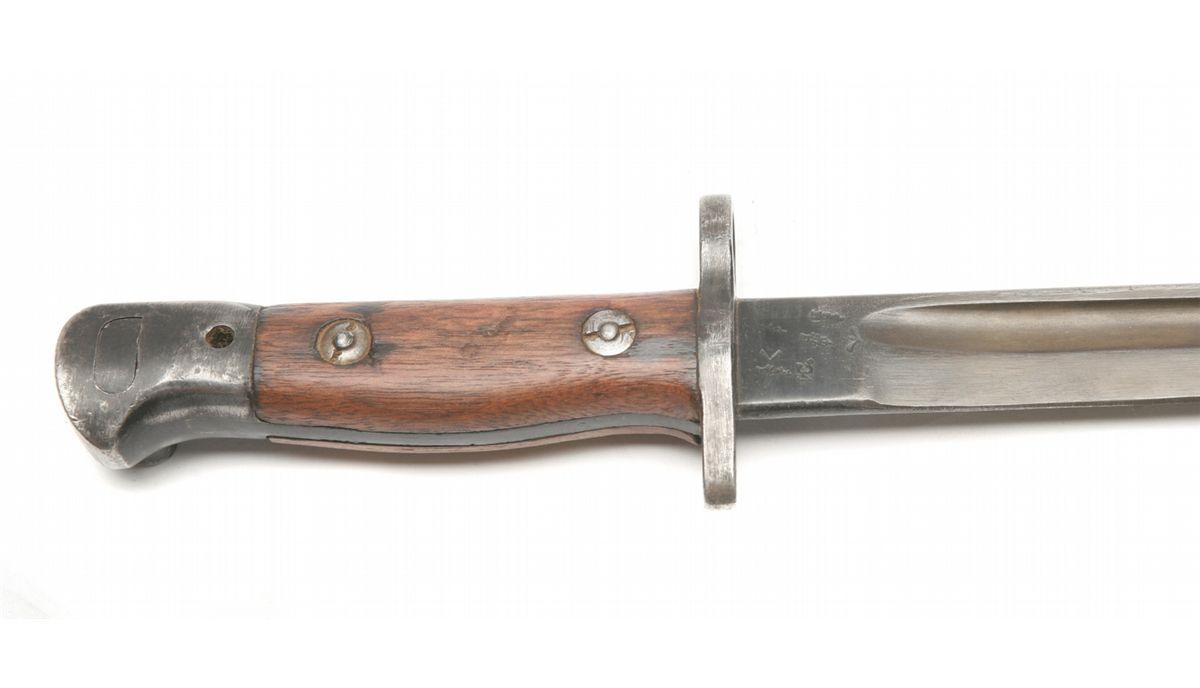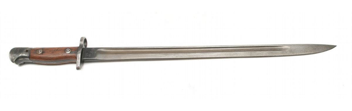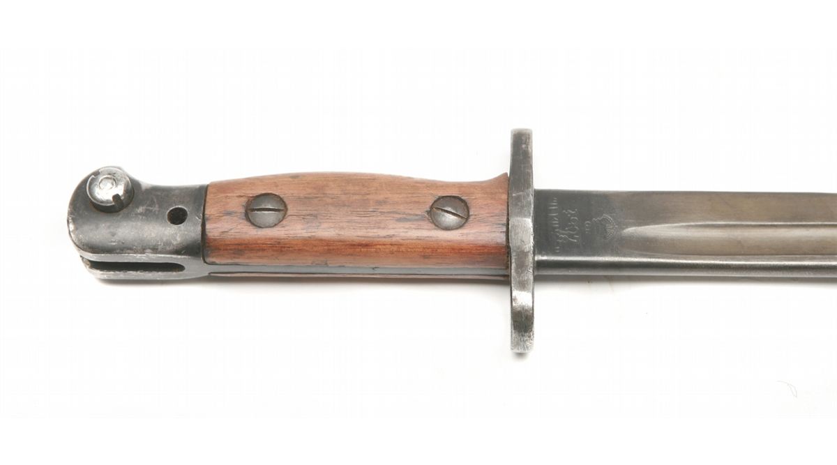 Pattern 1907 bayonet for SMLE series rifles (such as British Enfield No. 1 Mk III) - left ricasso marked crown/GR/1907/3 18/Wilkinson - right ricasso marked with various proofs including broad arrow acceptance, bend test, & '24 - wood grips in good condition - overall good condition - non-ffl - 25BBBRCKS054