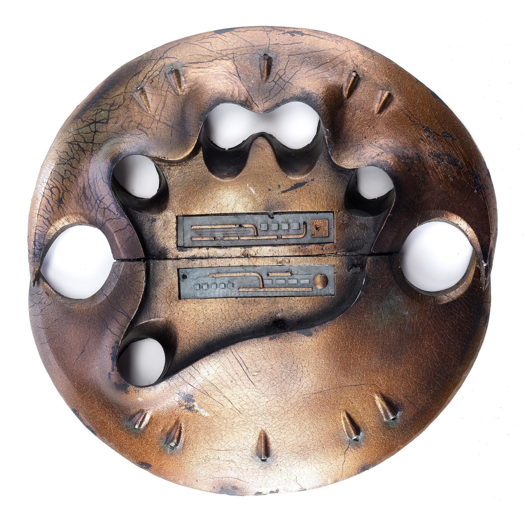 This lot will be auctioned on Tuesday, June 29th. The auction will begin at 9:00am PDT and lots are sold sequentially via live auctioneer; tune in to the live streaming broadcast on auction day to follow the pace. Note other lots in the auction may close on June 30th or July 1st. A stunt Predator Smart Disc from Stephen Hopkins' sci-fi action sequel Predator 2. In the slaughterhouse battle, the City Hunter Predator (Kevin Peter Hall) dispatched CIA agent Peter Keyes (Gary Busey) with its boomeranging Smart Disc. The Smart Discs were designed by Stan Winston Studio to differentiate the Predator from the creature in John McTiernan's Predator. Both operable servo-equipped and nonmechanical static versions were manufactured for production. This two-piece stunt Disc is constructed of dense rubber painted copper to appear mechanical with large finger holes, spiked details, and Yautja technology molded on both pieces. The Disc exhibits visible signs of production use and age, including flaking paint and cracked rubber, but remains in good overall condition. Dimensions: 10" x 10" x 1" (25.5 cm x 25.5 cm x 2.5 cm) Estimate: $5,000 - 7,000