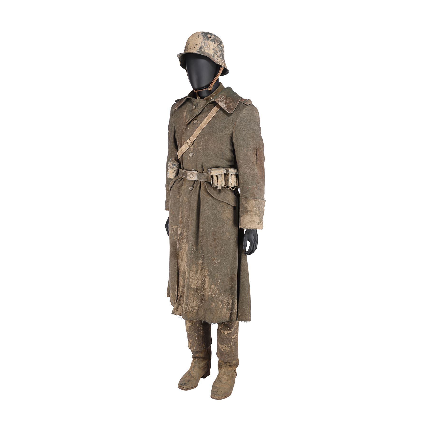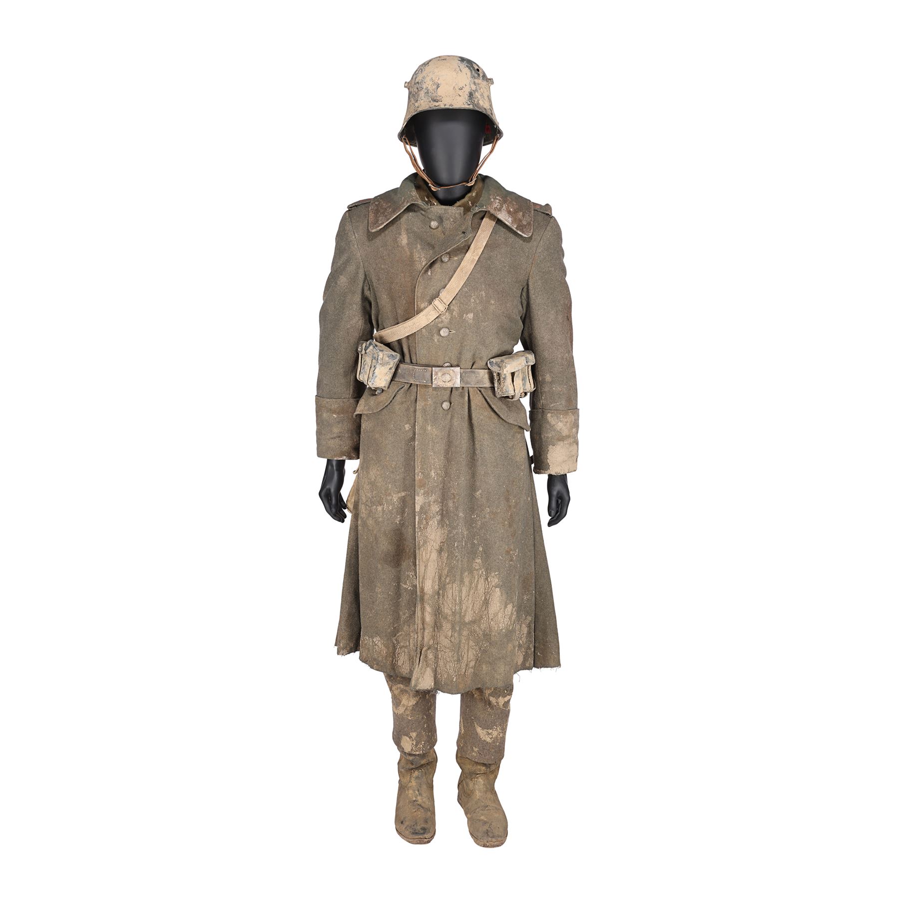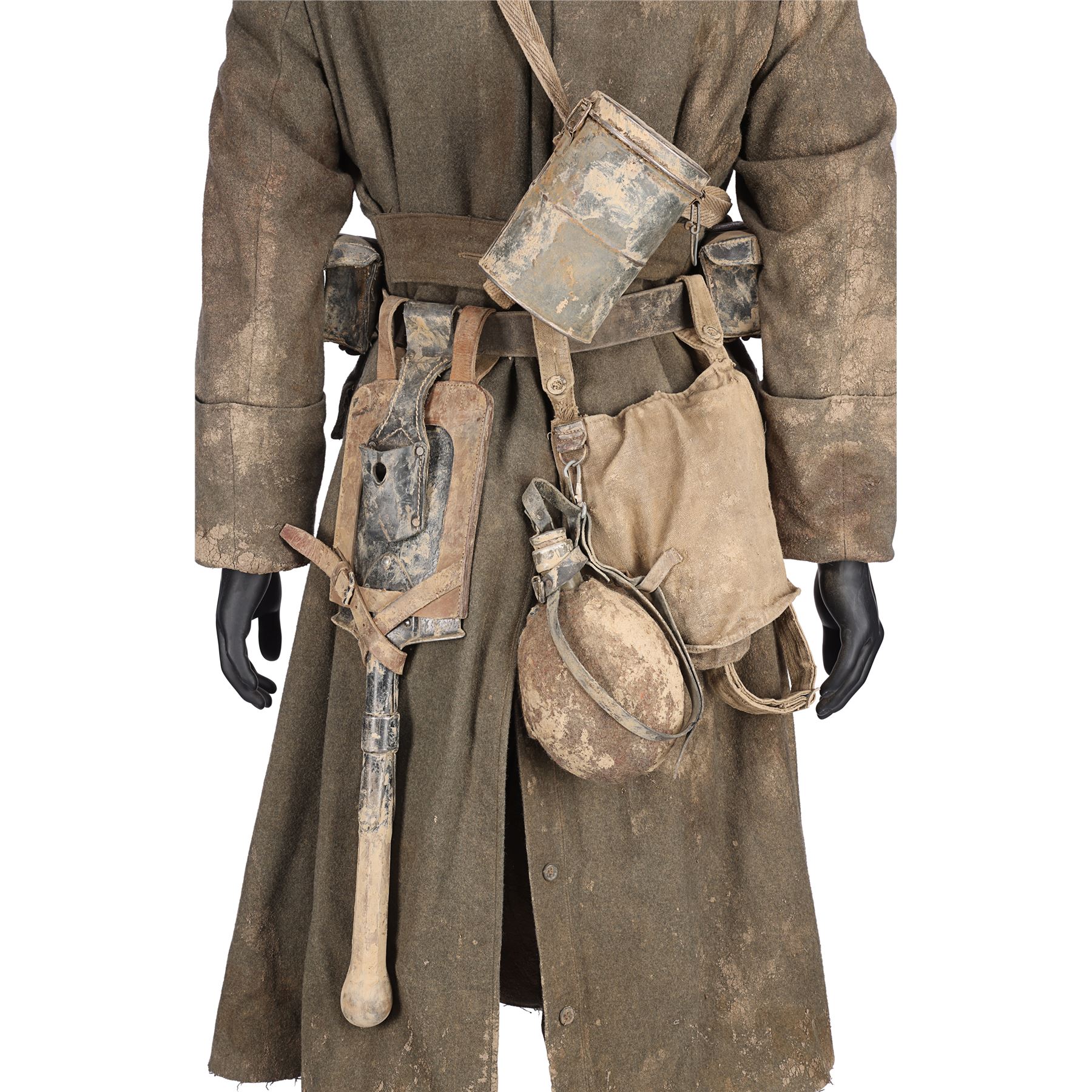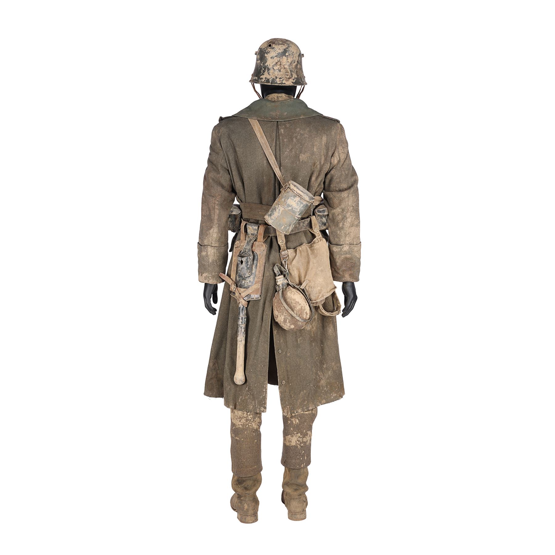 The costume consists of a long coat (labelled "1 Paul K5/1BB"); a jacket (labelled "1 Paul"); a shirt (labelled "48"); a steel helmet (labelled "#1 ST 3"); a pair of trousers; a pair of boots; a leather utility belt with a spade, water bottle and multiple pouches; and a metal gas mask canister with a shoulder strap. All the items have been intentionally heavily distressed and are caked with dried mud.