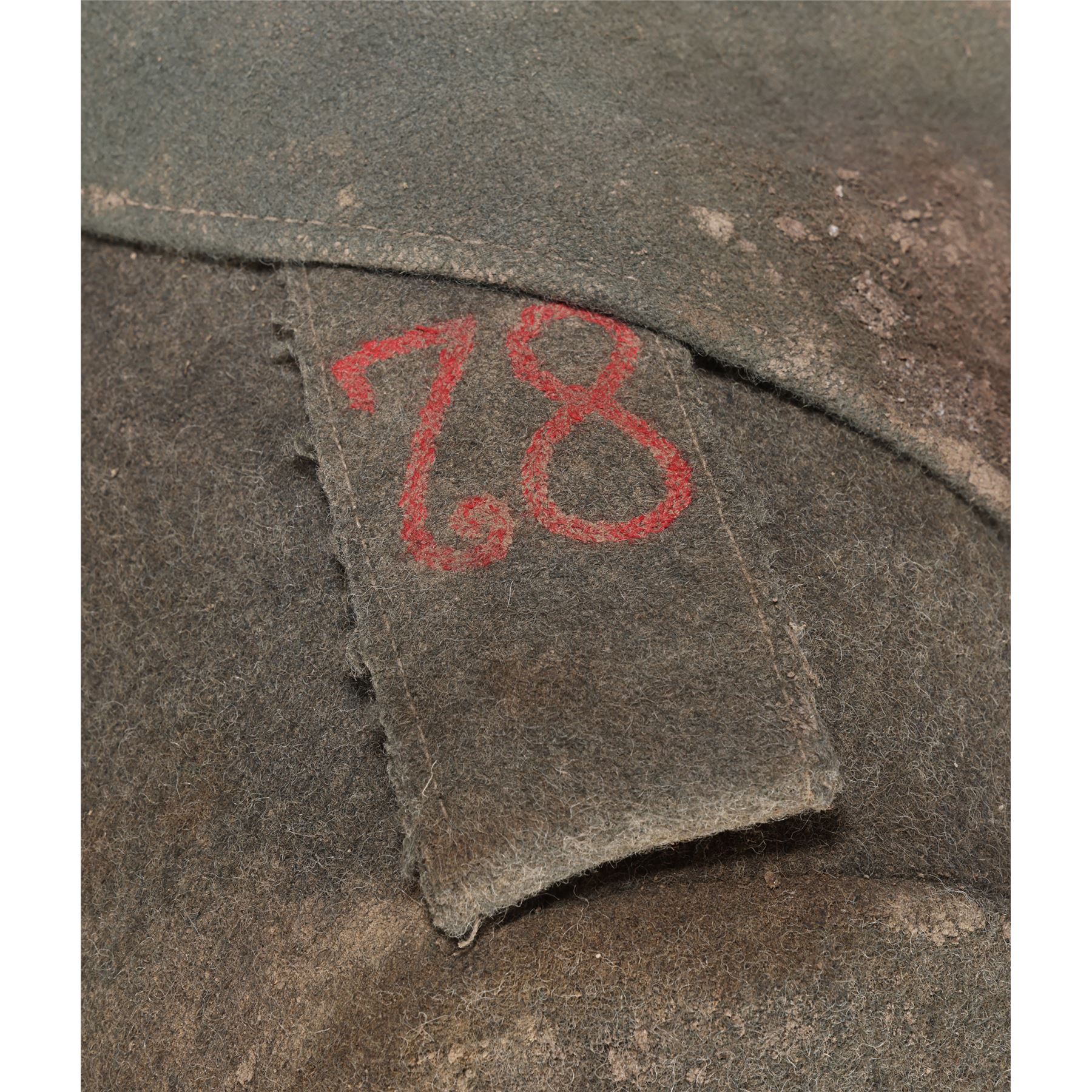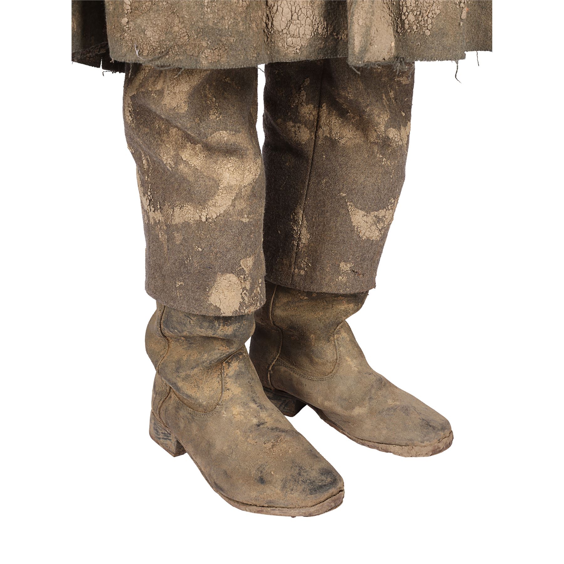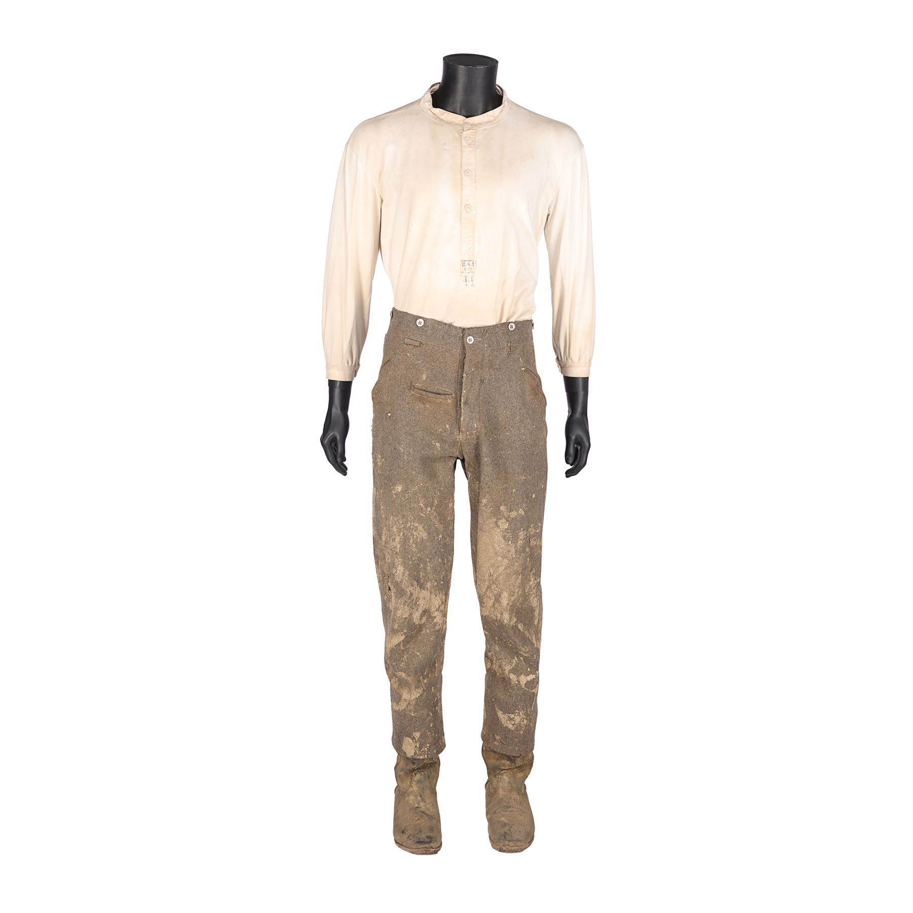 The costume consists of a long coat (labelled "1 Paul K5/1BB"); a jacket (labelled "1 Paul"); a shirt (labelled "48"); a steel helmet (labelled "#1 ST 3"); a pair of trousers; a pair of boots; a leather utility belt with a spade, water bottle and multiple pouches; and a metal gas mask canister with a shoulder strap. All the items have been intentionally heavily distressed and are caked with dried mud.