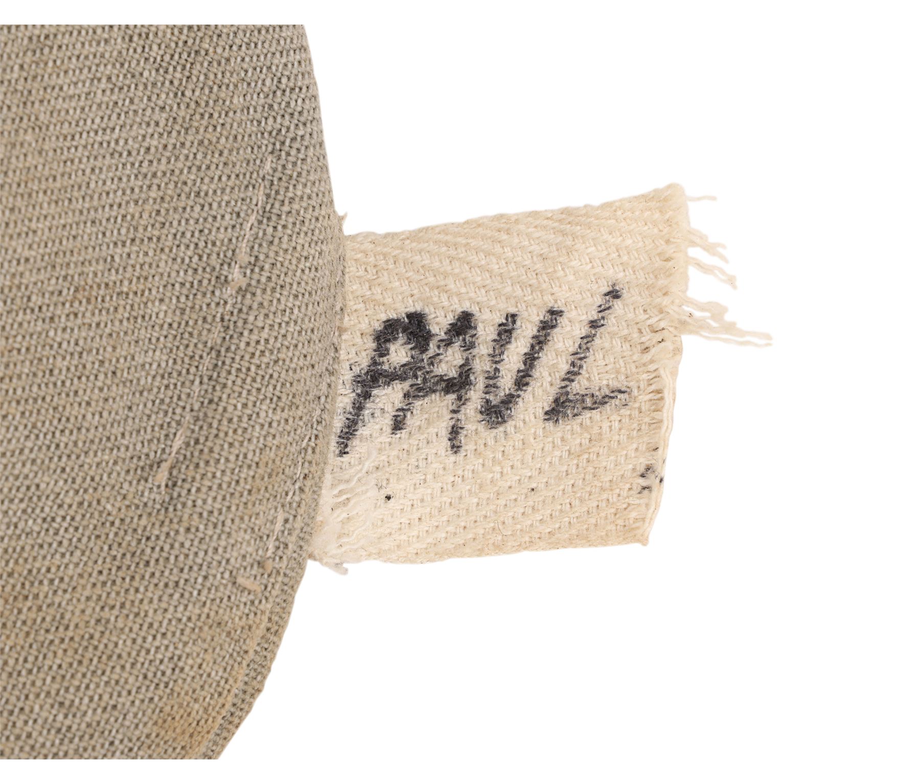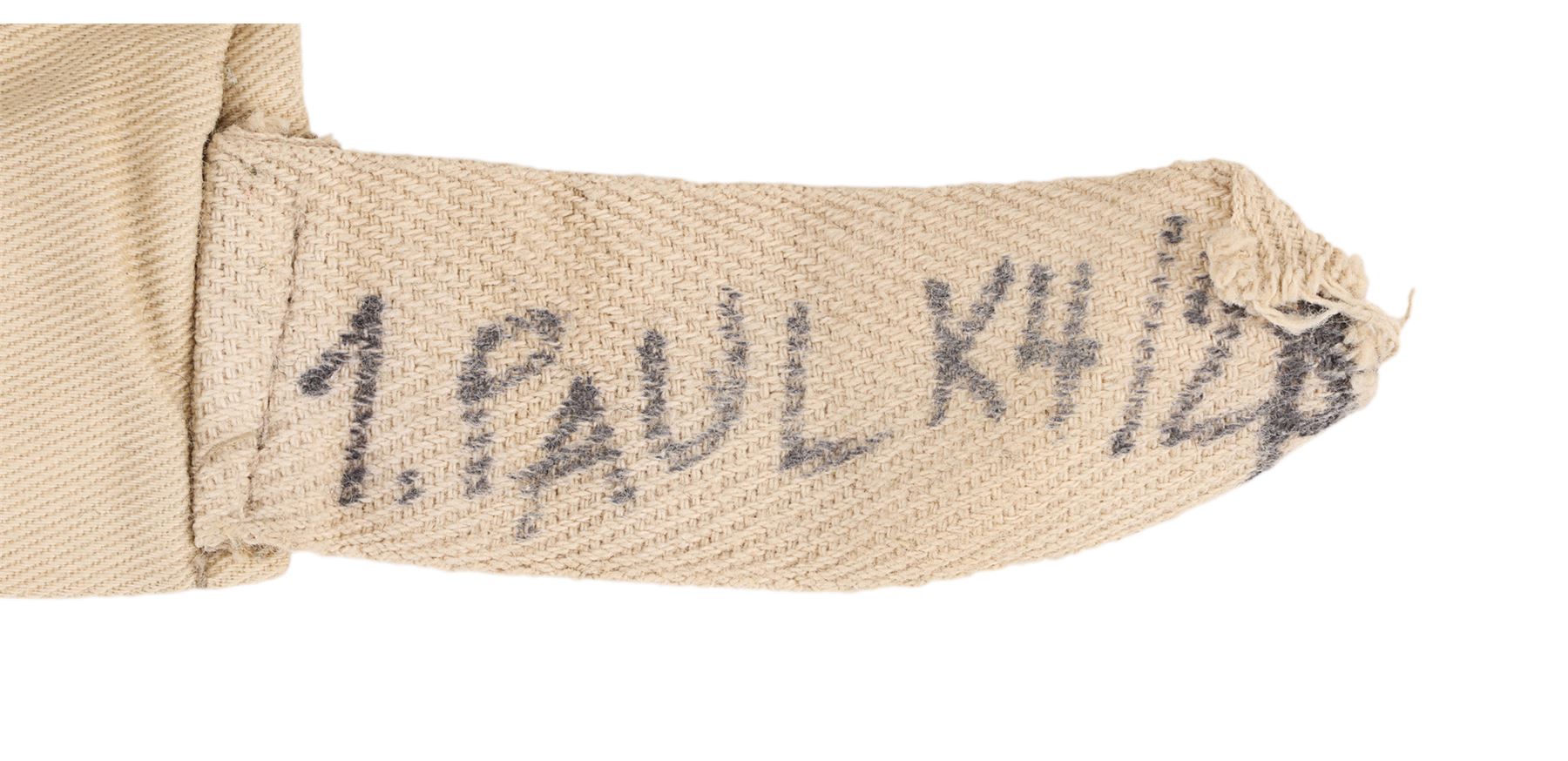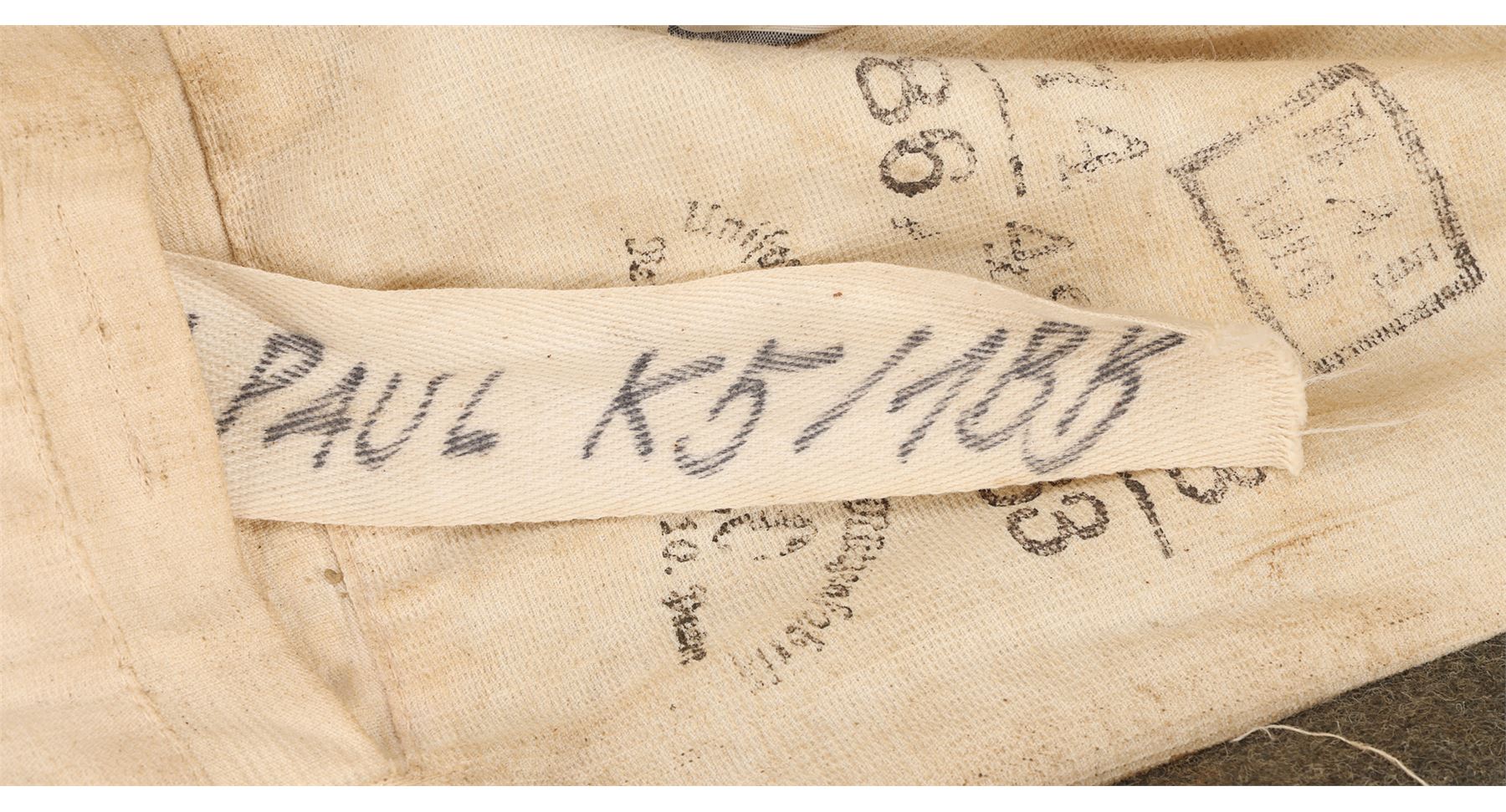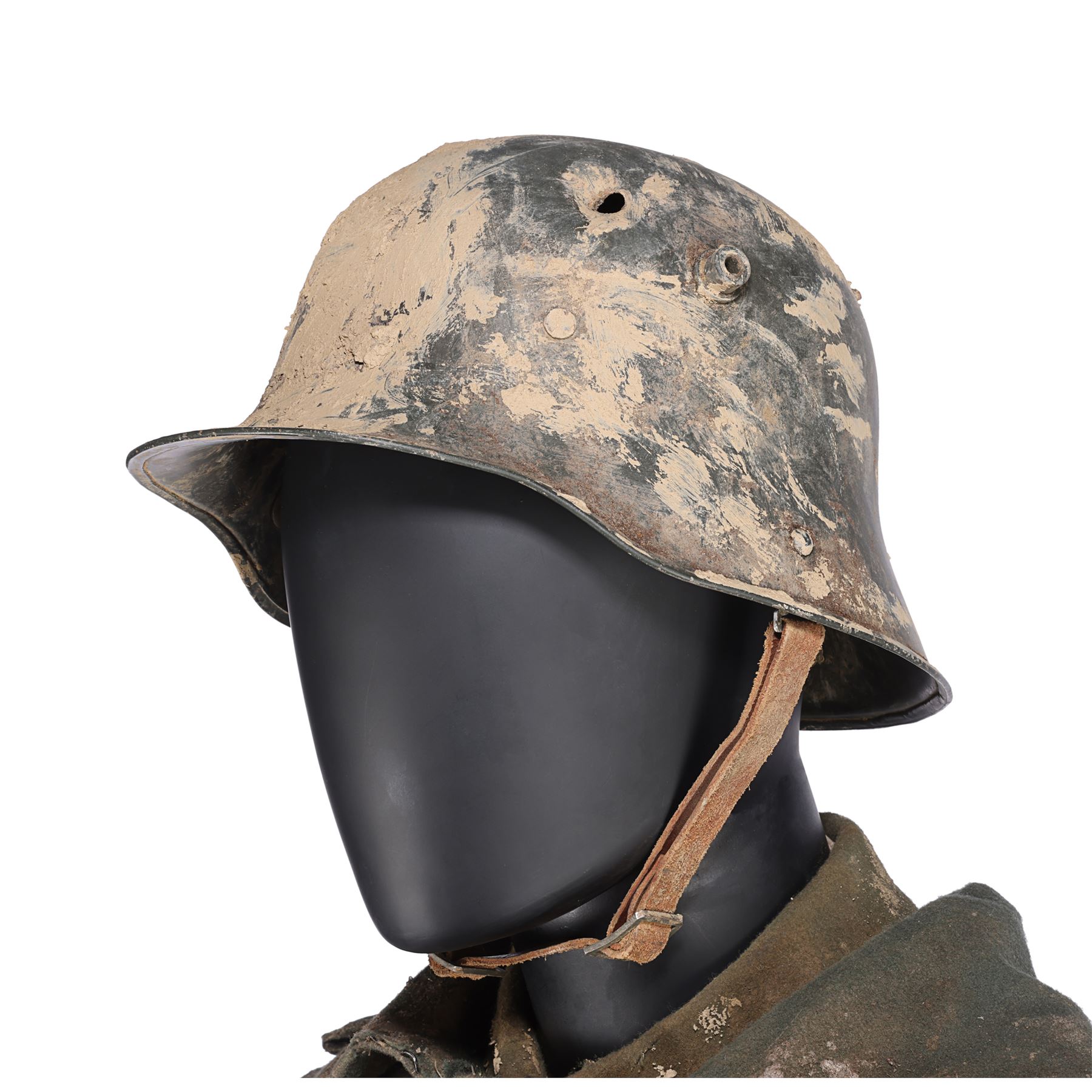 The costume consists of a long coat (labelled "1 Paul K5/1BB"); a jacket (labelled "1 Paul"); a shirt (labelled "48"); a steel helmet (labelled "#1 ST 3"); a pair of trousers; a pair of boots; a leather utility belt with a spade, water bottle and multiple pouches; and a metal gas mask canister with a shoulder strap. All the items have been intentionally heavily distressed and are caked with dried mud.