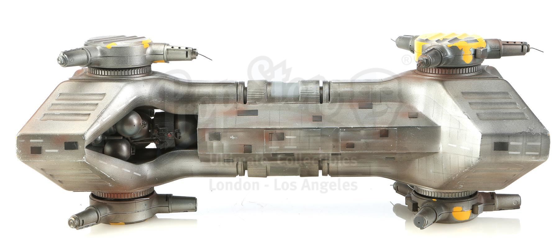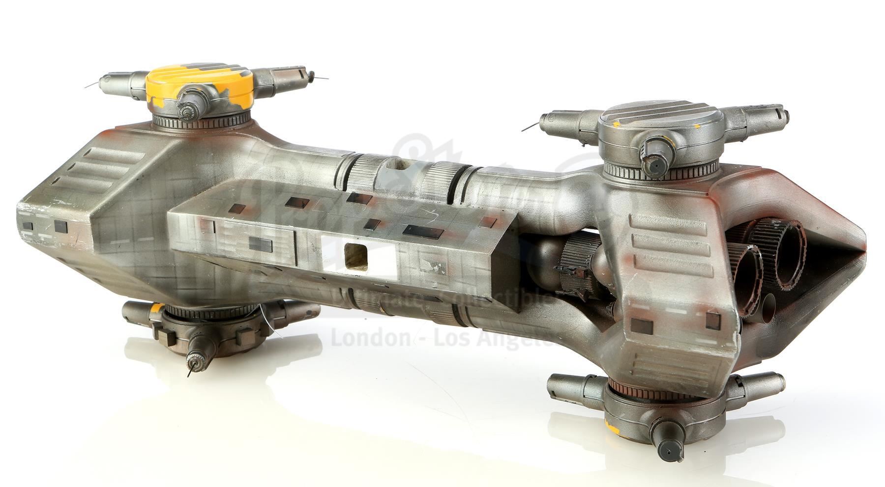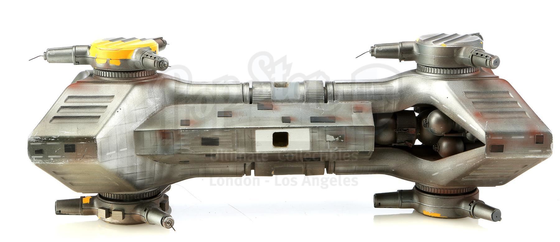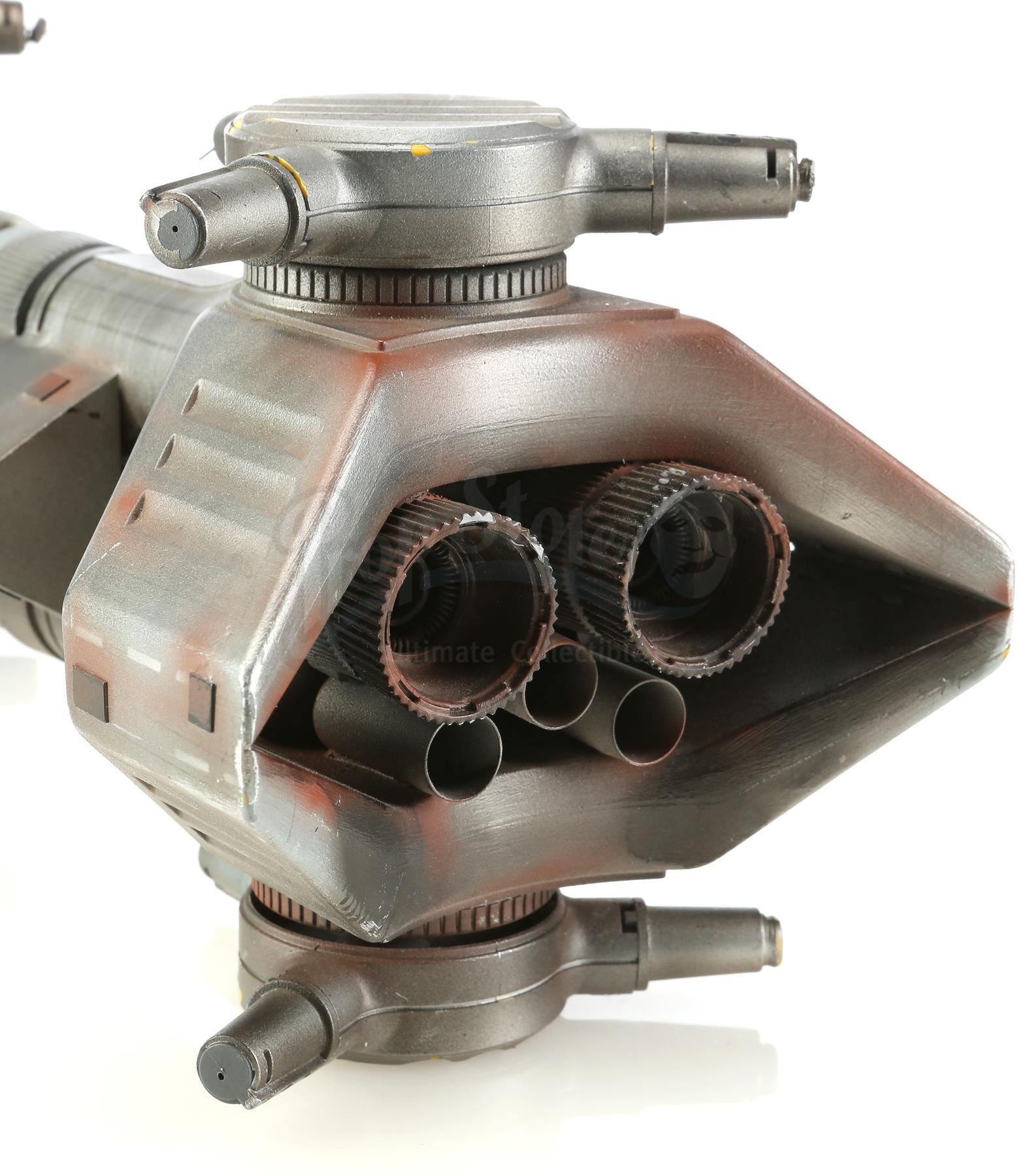 A Cyber-Warship miniature model from Season 25's third serial adventure "Silver Nemesis" of the BBC sci-fi series Doctor Who. Celebrating the 25th anniversary of the series, the serial featured several of the Doctor's (Sylvester McCoy) most infamous enemies, including the Cybermen, who surrounded Earth with their fleet of Cyber-Warships.