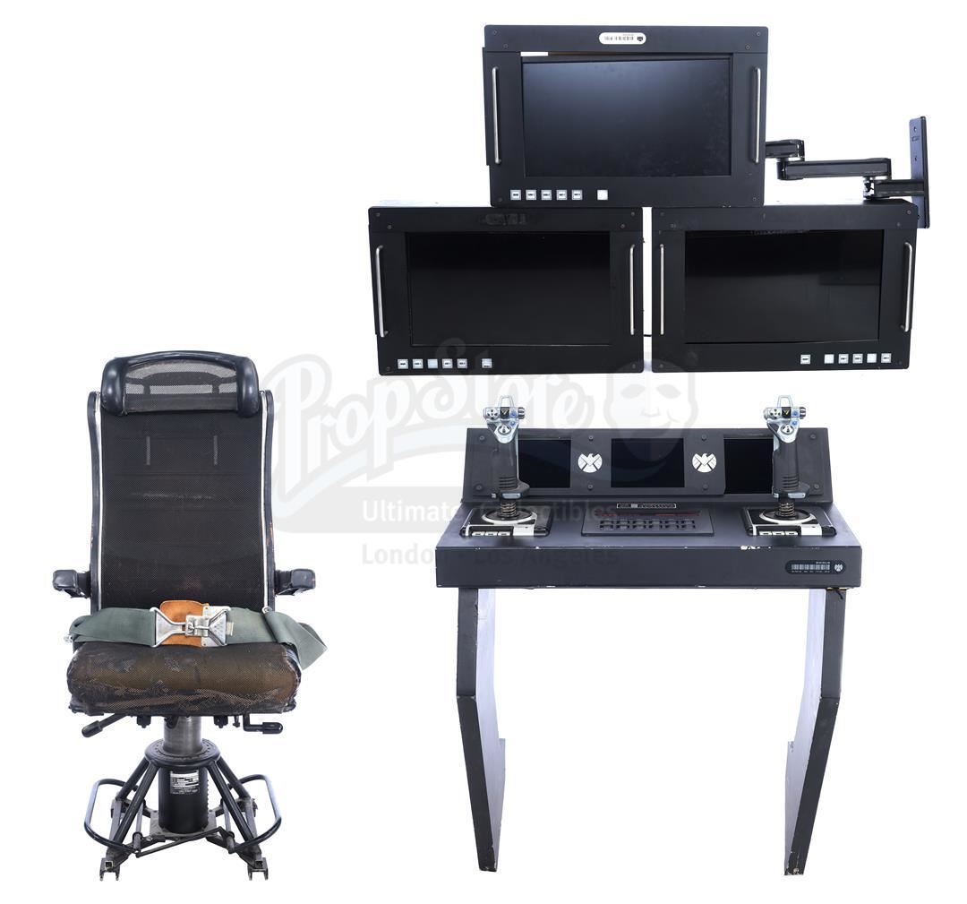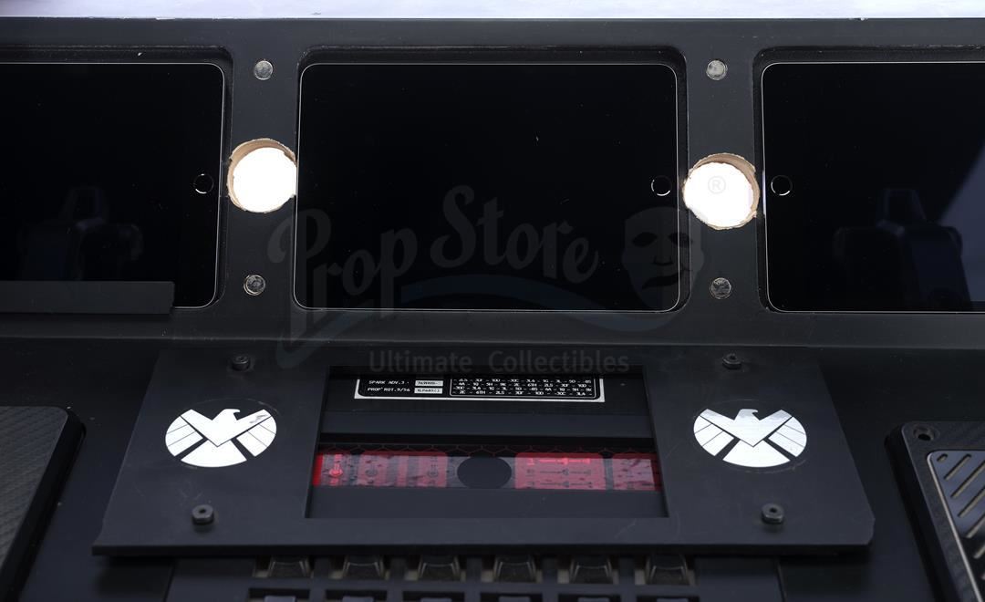 Zephyr One's control panel with a chair and monitors from Seasons 3 through 7 of Marvel's Agents of S.H.I.E.L.D. The agents fly their new central command plane through space and time throughout the seasons after their previous aircraft, The Bus, was destroyed. This lot consists of a black wood and particle board-paneled control panel lined with three glass screens and urethane buttons, and affixed with two joysticks and S.H.I.E.L.D. logo stickers, a padded flight chair with a leather and nylon belt, nylon mesh backing, and a steel mounting base, and three wood-paneled flatscreen monitors with urethane and rubber remote controls, S.H.I.E.L.D. stickers, a mobile steel wall mount, and loose wiring throughout. The lot is in fair overall condition with visible stains, torn wiring, and chipped wood throughout from production. This item contains electronic and mechanical components. While every effort is made to describe them accurately, no guarantee or warranty is made as to the functionality, lifespan or safety of those components. It is entirely incumbent on the new owner to satisfy themselves as to their safe use and maintenance. This is an oversized lot that requires special shipping. Dimensions (assembled): 40" x 40" x 36" (101.5 cm x 101.5 cm x 91.5 cm)