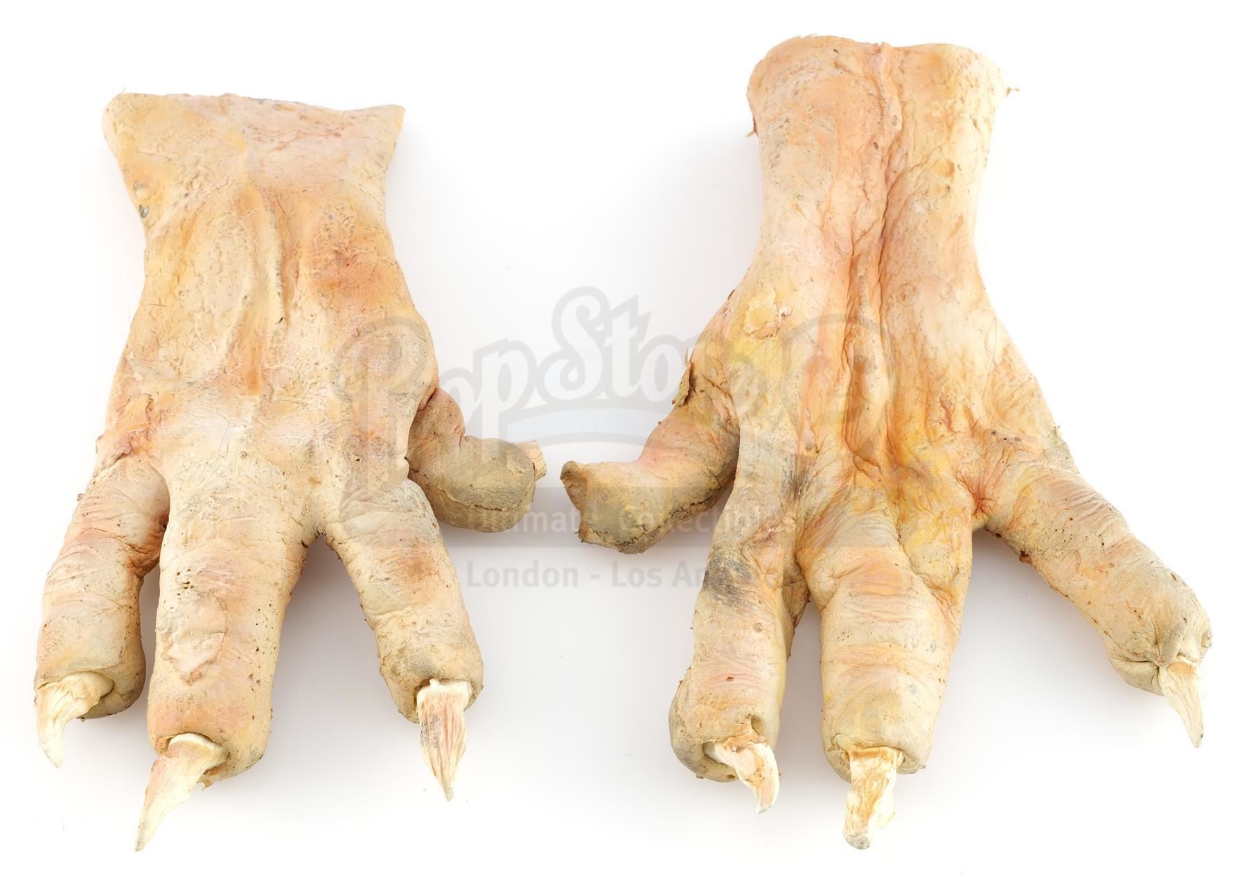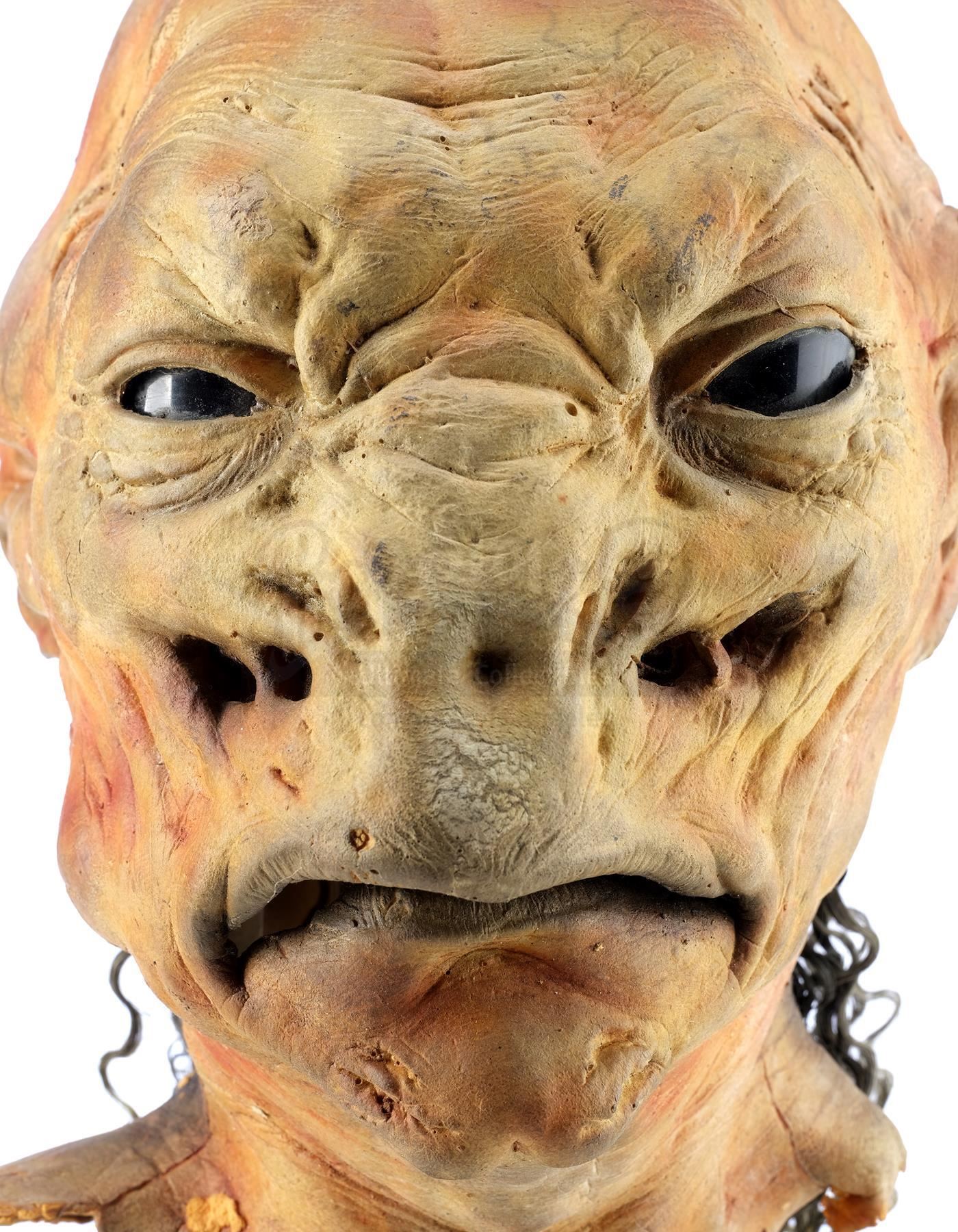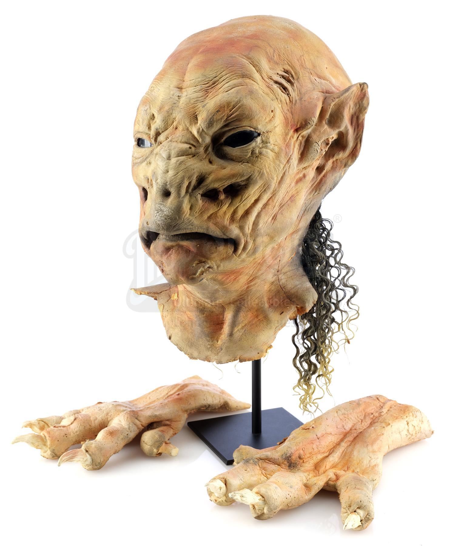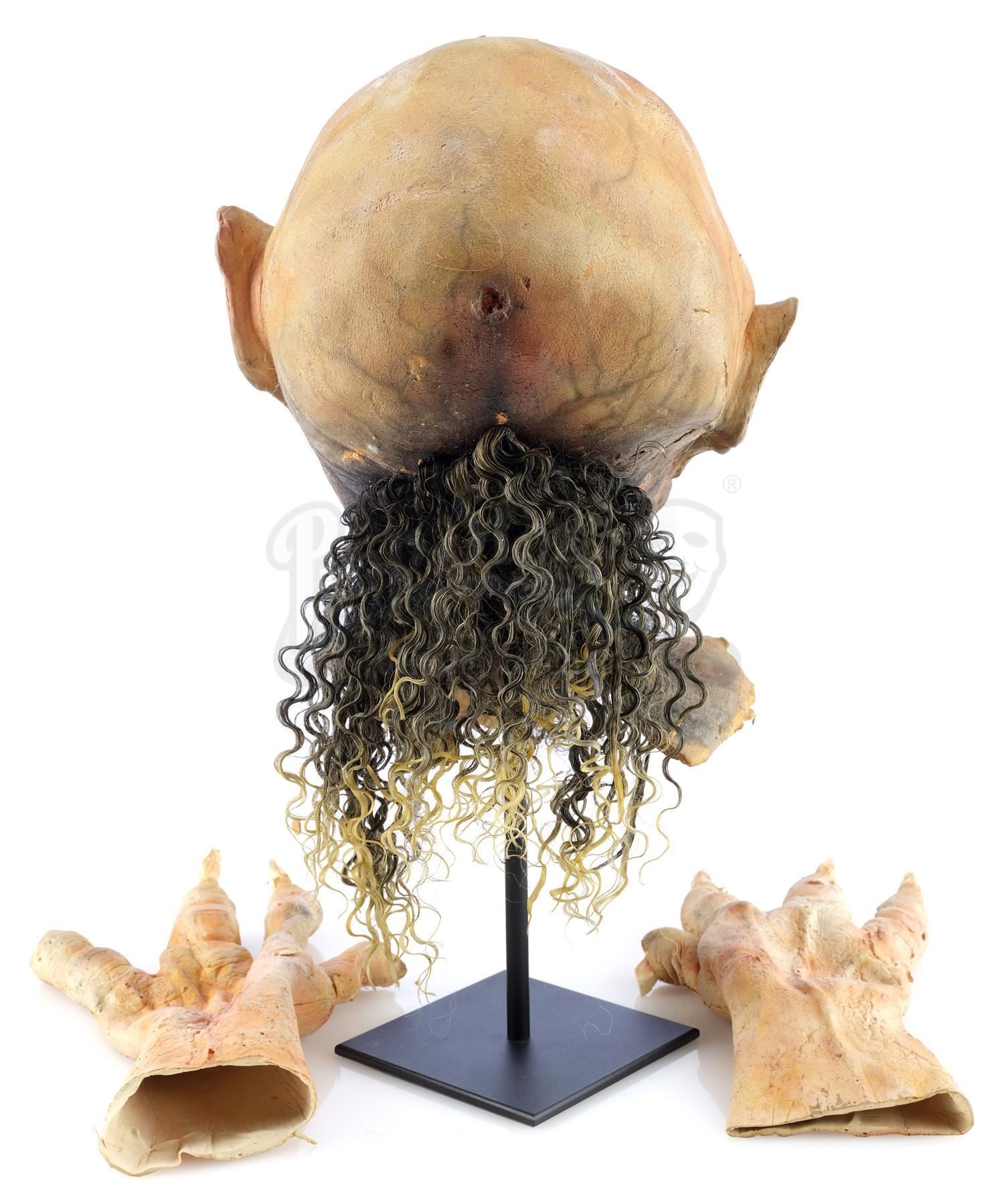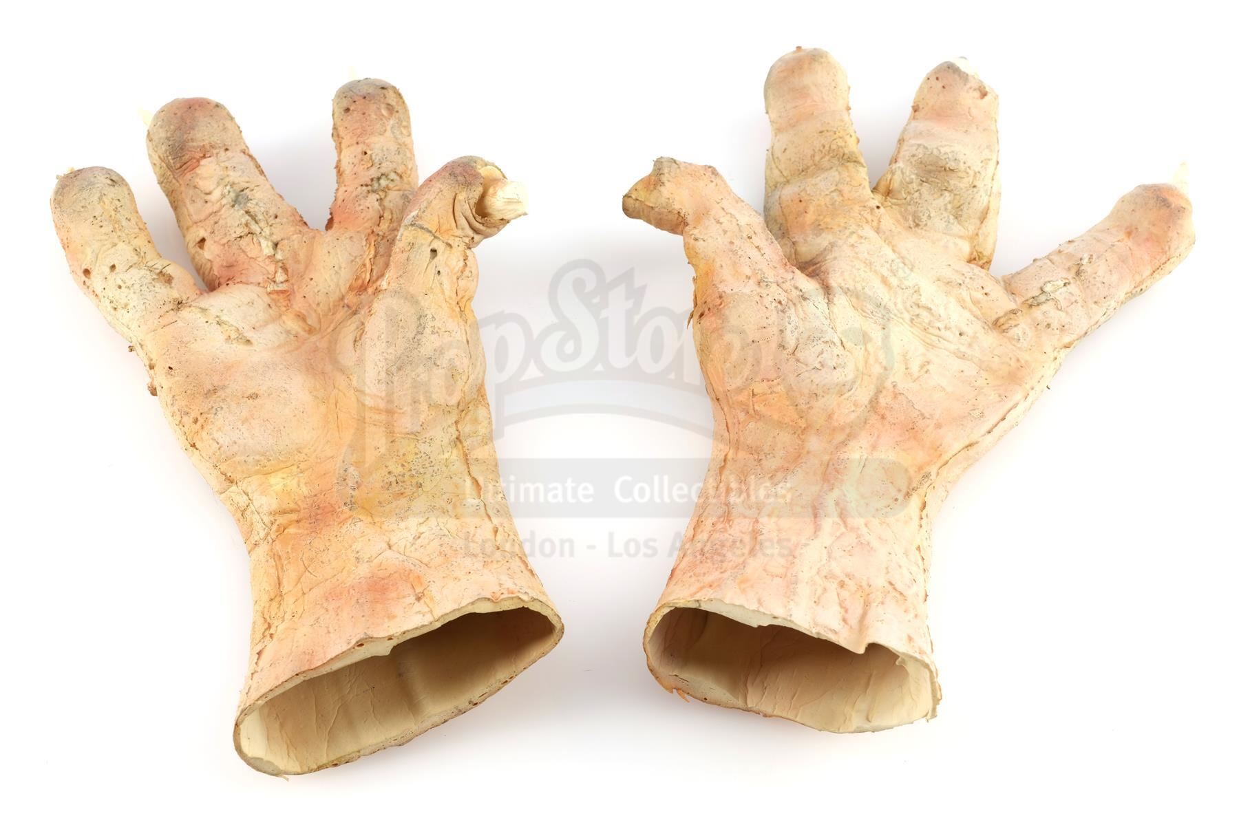 This lot consists of a hand-painted red, yellow, and black padded foam rubber and fiberglass mask with tinted urethane eyes, curly faux hair, and a Velcro closure, as well as a pair of textured foam rubber gloves inset with resin fingernails.