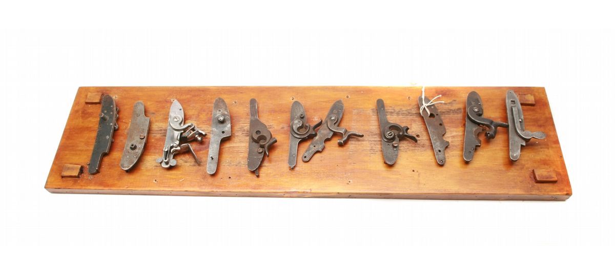 11 Asst'd vintage lockplates mounted on Hardwood board - includes: one side hammer percussion plate, one unmarked percussion conversion plate, one Shapleigh lefthand plate with crisp engraving, one unmarked Spanish modern plate, one Shapleigh right hand percussion plate with good engraving, one vintage plate with faint markings, three unmarked plates with hammers missing & one unmarked Flintlock plate - non-ffl - 25JJKTN136