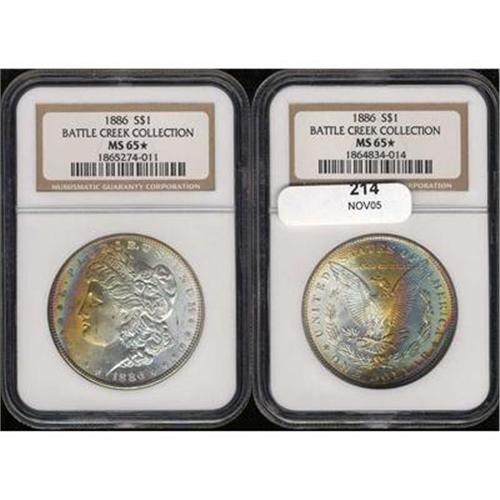 Lot of Two Toned Battle Creek Morgans.. Obverse toned 1886 NGC MS65* & Reverse toned 1886 NGC MS65*.<p><i>from The Battle Creek Collection, Part III</i>