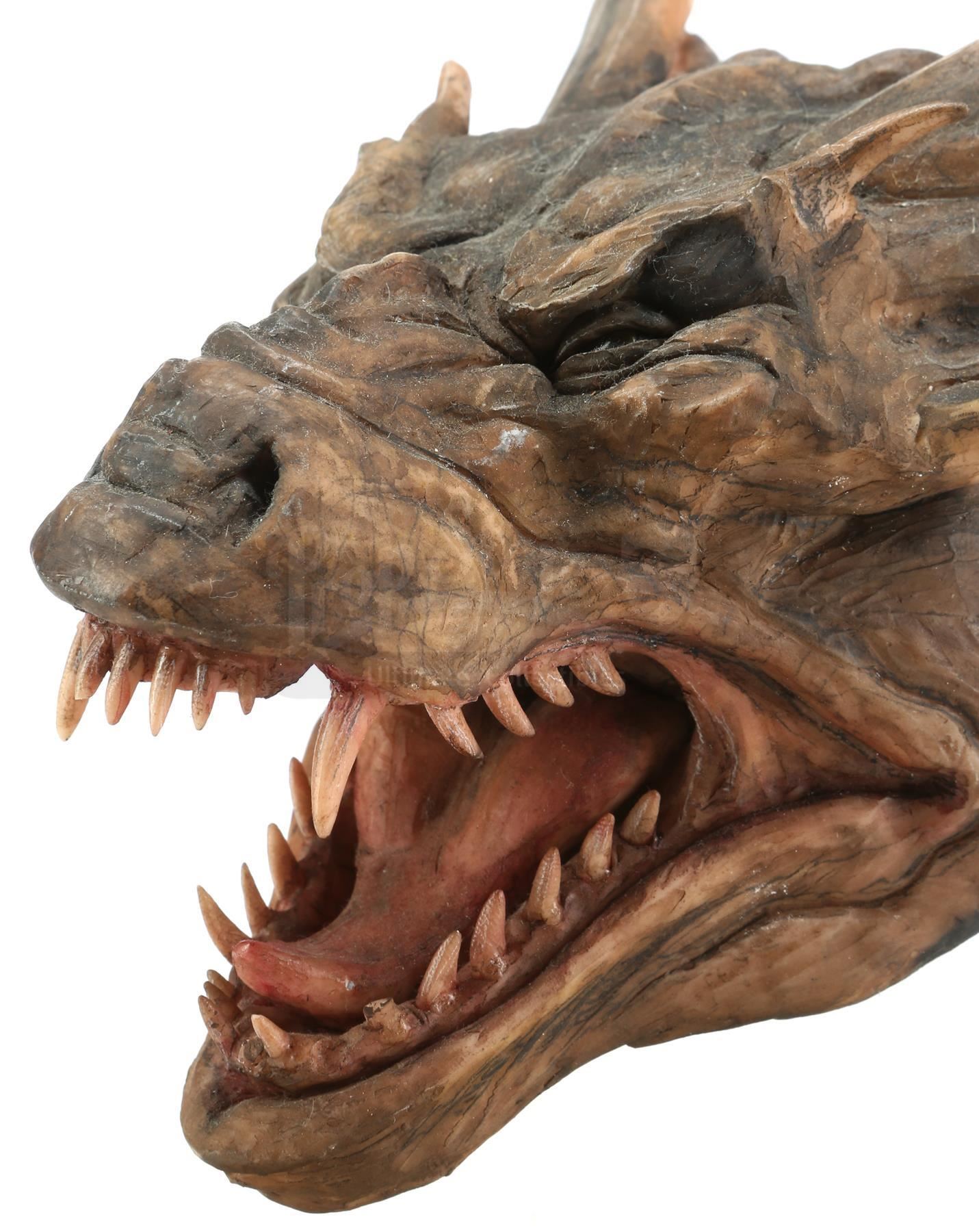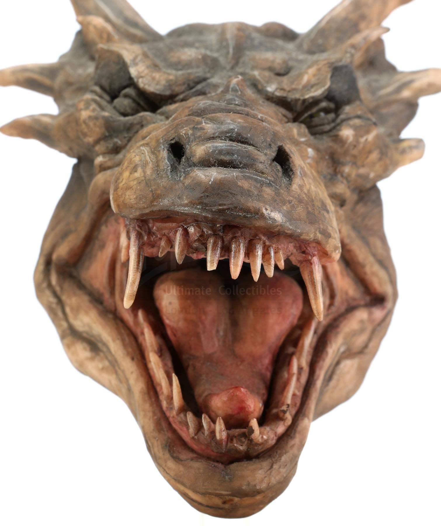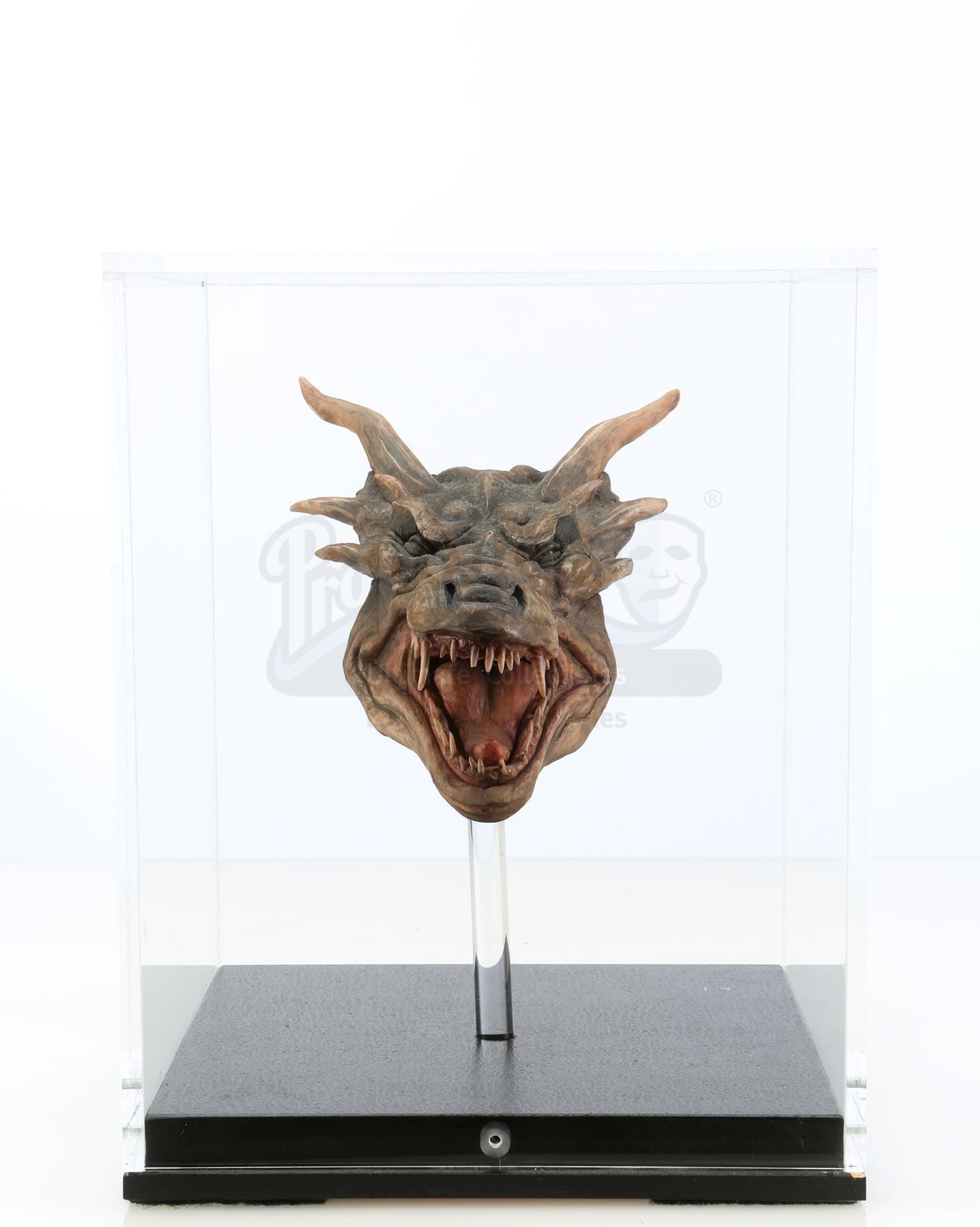 The detailed maquette is created from sculpting compound over a metal wire inner frame and depicts Draco mid-snarl with his mouth open and teeth bared. It is painted mostly in shades of brown with tan-white teeth and a pink tongue and gums. The head maquette is mounted on a clear acrylic column on a black-painted wooden base with a clear acrylic cover screwed into place. The lot is in excellent overall condition with minimal wear from production and age, including minor scratches to the acrylic cover. Includes a letter of authenticity from Phil Tippett.