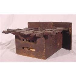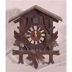 Black Forest Coo Coo Clock, Ca. 1910; Measuring an impressive 15"h x 12"w x 6"d; this old clock has a heavily carved face. It is missing the little hand, the bellows is broken and the back is replaced. It is worthy of restoration. Ca. 1910. Est. $40 - $60.
