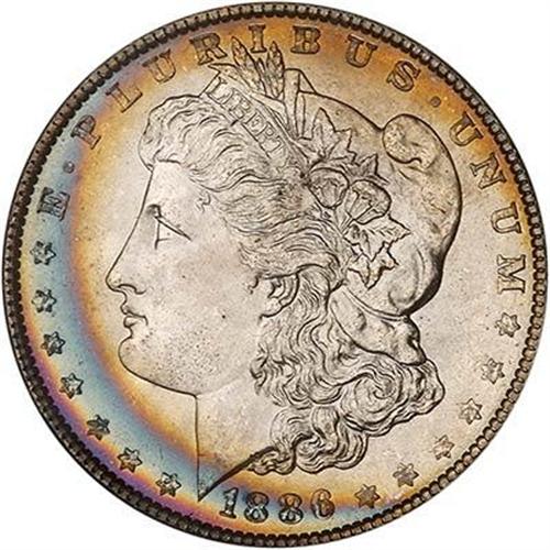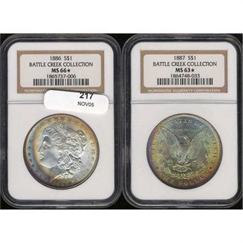 Lot of Two Toned Battle Creek Morgans.. Obverse toned 1886 NGC MS66* & Reverse toned 1887 NGC MS63*.<p><i>from The Battle Creek Collection, Part III</i>