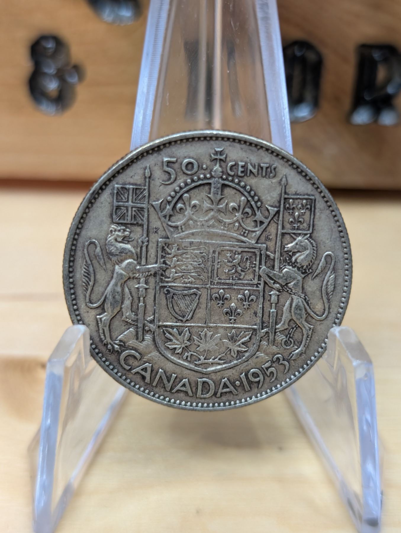 The 1953 Canadian Silver 50-cent coin is made of 80% silver and 20% copper, with a weight of 11.6 grams. It features the effigy of Queen Elizabeth II on the obverse, marking the first year of her reign. The reverse displays the iconic Canadian coat of arms, which includes a lion and a unicorn. This coin is popular among collectors due to its historical significance, the start of Queen Elizabeth II's reign, and its silver content.