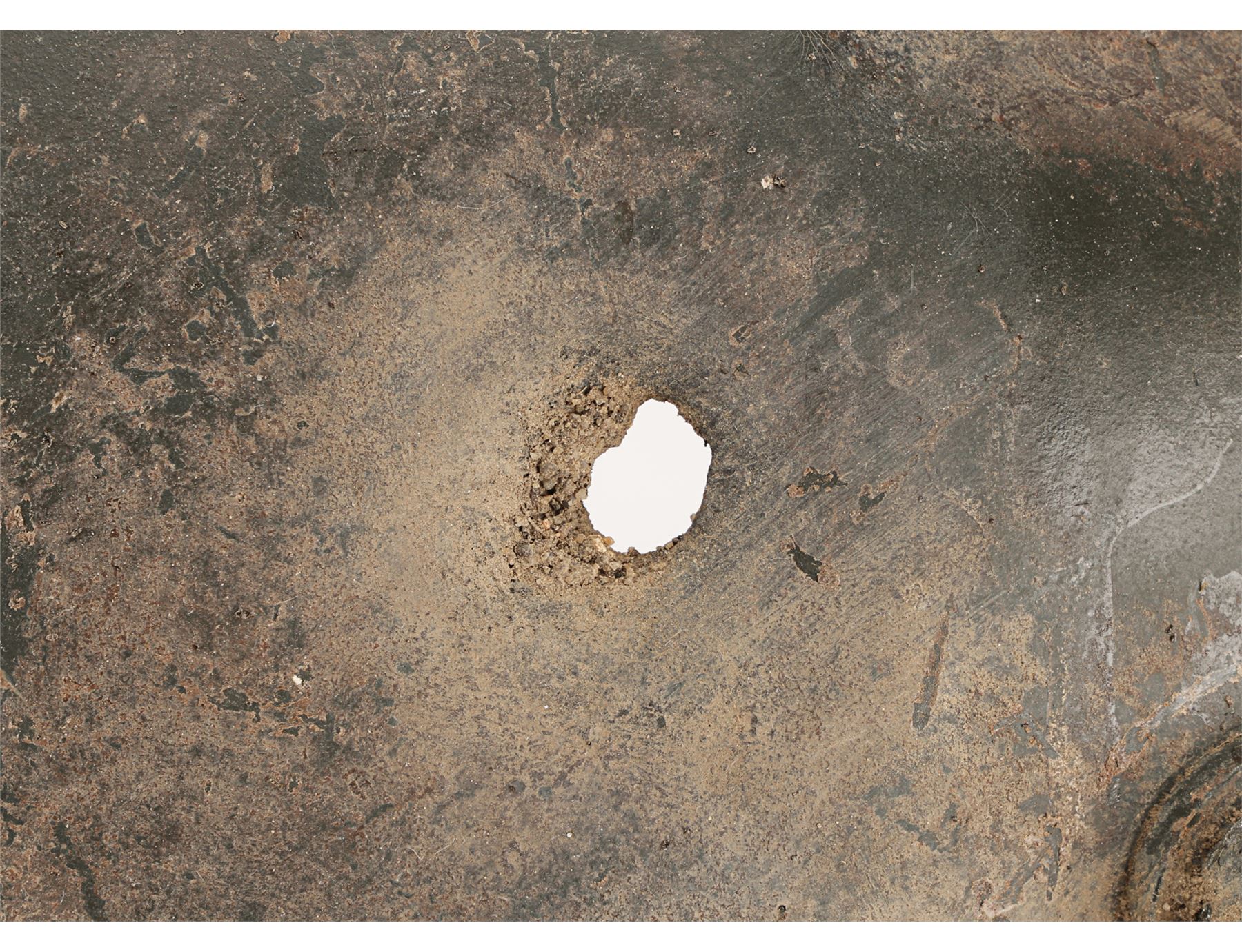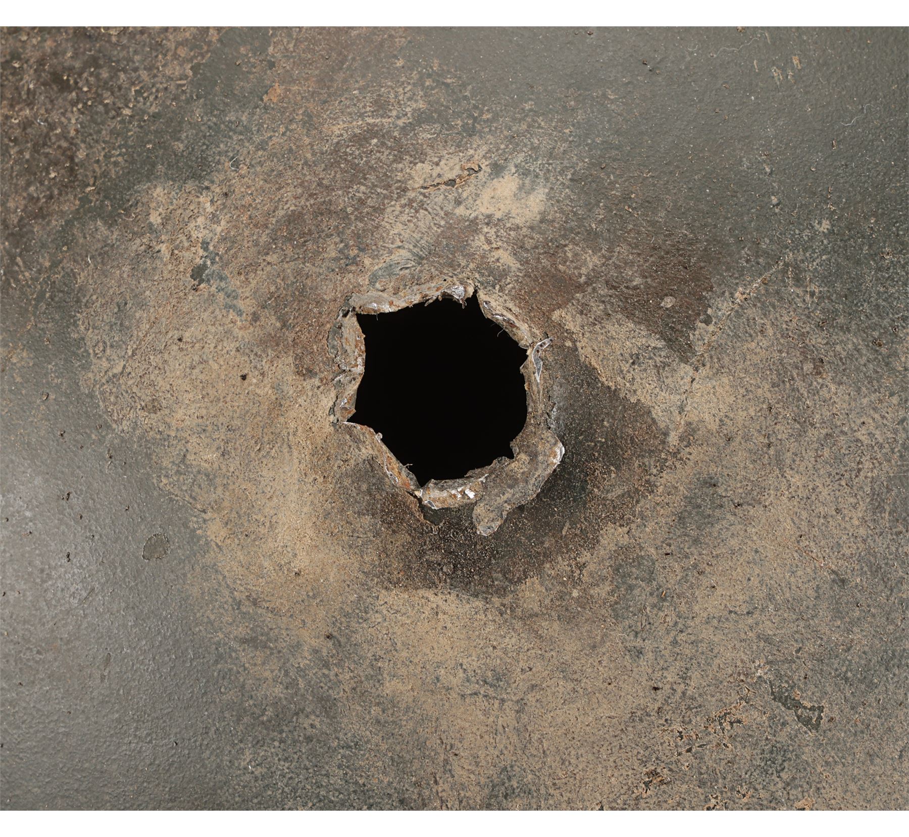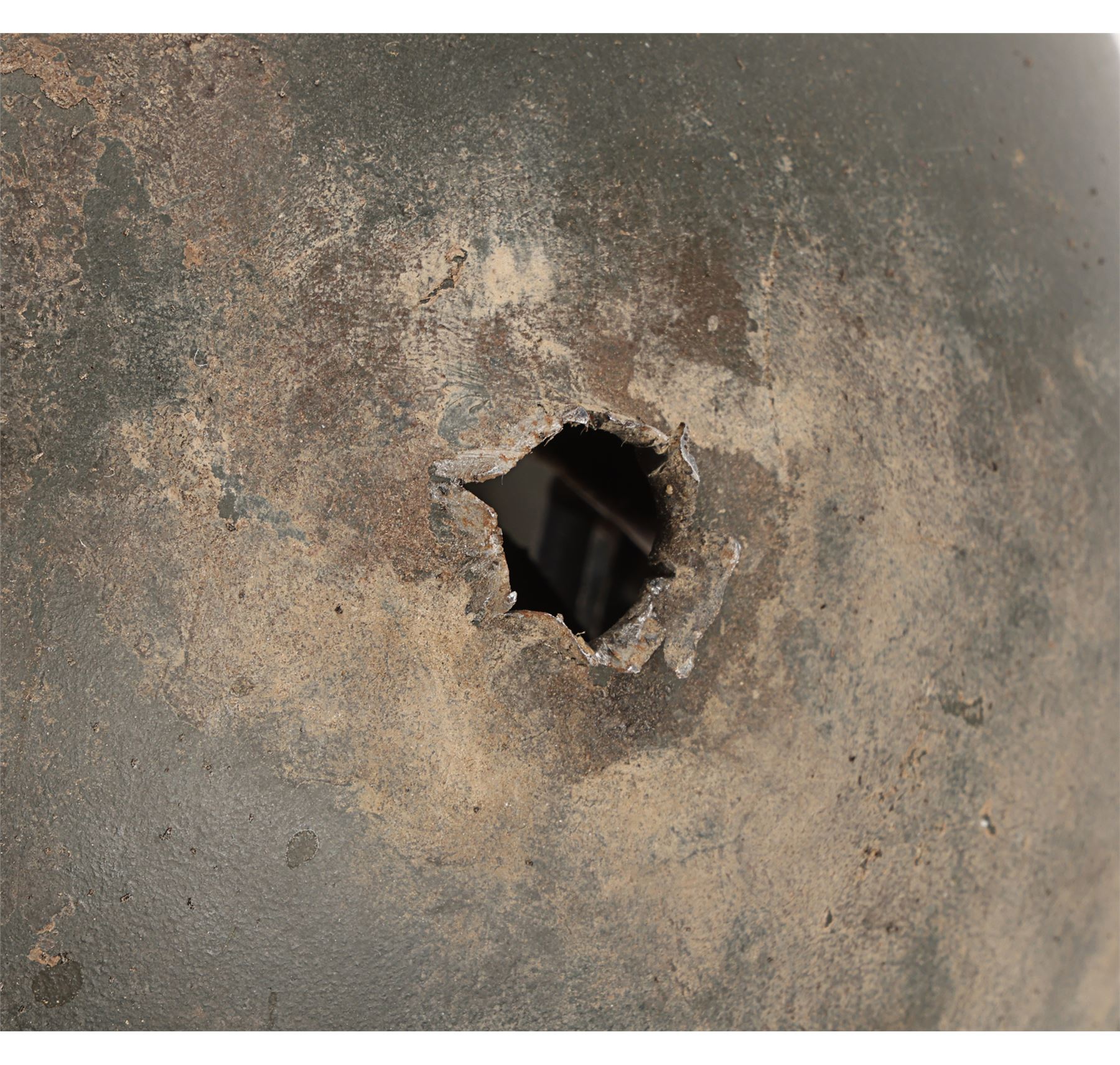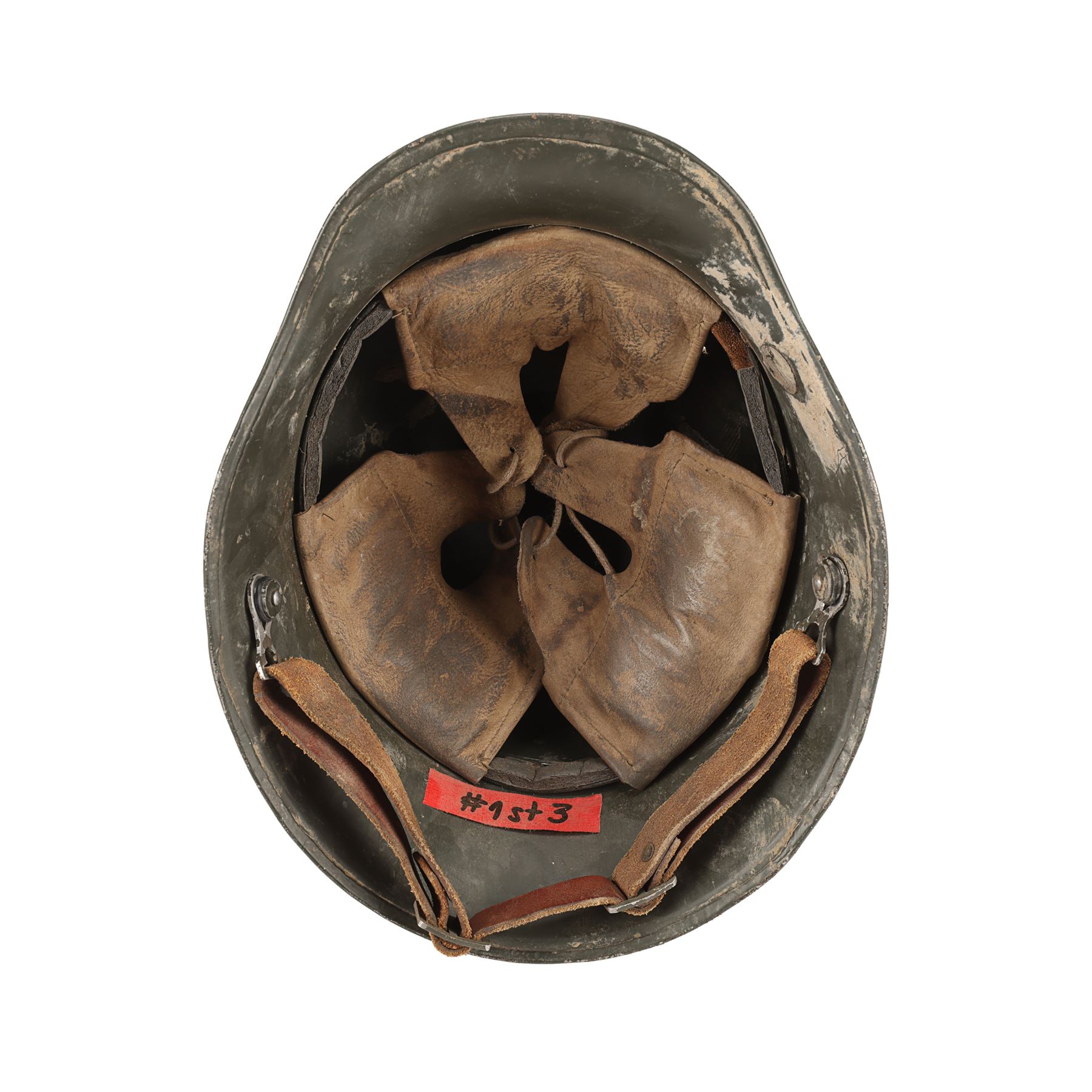 The green steel helmet features dents and bullet holes, as well as mud all over. It has a padded interior, a leather chin strap, and "#1 ST 3" handwritten on tape at the back. Dimensions: 30.5 cm x 23.5 cm x 17 cm (12" x 9 1/4" x 6 3/4")