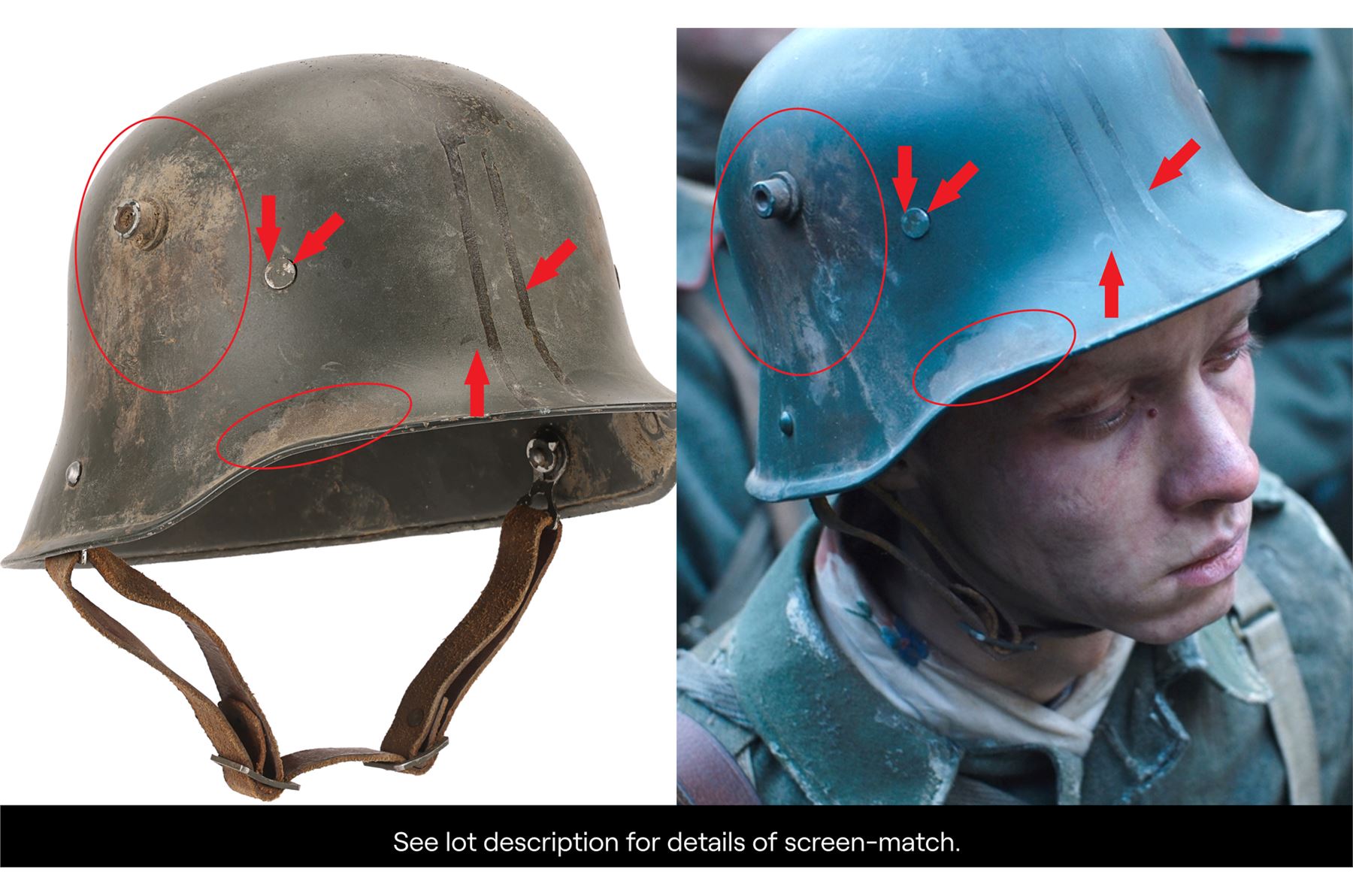 Paul B& auml;umer's (Felix Kammerer) screen-and photo-matched helmet from Edward Berger's World War I drama All Quiet on the Western Front. Berger's film was nominated for nine Academy Awards& reg;, winning four.