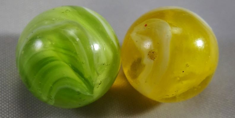 Lot of two marbles. Both are small electric slags. One yellow, one green. Very bright. Yellow is 9/16" and Mint (9.5). Green is 9/16" and Near Mint(+) (8.8).