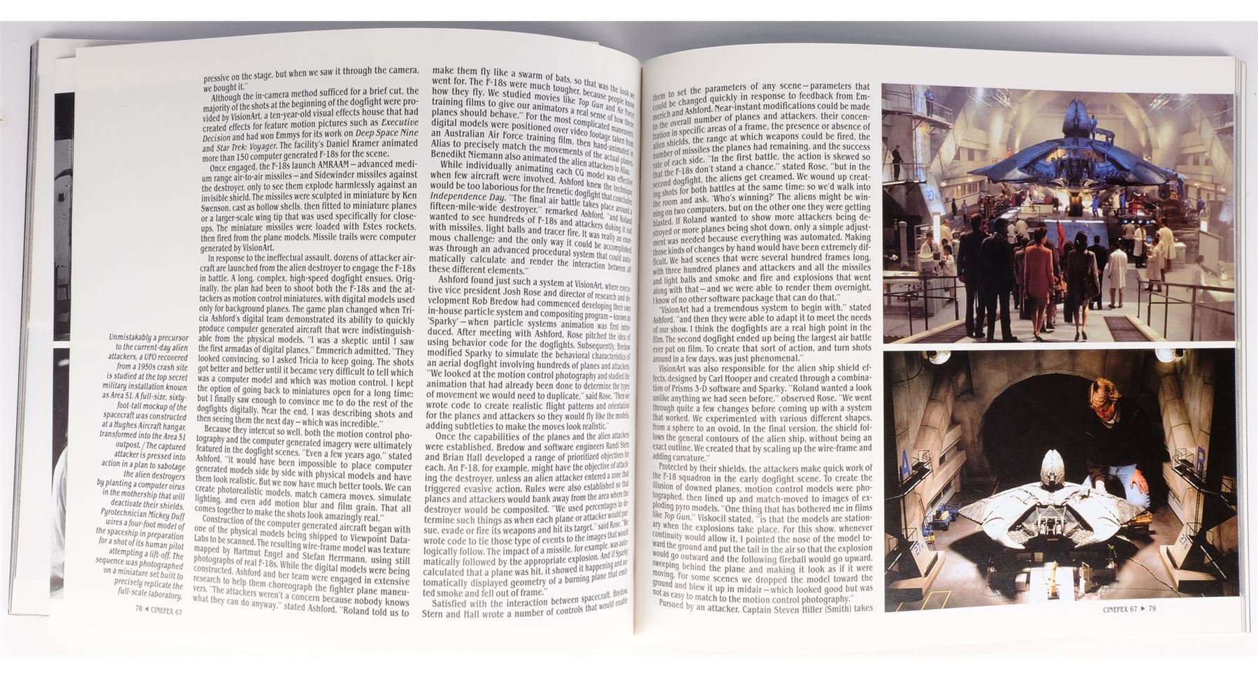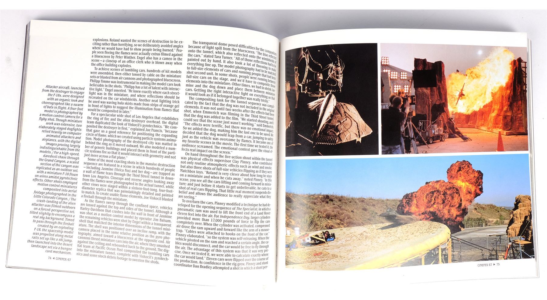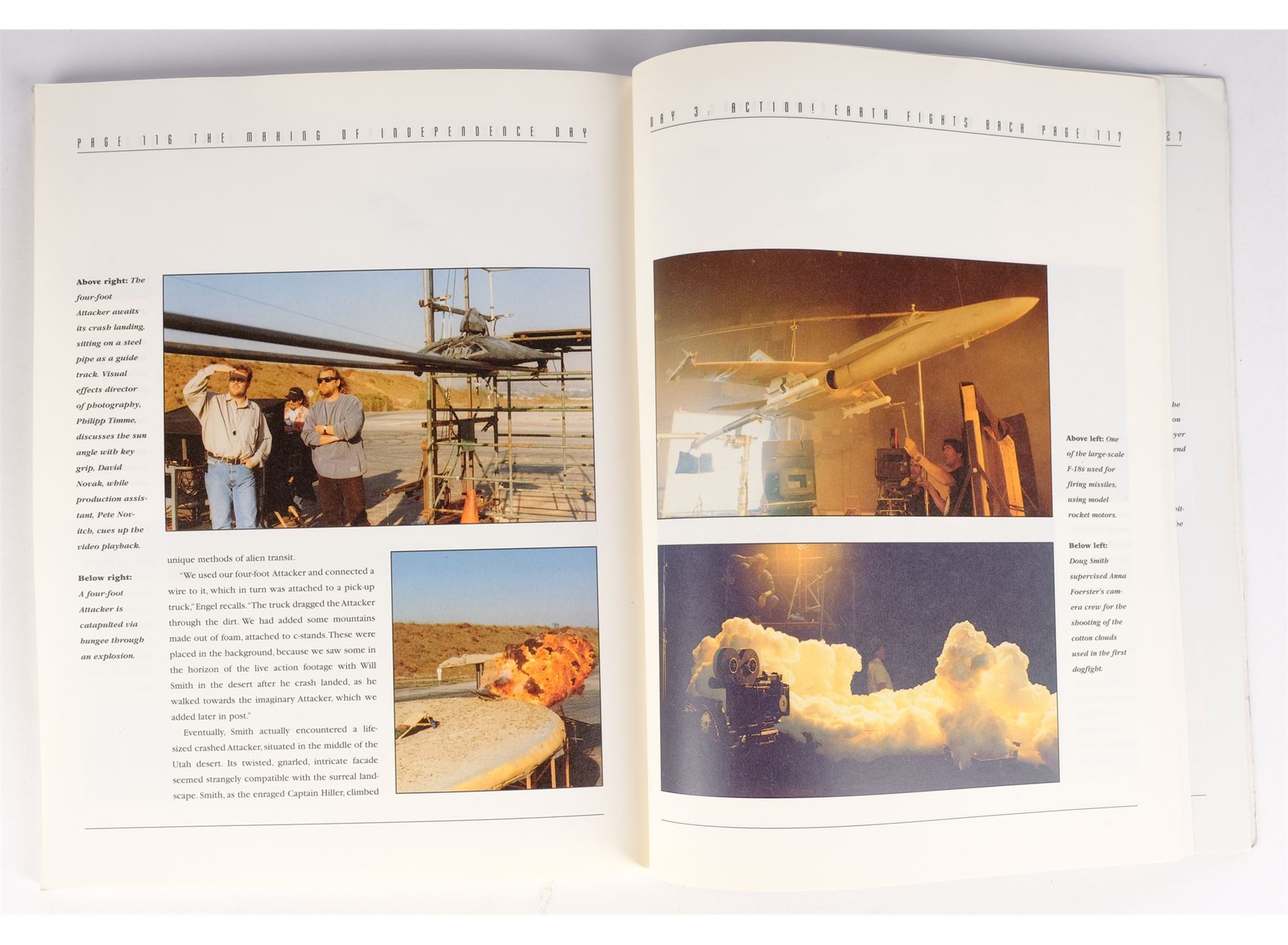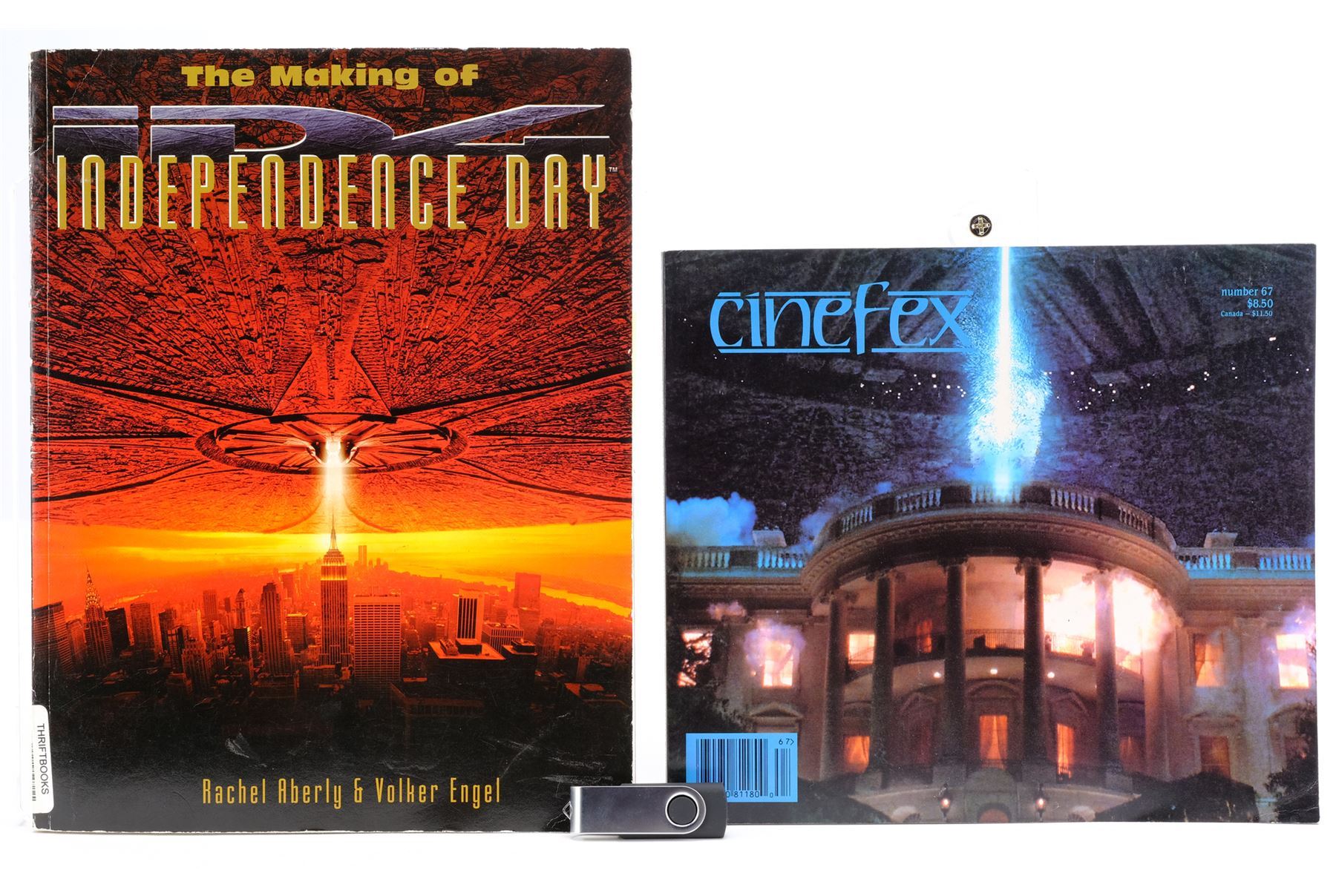 This lot consists of one Attacker model miniature, a bag of parts, and a magazine for "The Making of Independence Day." Constructed of fiberglass, resin, foam, vacuum-formed plastic components and other multimedia, the miniature features an intricate, multifaceted biomechanical technology-inspired design all over its chassis and was painted in shades of metallic gray, green, and blue. The underside of the spaceship's top was handmarked with the word "Clearance" in blue-black ink. Also included are two wire stands.