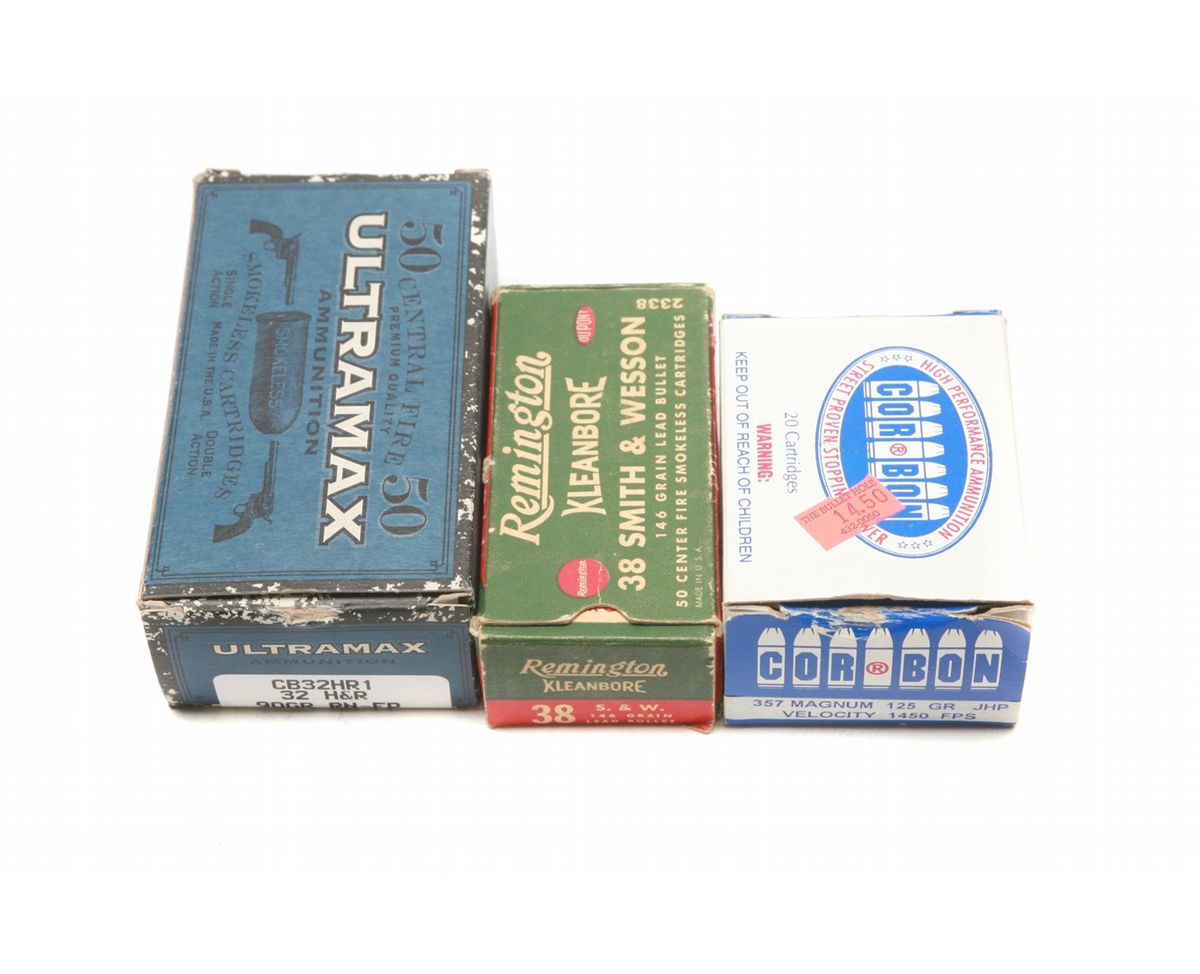 Approx. 140 rds of asst'd revolver ammo - one box (50rds) of Ultramax 32 H&R Mag 90 gr RNFP ammo - one box (20 rds) Corbon 357 Mag 125 gr JHP ammo - one box (20 rds) of vintage Remington Kleanbore 38 S&W 146 gr lead ammo - all in factory boxes - non-ffl - 25TAGKS009