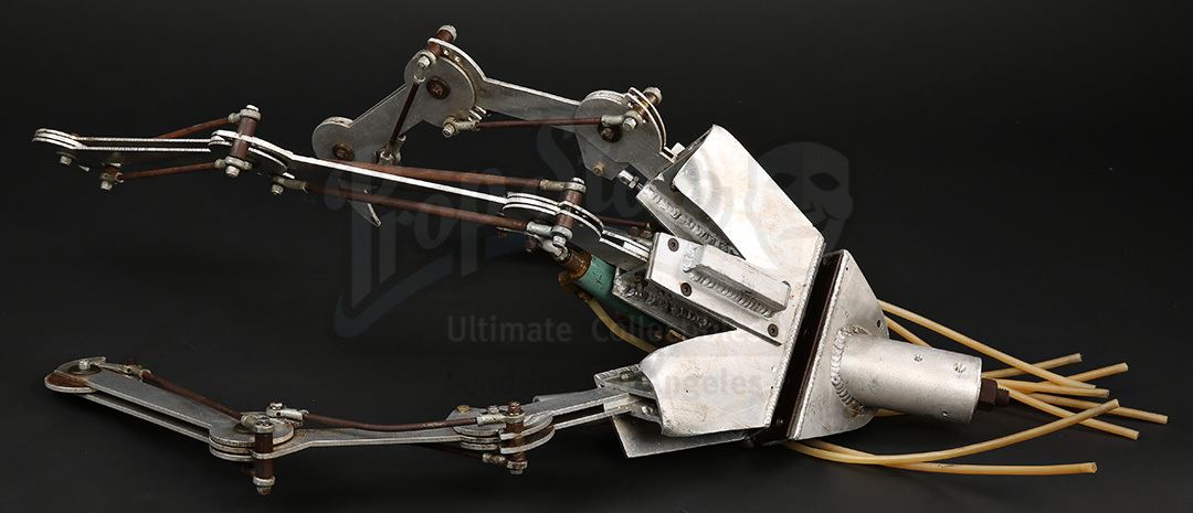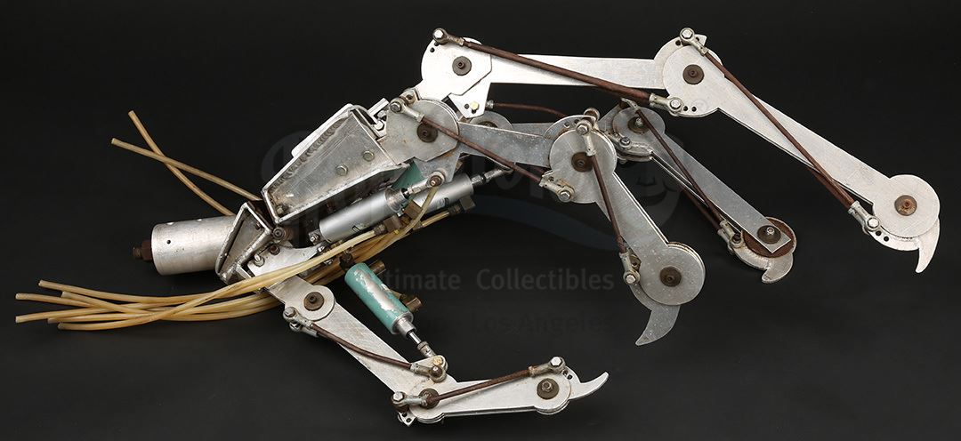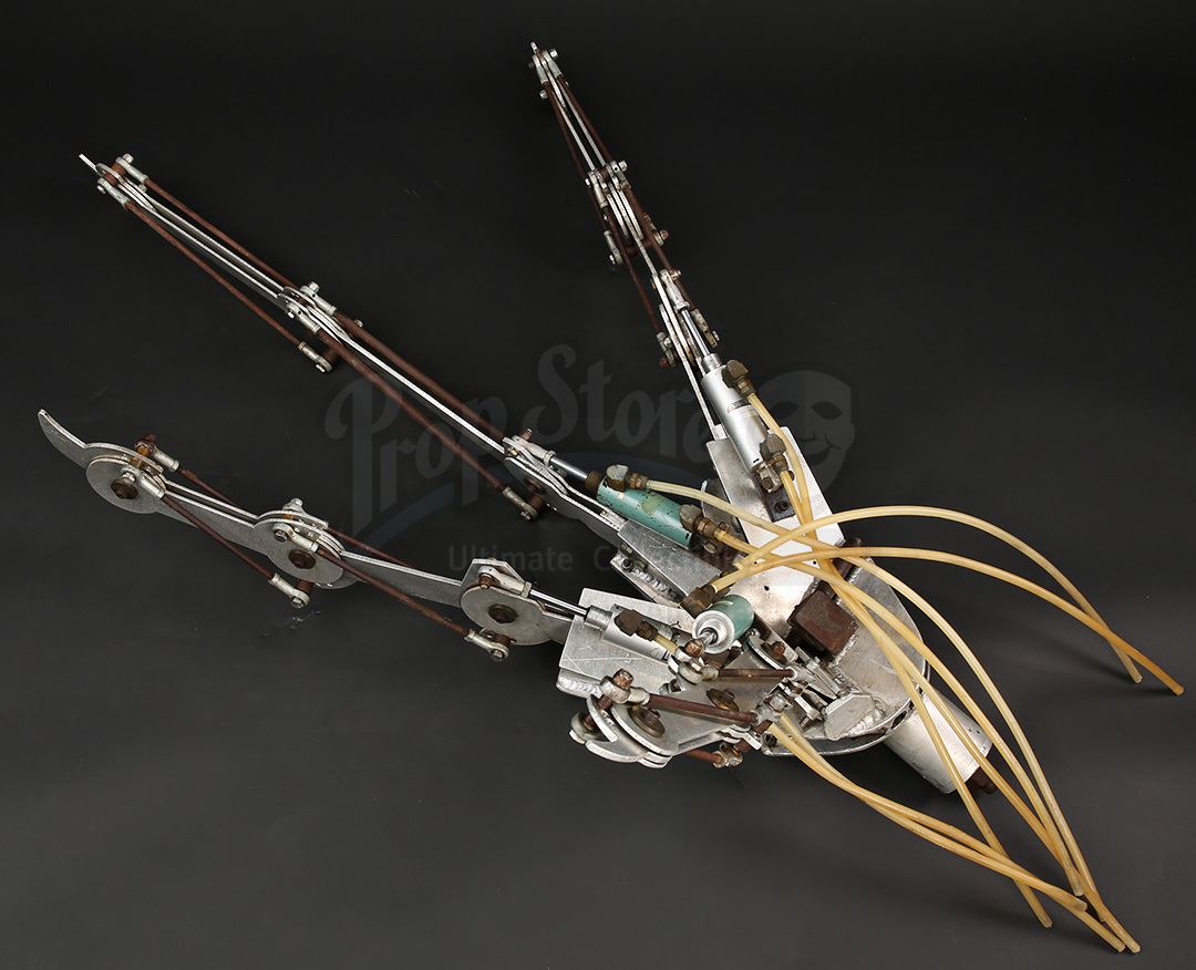 This hand was created and dressed with scales for SFX inserts in which the dragon is seen grabbing characters with its large claws. The hand is constructed primarily of hydraulic, jointed steel with various metal pistons and rubber tubing. It exhibits some wear from use during production and rusting from age, but remains in good overall condition.