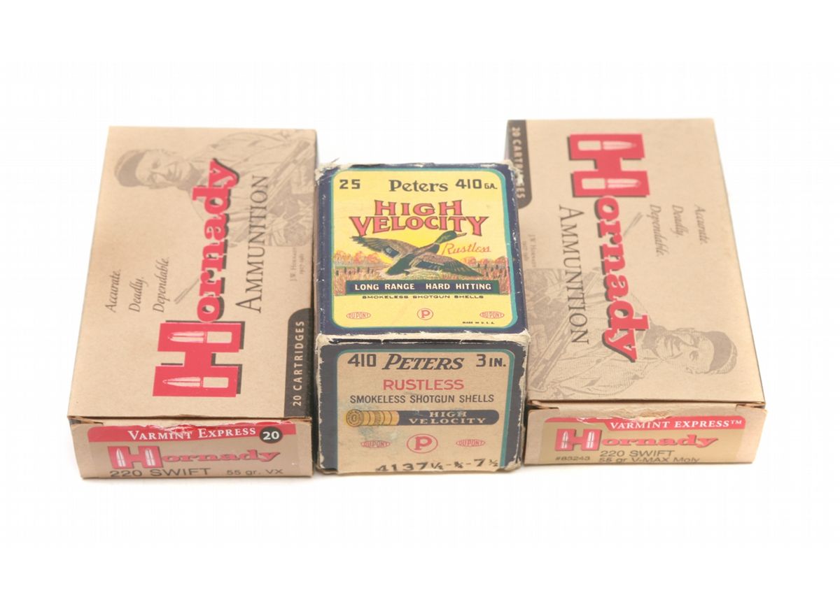 30 Rds of Hornady 220 Swift 55 gr V-Max Moly ammo & 10 rds of spent brass - one vintage box of Peters High Velocity 410 asst'd paper shells - worn factory box - non-ffl - 25TAGKS010