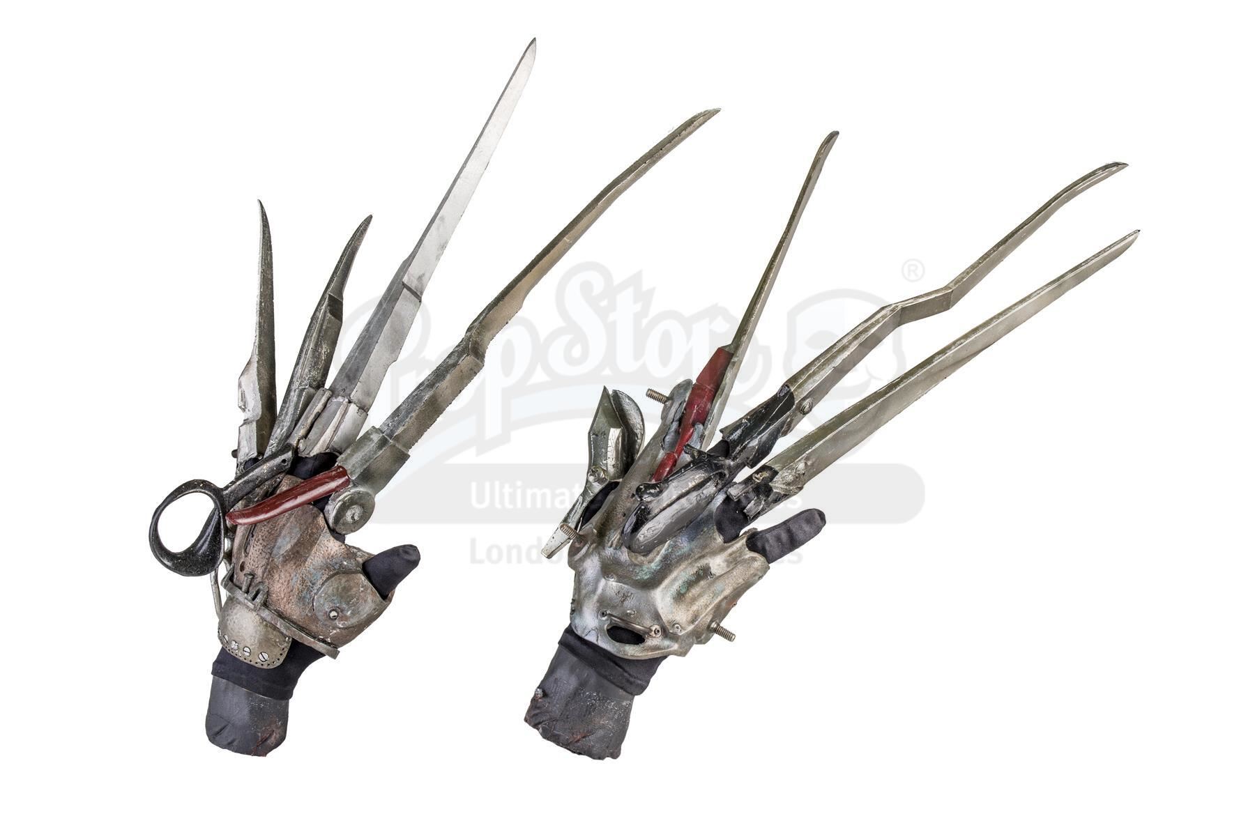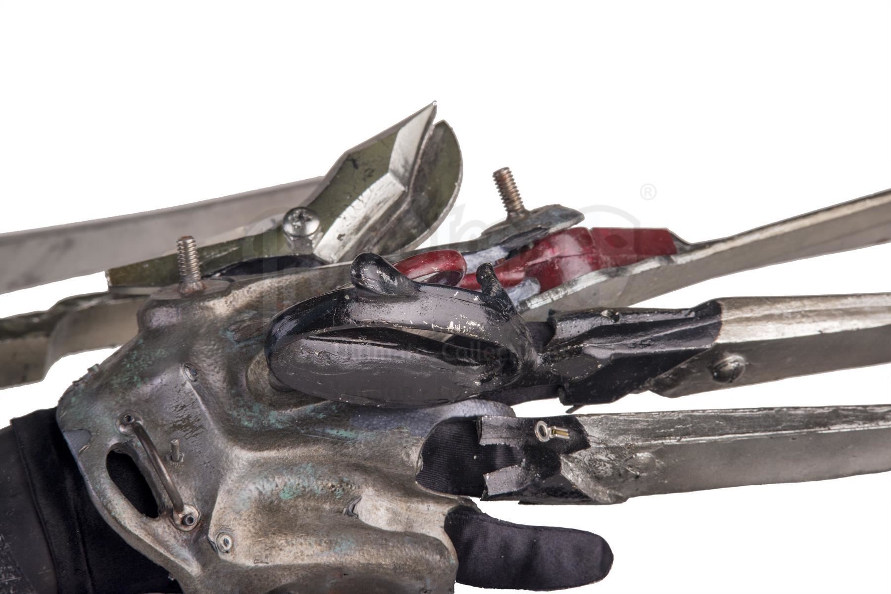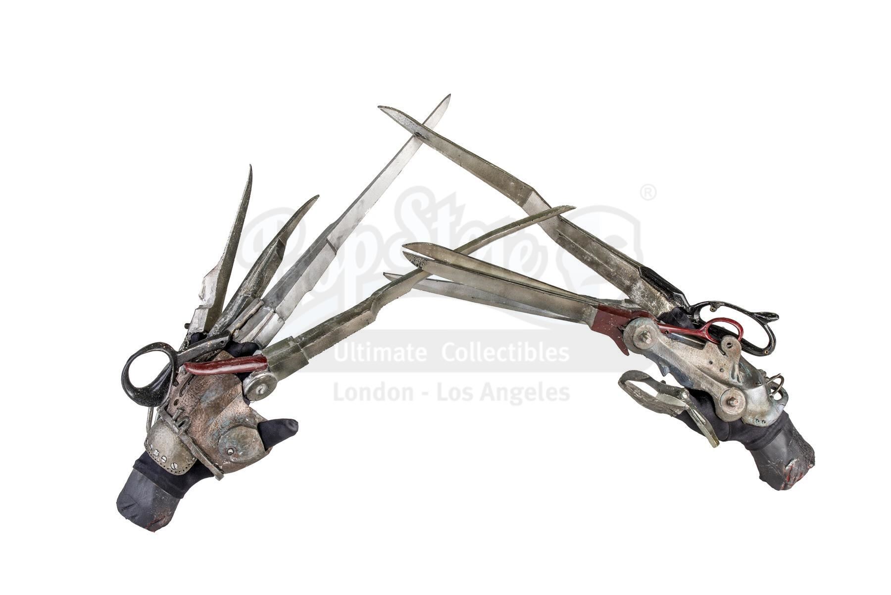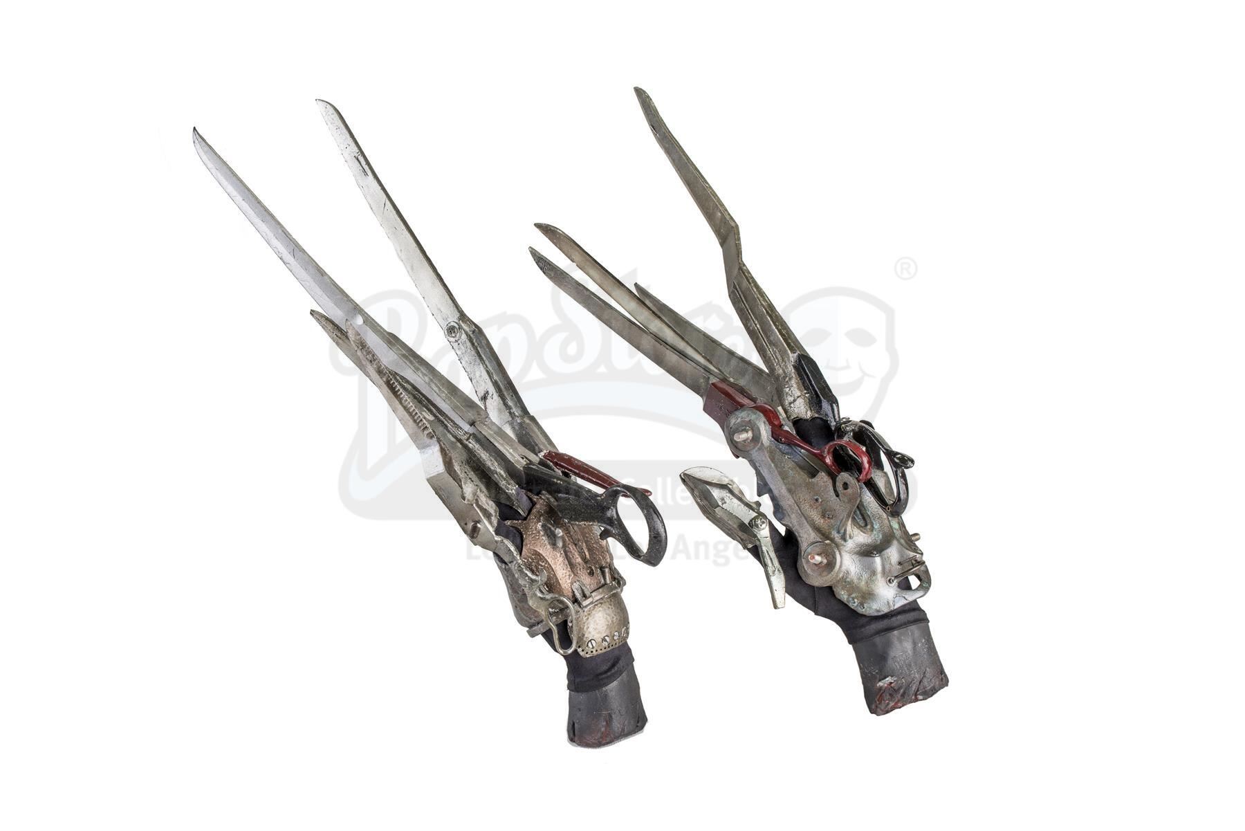 Edward Scissorhands' (Johnny Depp) scissorhands from Tim Burton's dark fantasy film Edward Scissorhands. Created by a visionary inventor (Vincent Price), young Edward Scissorhands was swept from isolation into suburbia where his odd personality and appearance became the talk of the town. One of a number of sets made for filming, this pair of scissorhands is comprised of backing plates, scissor blades and spandex gloves. A number of dressing components are missing, making the set incomplete, though the key blade elements are accounted for and present well. Each blade is made of urethane, for safety purposes, and was painted with metallic shades of silvertone and brown to depict used, rusted metal. Five of the blades in the set also include scissor grips, painted silvertone, black and red, each also made of urethane.