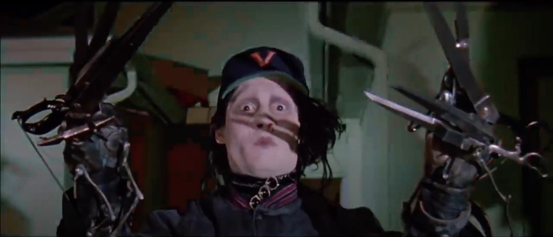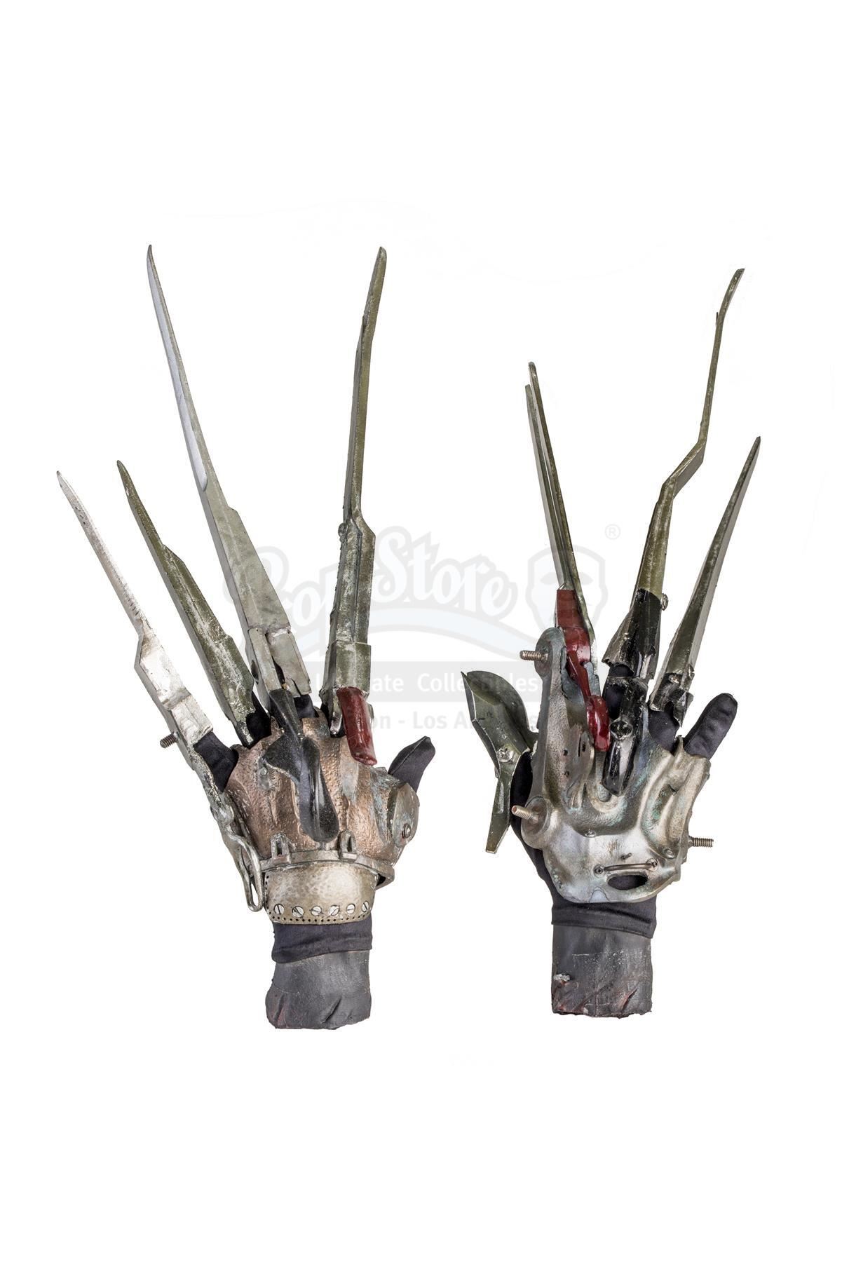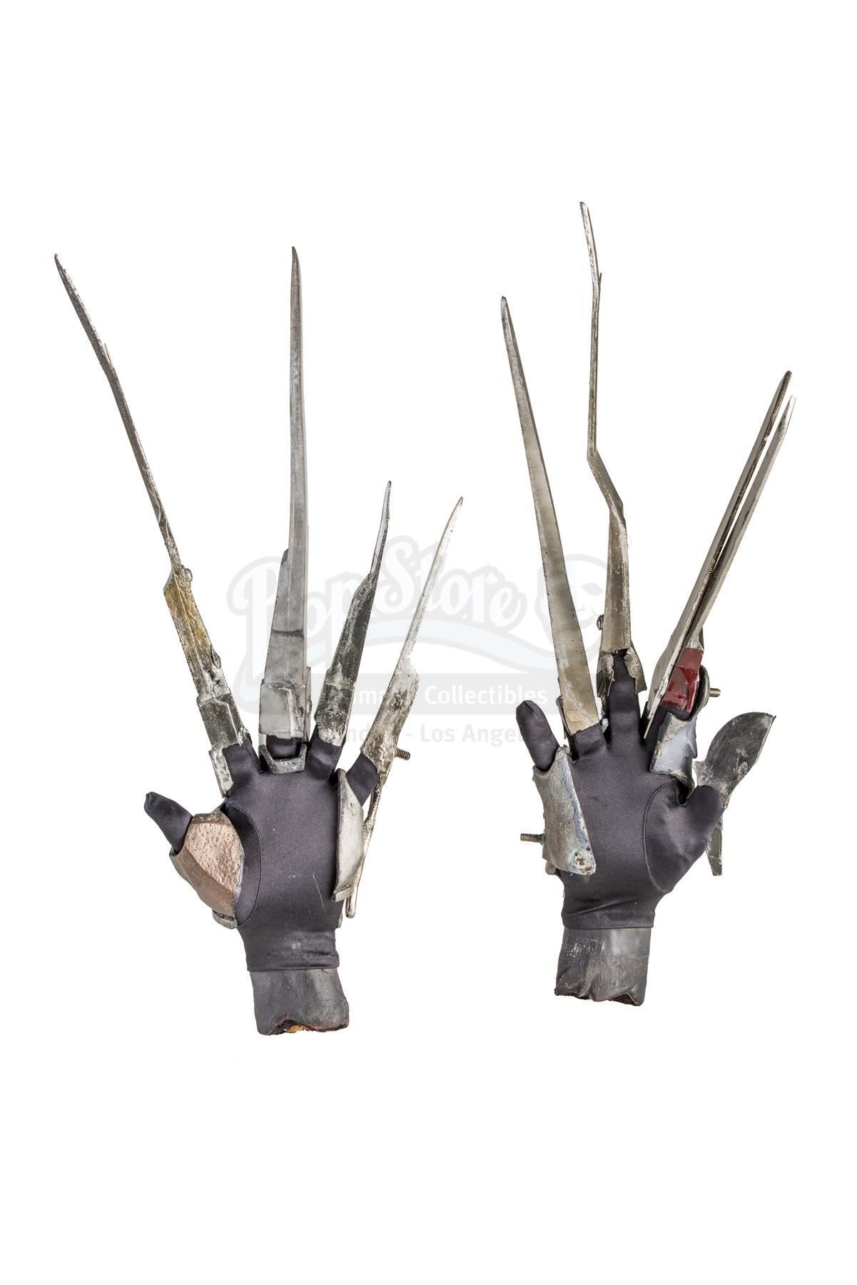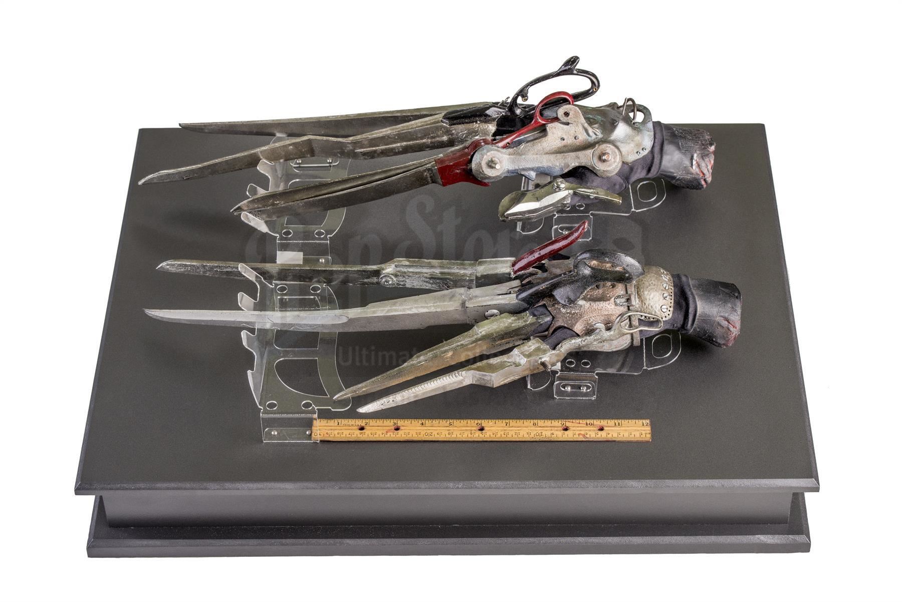 Edward Scissorhands' (Johnny Depp) scissorhands from Tim Burton's dark fantasy film Edward Scissorhands. Created by a visionary inventor (Vincent Price), young Edward Scissorhands was swept from isolation into suburbia where his odd personality and appearance became the talk of the town. One of a number of sets made for filming, this pair of scissorhands is comprised of backing plates, scissor blades and spandex gloves. A number of dressing components are missing, making the set incomplete, though the key blade elements are accounted for and present well. Each blade is made of urethane, for safety purposes, and was painted with metallic shades of silvertone and brown to depict used, rusted metal. Five of the blades in the set also include scissor grips, painted silvertone, black and red, each also made of urethane.