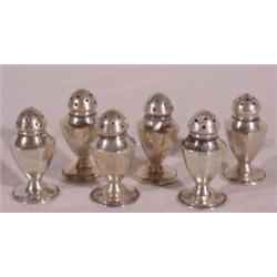 Set of Six (6) Sterling Pepper Shakers; Each marked sterling, minor dents. Each approx. 2"t. Est. $20 - $30.