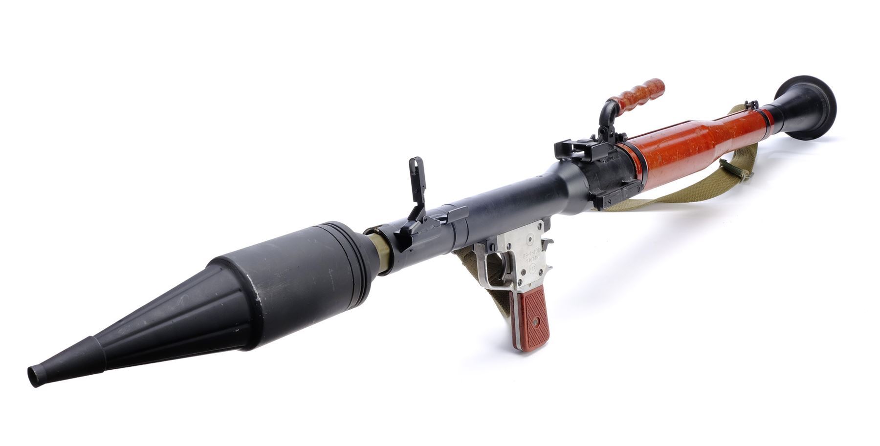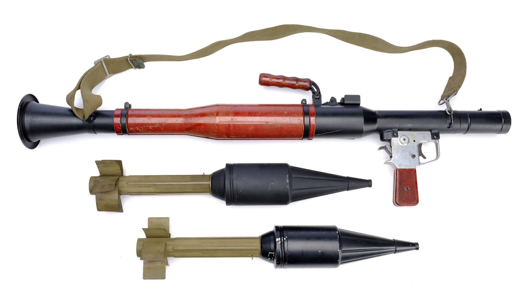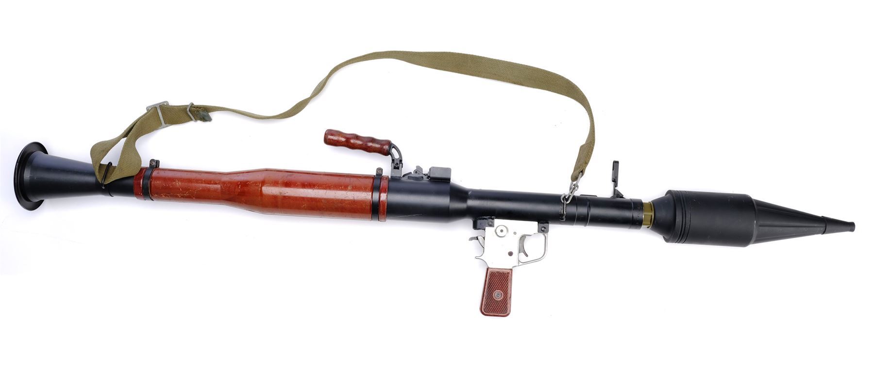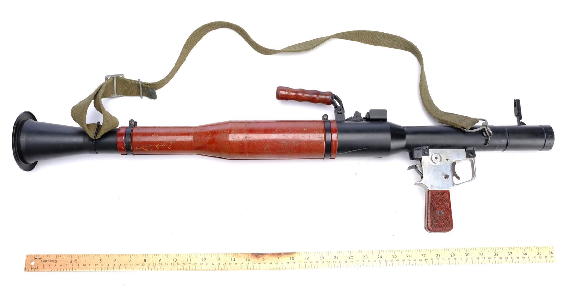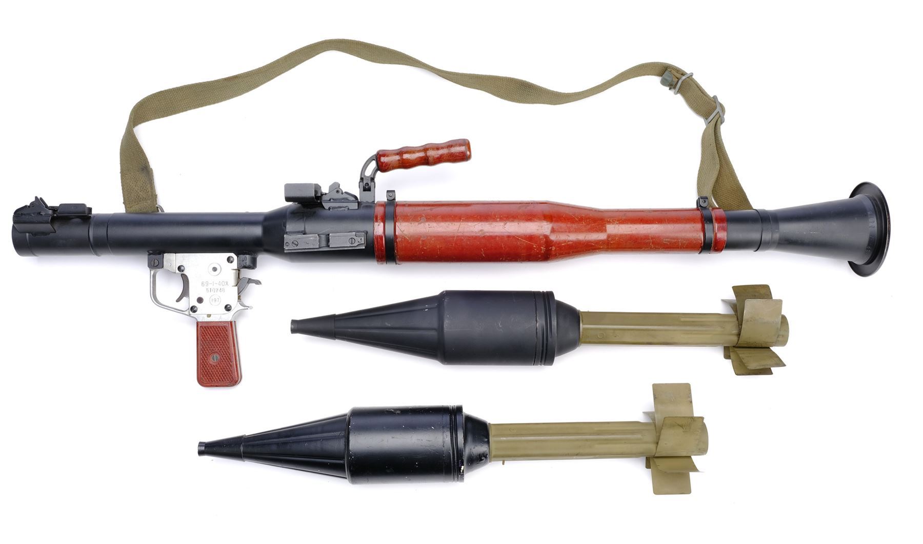 This film-prop, non-functional Type 69 RPG launcher with a brown carrying handle was altered by production to more closely resemble a Soviet-style RPG-2, though the launched rockets themselves were computer-generated. The launcher screen matches based on scratches on the brown body sleeve. It is constructed of metal and resin components painted umber, chrome-color, and charcoal with a green clip-on nylon shoulder strap and serial number "69-I-40-510748-197." Included are two olive and black resin PG-2 anti-tank rockets with metallic finishes and a licensed glossy color still from the film. The RPG launcher and rockets exhibit various signs of use by production, including paint scuffing and chipped resin throughout. Also included is an 8" x 10" production photo showing Jones with his grenade launcher. Dimensions: (launcher) 36" x 7" x 12" (91.5 cm x 18 cm x 30.5 cm)