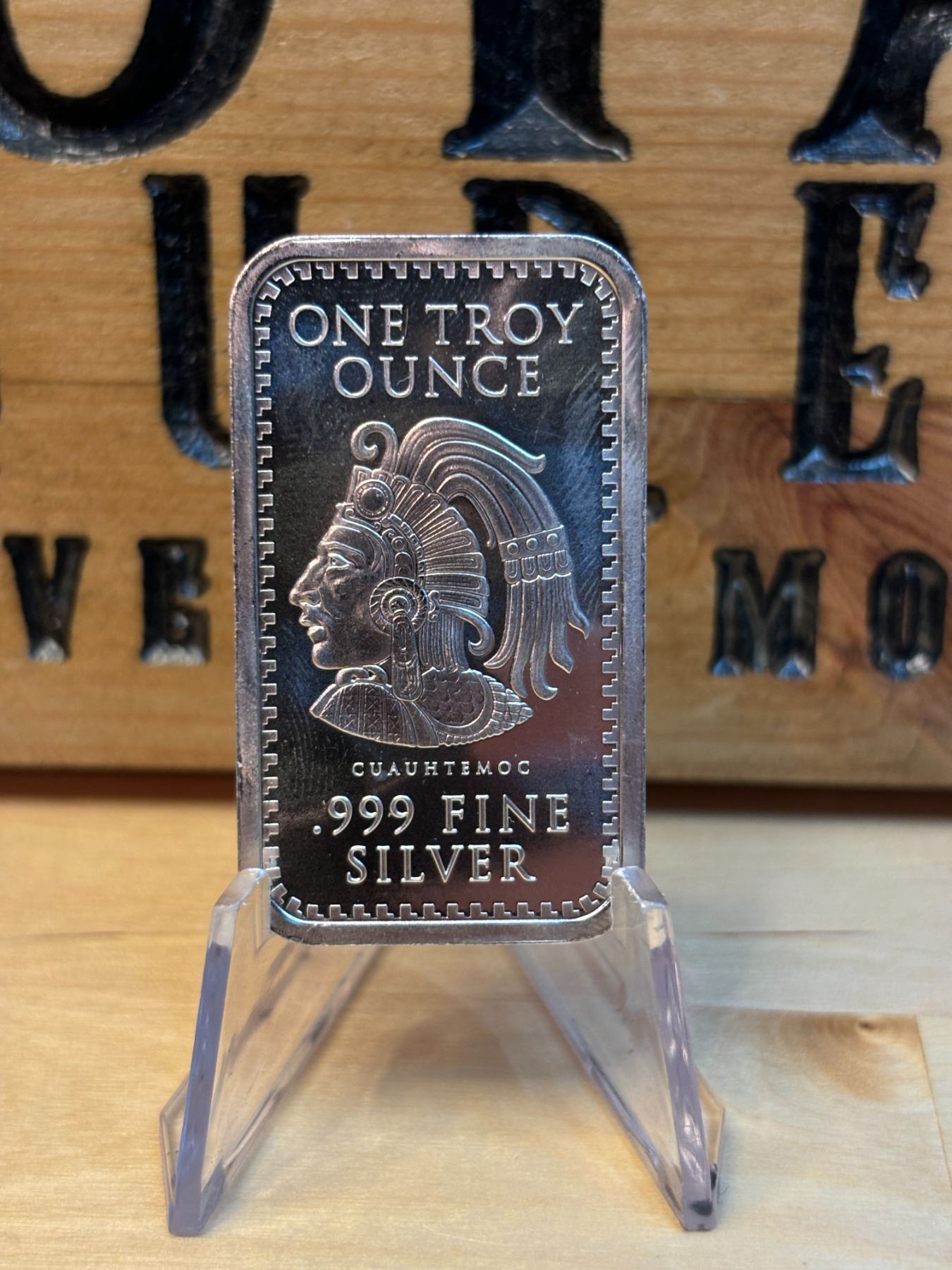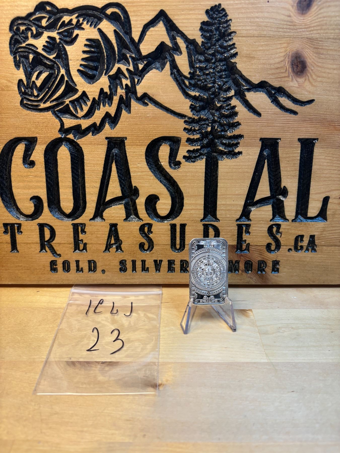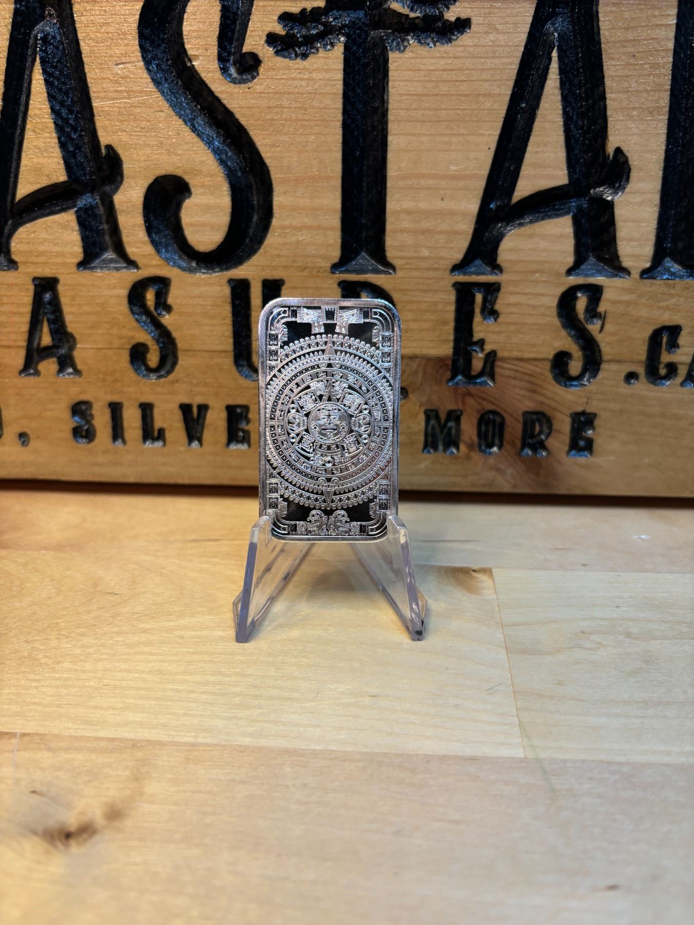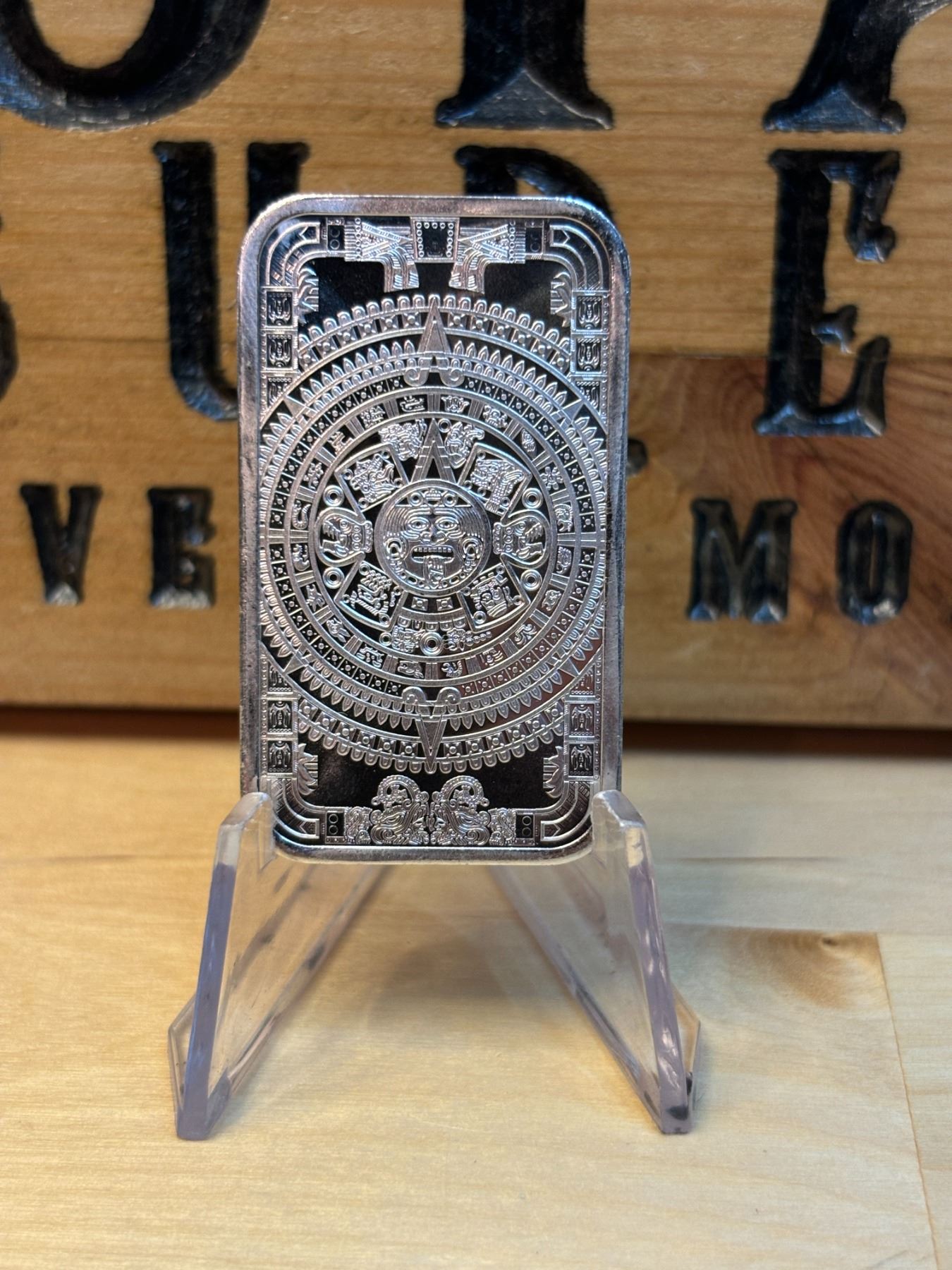 The 1 oz Aztec Calendar Silver Bar is a bullion bar that contains 1 ounce of .999 fine silver. It features a design based on the famous Aztec calendar stone, also known as the Sun Stone, which is a symbol of the Aztec civilization and represents the ancient Mesoamerican understanding of time and cosmology. The bar’s value is based on the silver content, but it may also carry a premium due to its intricate design, cultural significance, and appeal to collectors interested in ancient history or Mesoamerican art.