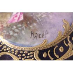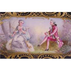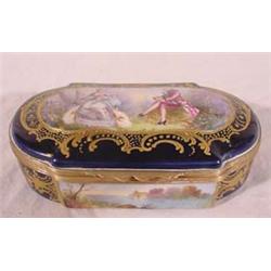 Hand Painted Porcelain Box, Probably French, Ca. 1900; Very nice little box with a hand painted watteau type garden landscape with lovers, signed "Hazef". This scene is within a cartouche of gold scrolling leaves. Landscape painted on front and rear panels amongst gilded scrolling leaves. Interior of lid and base decorated with hand painted floral sprays. Bronze mounts, cobalt ground. Nice condition, minor scratching. 5.25"l x 3.25"w x 1.5"t. Est. $200 - $300.