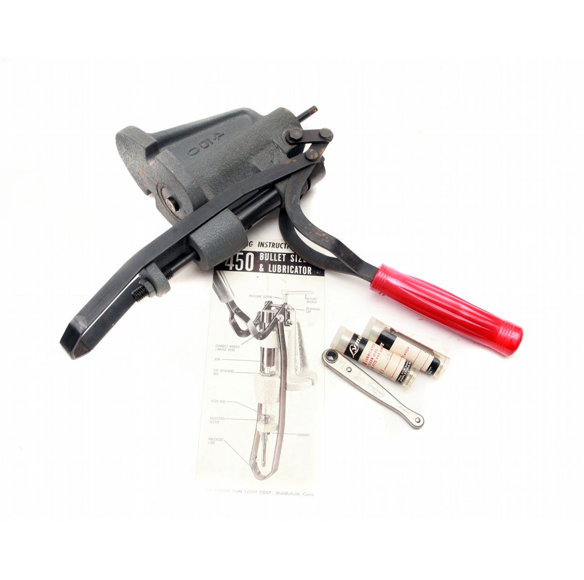 Like new condition Lyman 450 bullet sizer & lubricator - includes two dies in .358 & .452 in plastic cases - tool included - owner manual - non-ffl - 25IIHCKS006