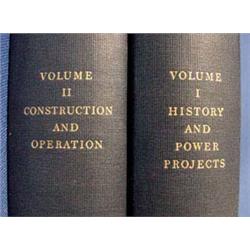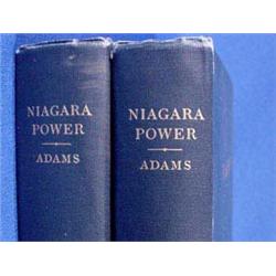 Adams, Edward Dean, Niagara Power, 2 Volume Set; Niagara Falls, NY: Niagara Falls Power Company, 1927 Cloth. Very Good. No edition stated. 11"t. Handsome, heavy 2 volume history published on the 50th anniversary of the foundation of the power company. The blue boards are lightly rubbed at extremities. Inside are many illustrations, a foldout map and a foldout chart. Pages are very lightly browned glossy paper. Est. $80 - $120.