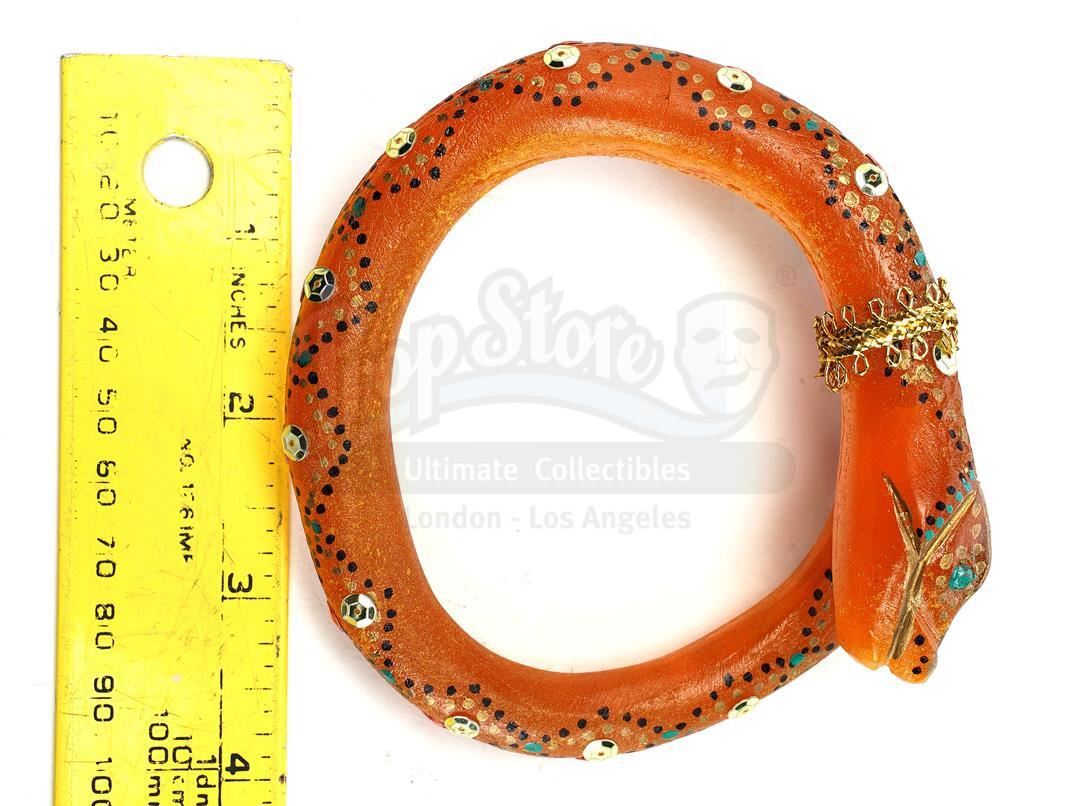 This lot will be auctioned on Tuesday, June 29th. The auction will begin at 9:00am PDT and lots are sold sequentially via live auctioneer; tune in to the live streaming broadcast on auction day to follow the pace. Note other lots in the auction may close on June 30th or July 1st. A snake amulet from John Madden's period comedy-drama Shakespeare in Love. William Shakespeare (Joseph Fiennes) handed Rosaline (Sandra Reinton) an ornate amulet with a secret message hidden in its mouth shortly before he learned that she was with another man. The amber-color resin bangle is decorated with black, metallic green and gold-color painted dots, and features randomly placed sequins, some of which have small, pink painted embellishments. Metallic gold-color trim adorns the neck, and is also wrapped around the tail. A hole is present in the mouth where a paper message was inserted. The amulet exhibits signs of wear from age and production use including some paint chipping, but remains in excellent overall condition. Dimensions: 4" x 4" x 2" (10.25 cm x 10.25 cm x 5 cm) Estimate: $3,000 - 5,000