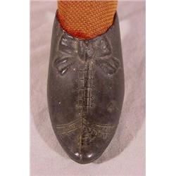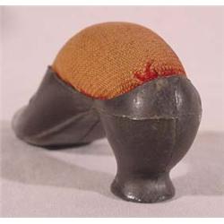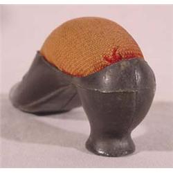 Victorian Ladies Shoe Pin Cushion; A highly detailed ladies shoe pin cushion with nice patinated surface. 4"l x 1.5"h. Est. $20 - $30.