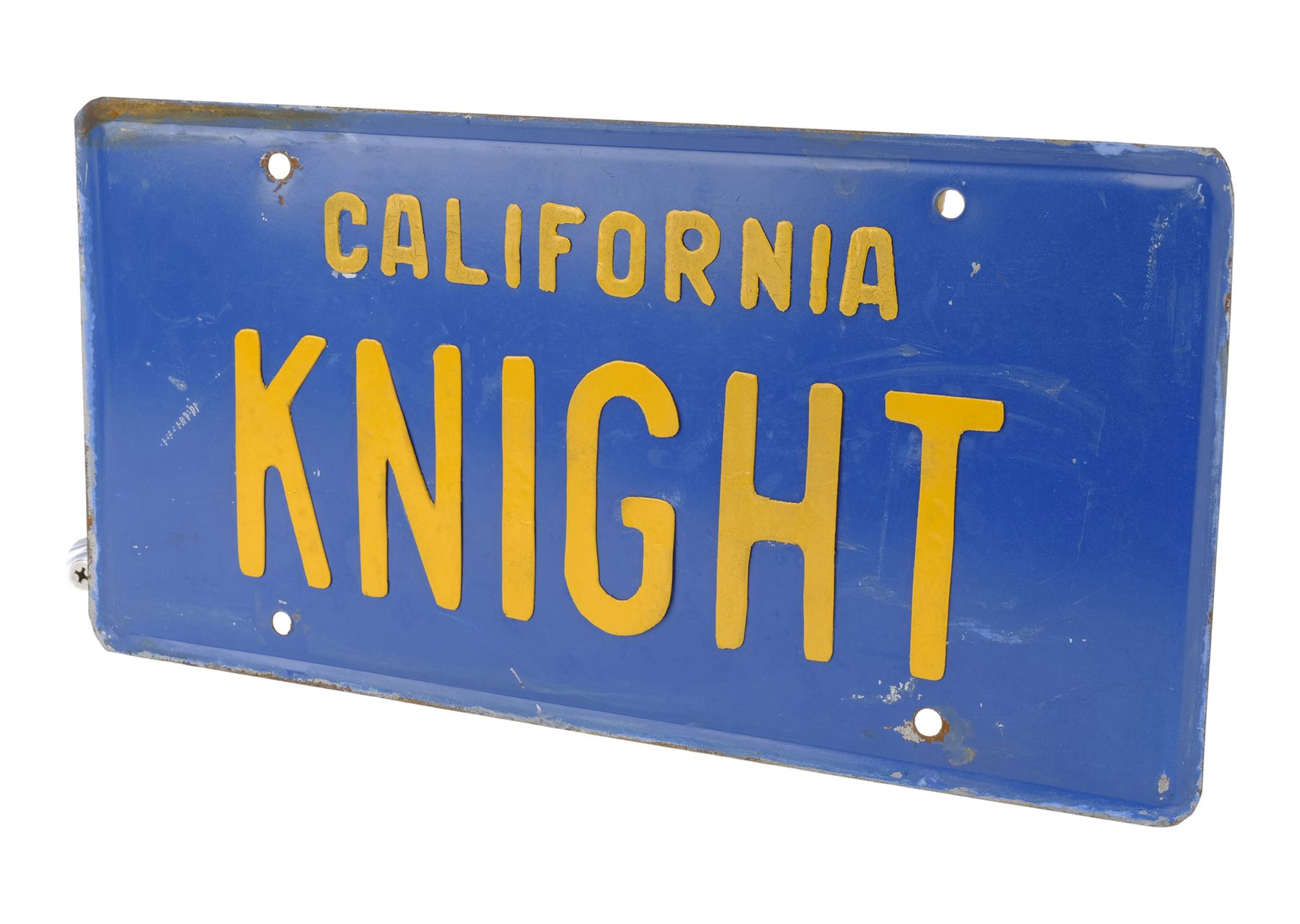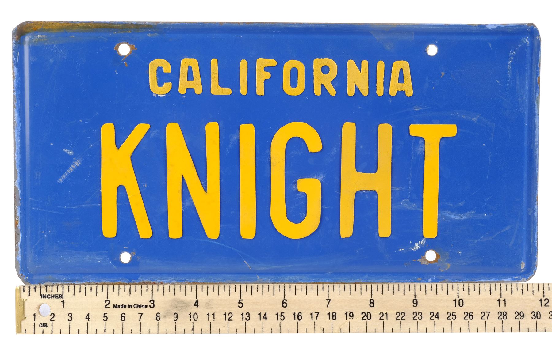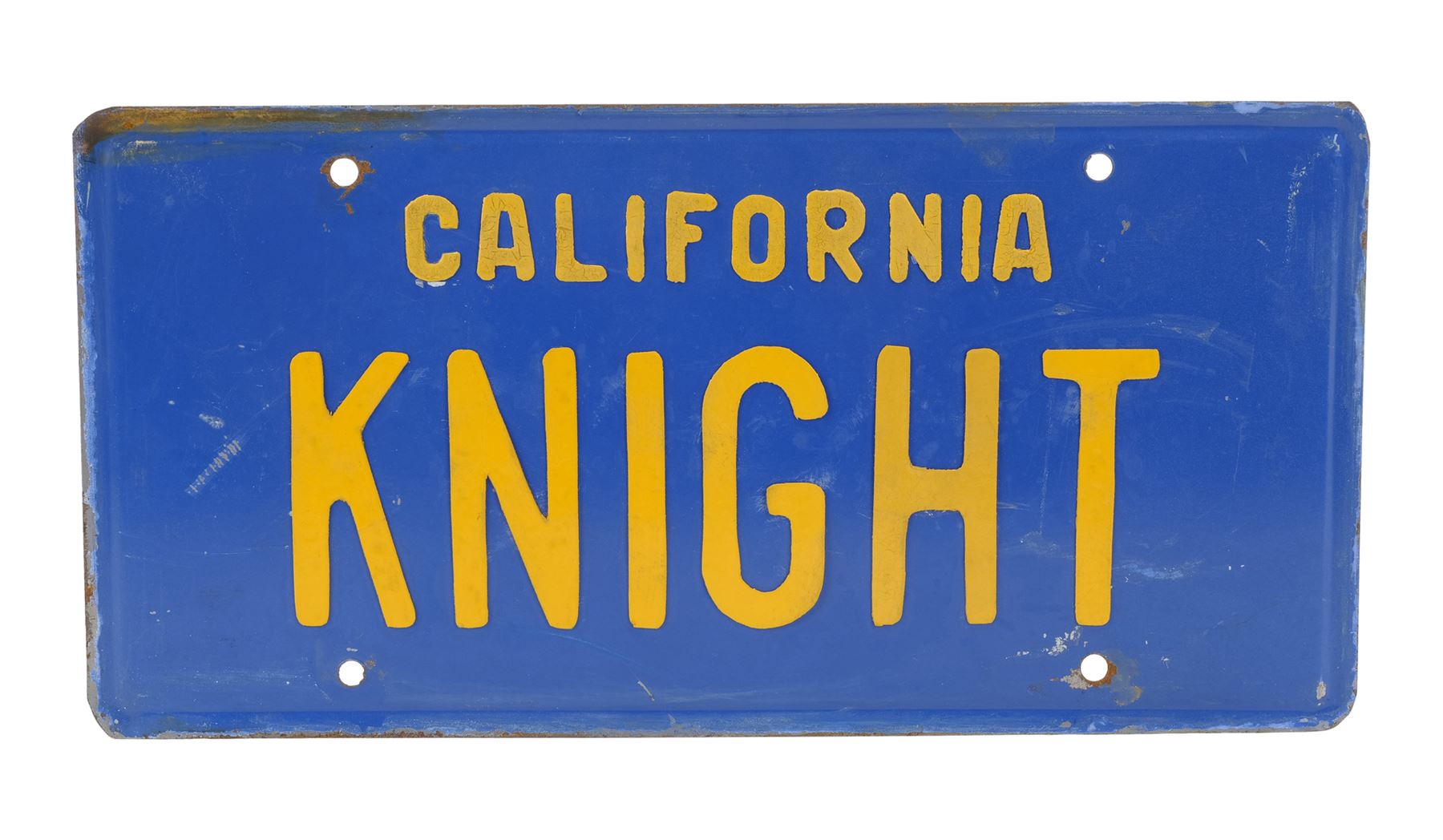 This blue metal licence plate with four screw holes features yellow "California" and "KNIGHT" cut-outs glued to the front and strips of adhesive on the reverse. It exhibits rusting on the back and edges, as well as bending from age and use. Dimensions: 30.5 cm x 15.25 cm x 0.75 cm (12" x 6" x 0.25")