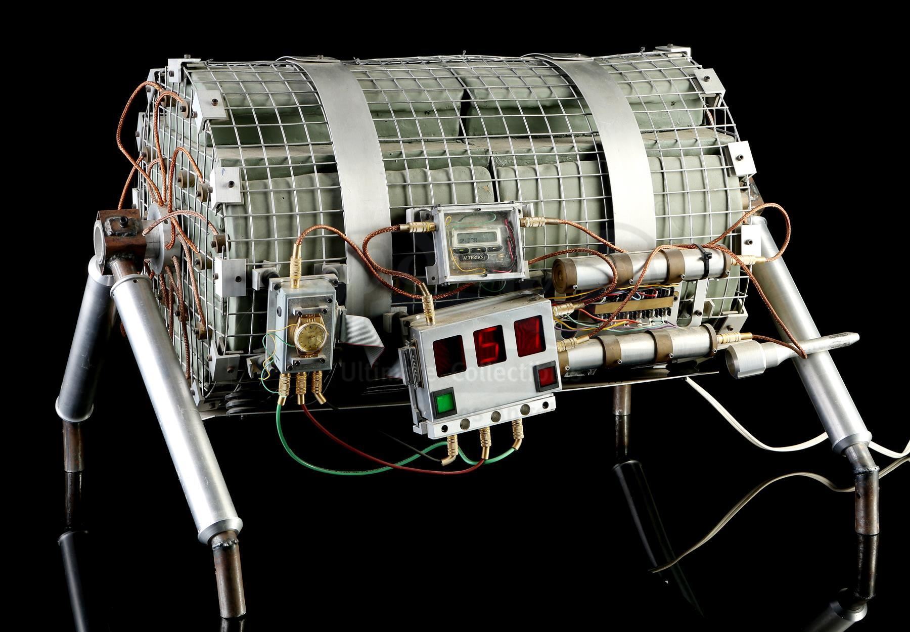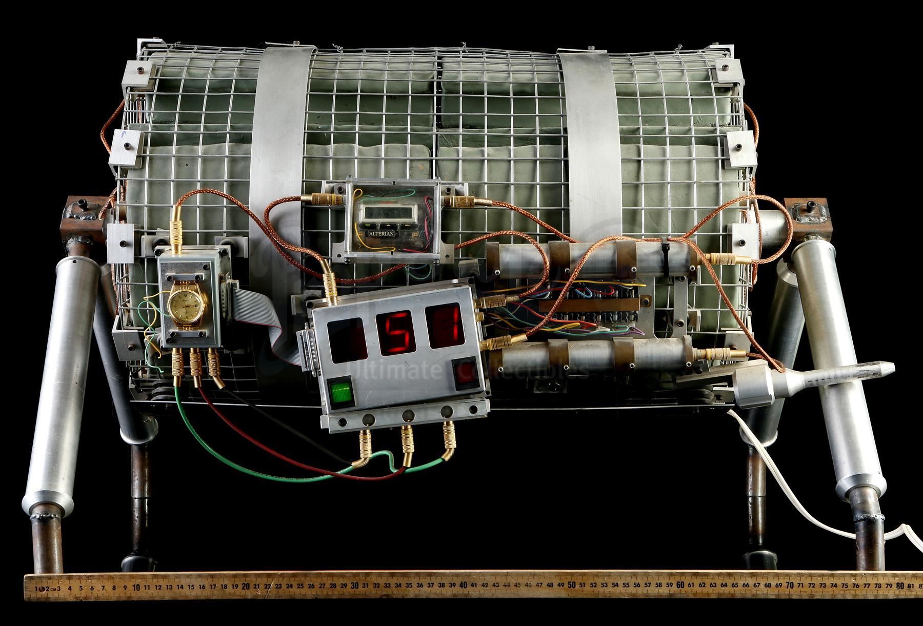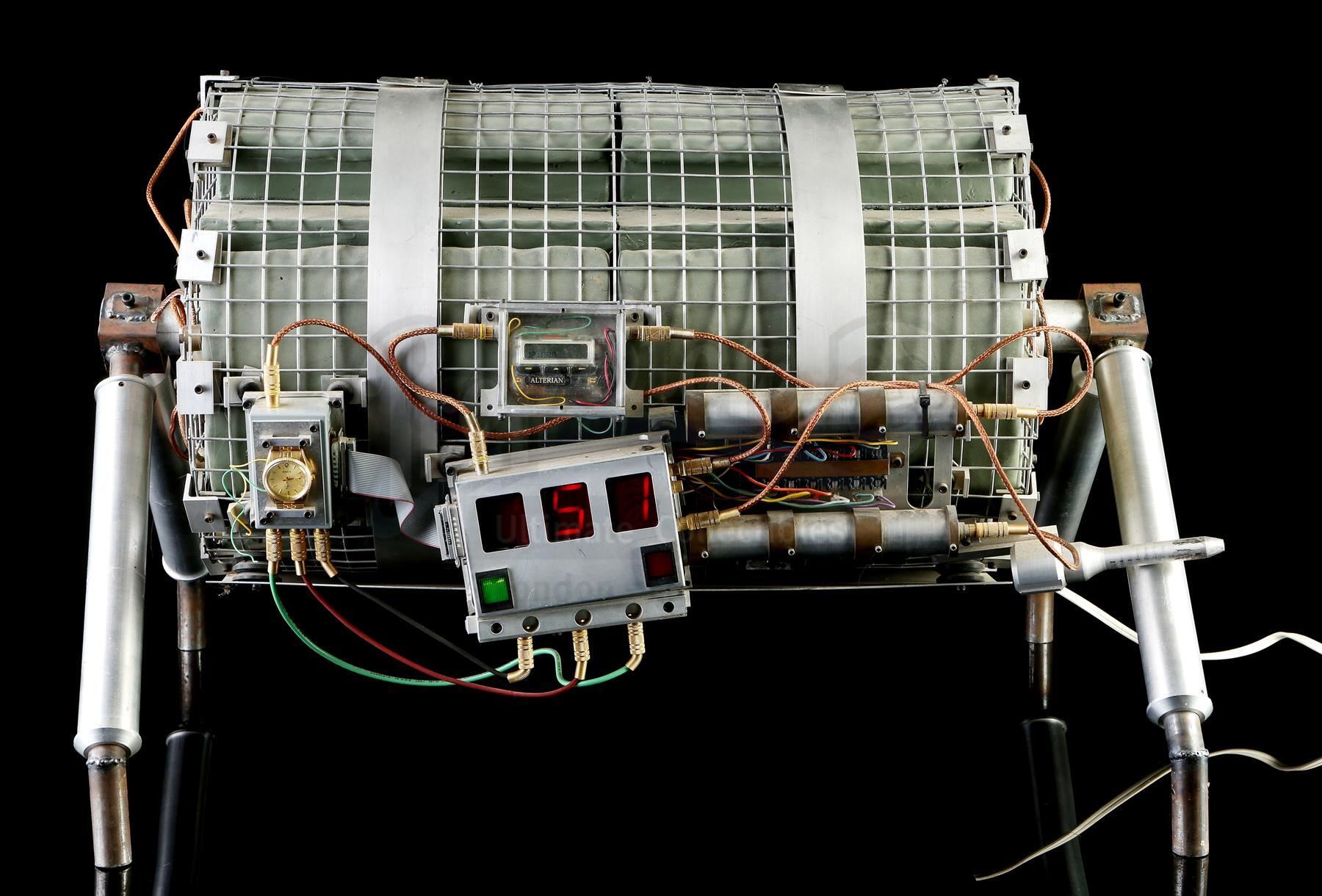This lot will be auctioned on Tuesday, June 29th. The auction will begin at 9:00am PDT and lots are sold sequentially via live auctioneer; tune in to the live streaming broadcast on auction day to follow the pace. Note other lots in the auction may close on June 30th or July 1st. Howard Payne's (Dennis Hopper) bus bomb from Jan De Bont's action thriller Speed. Disgruntled police officer Payne planted a bomb on a city bus, rigging it to explode if the bus dropped below 50mph. This prop bomb was custom made for the film and consists of a cylindrical metal mesh housing containing foam rubber blocks and resin details painted gray to resemble plastic explosives A series of metal wires, cables, a pager, a section of a gold prop retirement watch, and various other decorative components are affixed to the housing. On one side is a functional electronic "countdown clock" with red digital numbers, a pair of buttons, and a power cord. It features a support for display, and exhibits minor wear on the mesh housing and wiring, but the bomb remains in good overall condition. Dimensions: 33" x 24.5" x 22" (83.73 cm x 62.25 cm x 56 cm) Contains electronic components; see notice in the Buyer's Guide. Estimate: $6,000 - 8,000