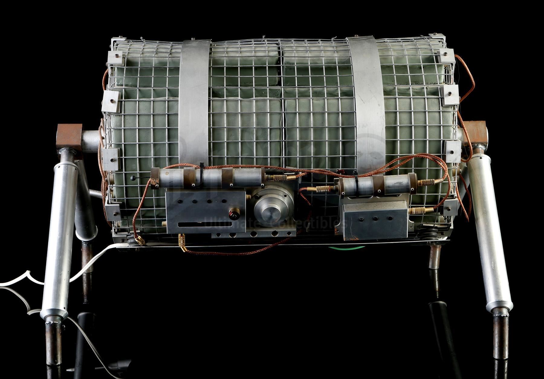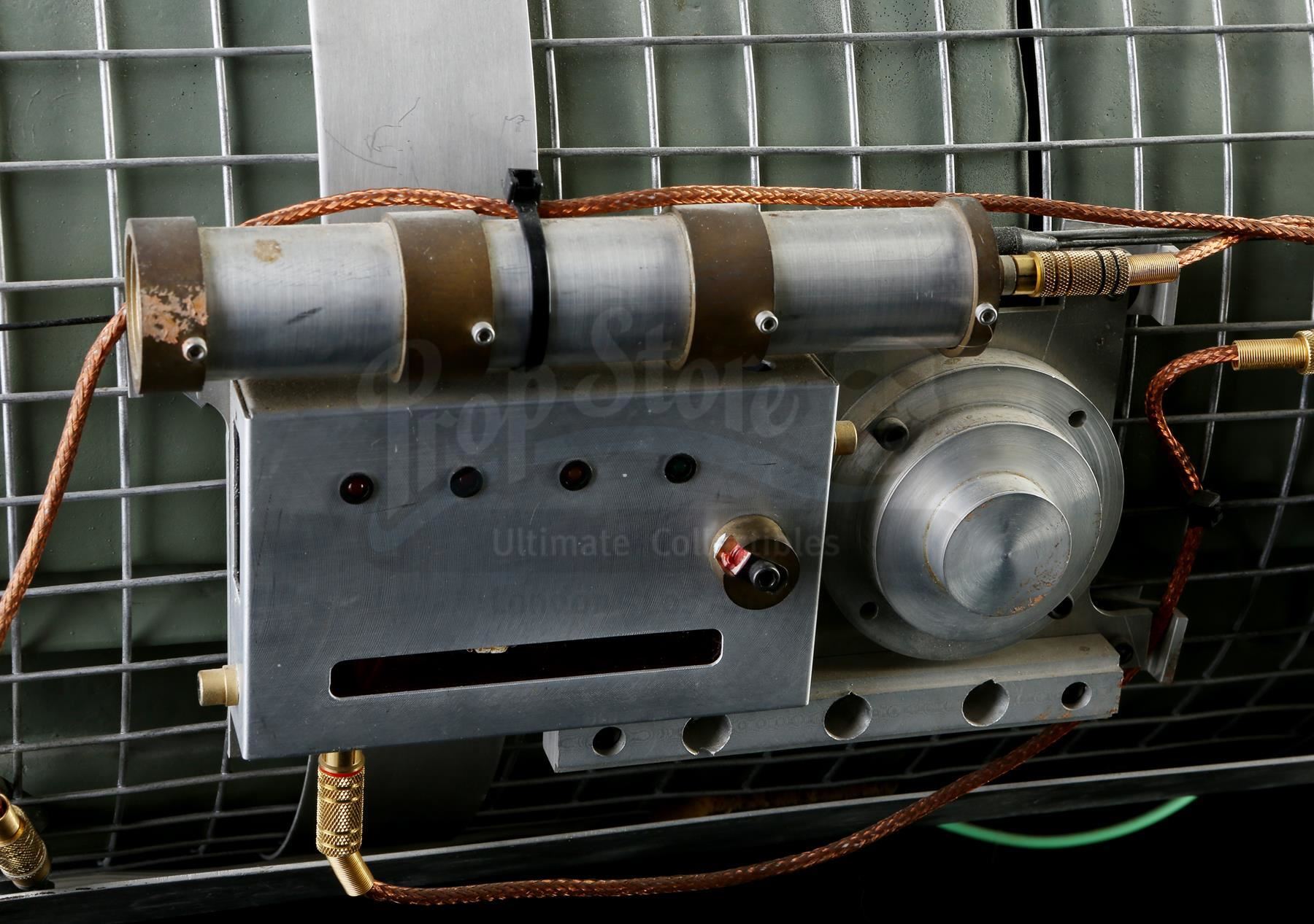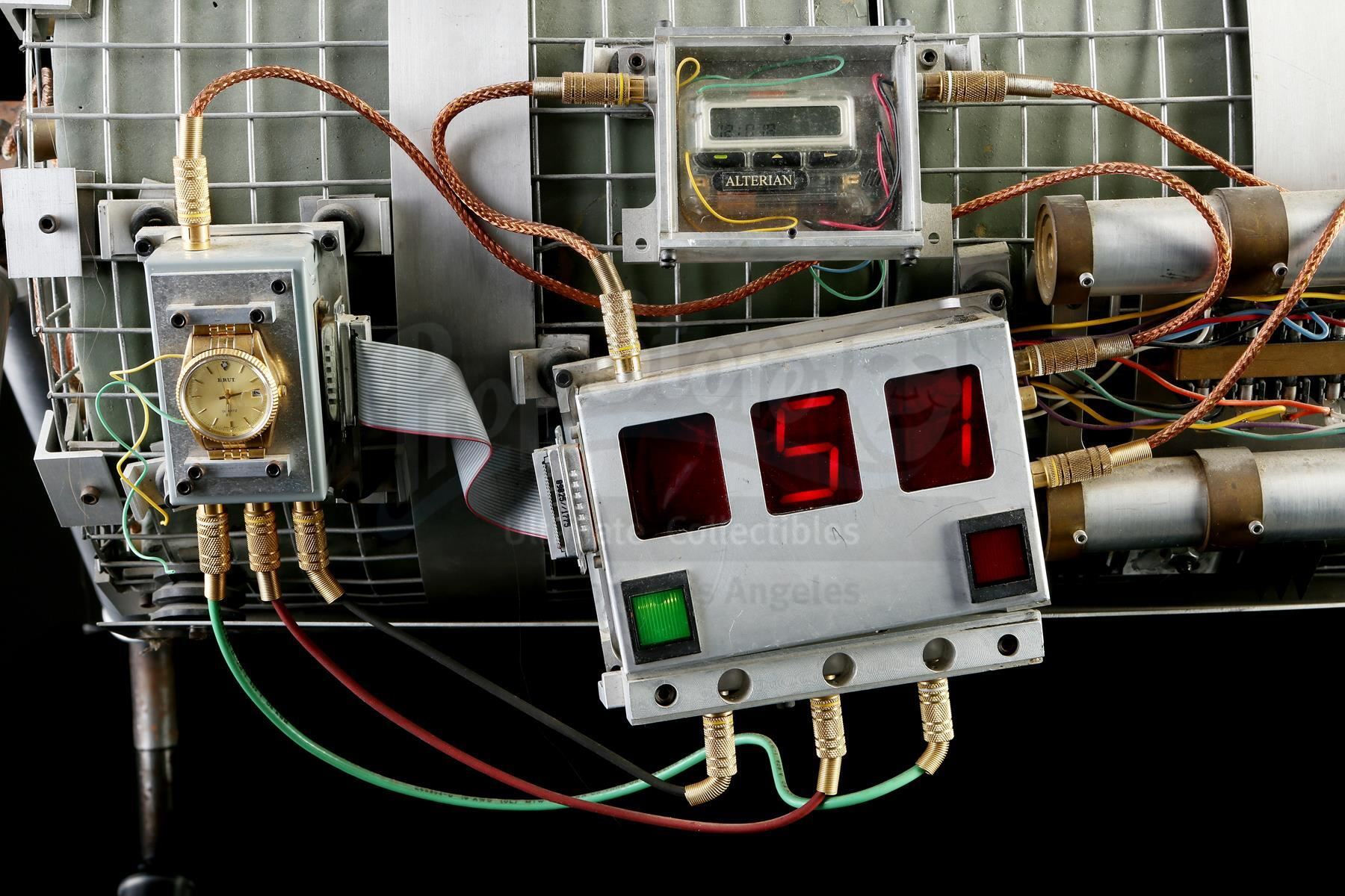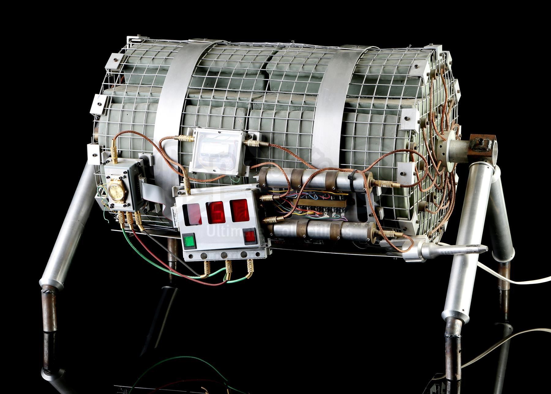 This lot will be auctioned on Tuesday, June 29th. The auction will begin at 9:00am PDT and lots are sold sequentially via live auctioneer; tune in to the live streaming broadcast on auction day to follow the pace. Note other lots in the auction may close on June 30th or July 1st. Howard Payne's (Dennis Hopper) bus bomb from Jan De Bont's action thriller Speed. Disgruntled police officer Payne planted a bomb on a city bus, rigging it to explode if the bus dropped below 50mph. This prop bomb was custom made for the film and consists of a cylindrical metal mesh housing containing foam rubber blocks and resin details painted gray to resemble plastic explosives A series of metal wires, cables, a pager, a section of a gold prop retirement watch, and various other decorative components are affixed to the housing. On one side is a functional electronic "countdown clock" with red digital numbers, a pair of buttons, and a power cord. It features a support for display, and exhibits minor wear on the mesh housing and wiring, but the bomb remains in good overall condition. Dimensions: 33" x 24.5" x 22" (83.73 cm x 62.25 cm x 56 cm) Contains electronic components; see notice in the Buyer's Guide. Estimate: $6,000 - 8,000