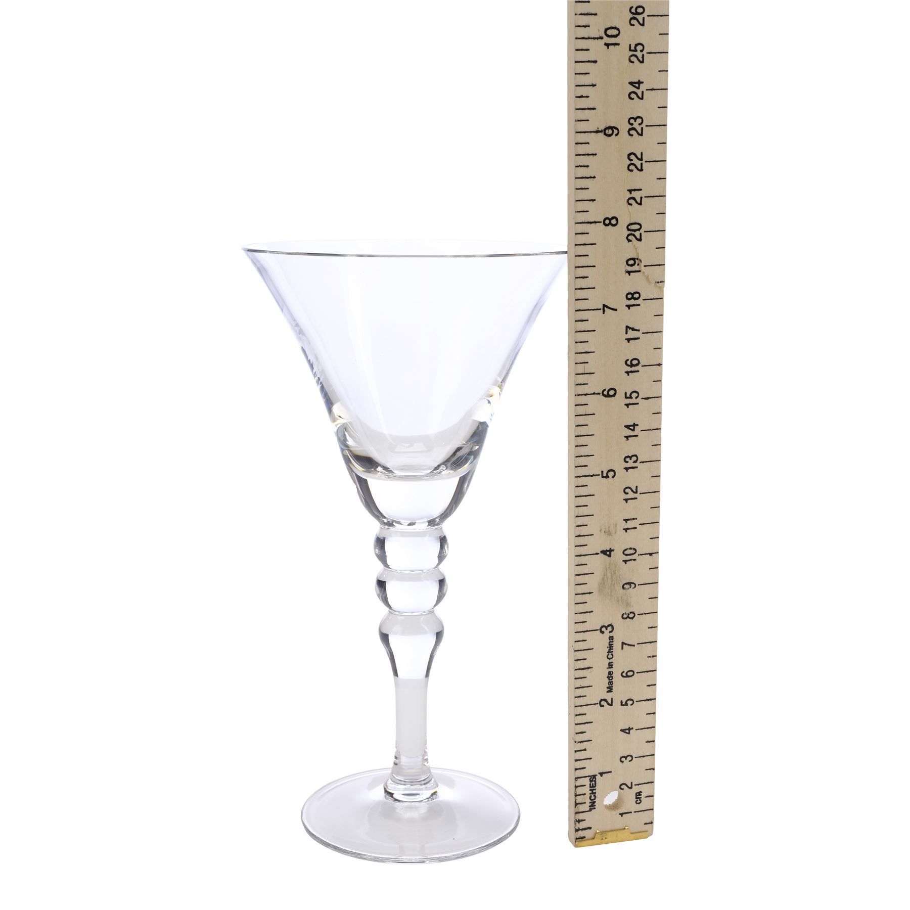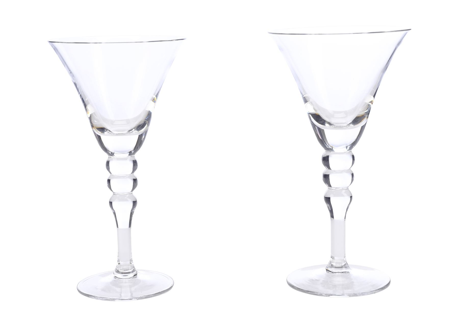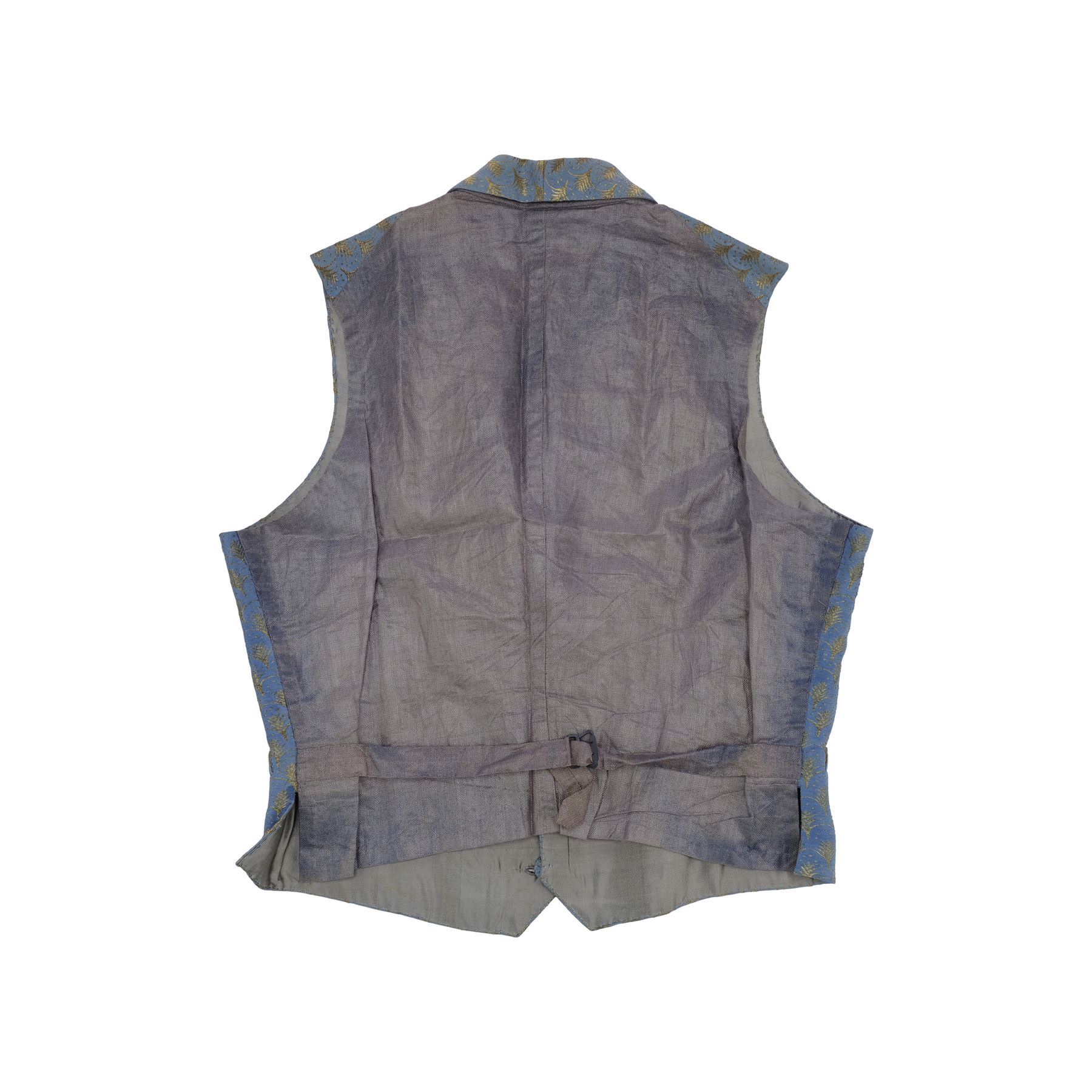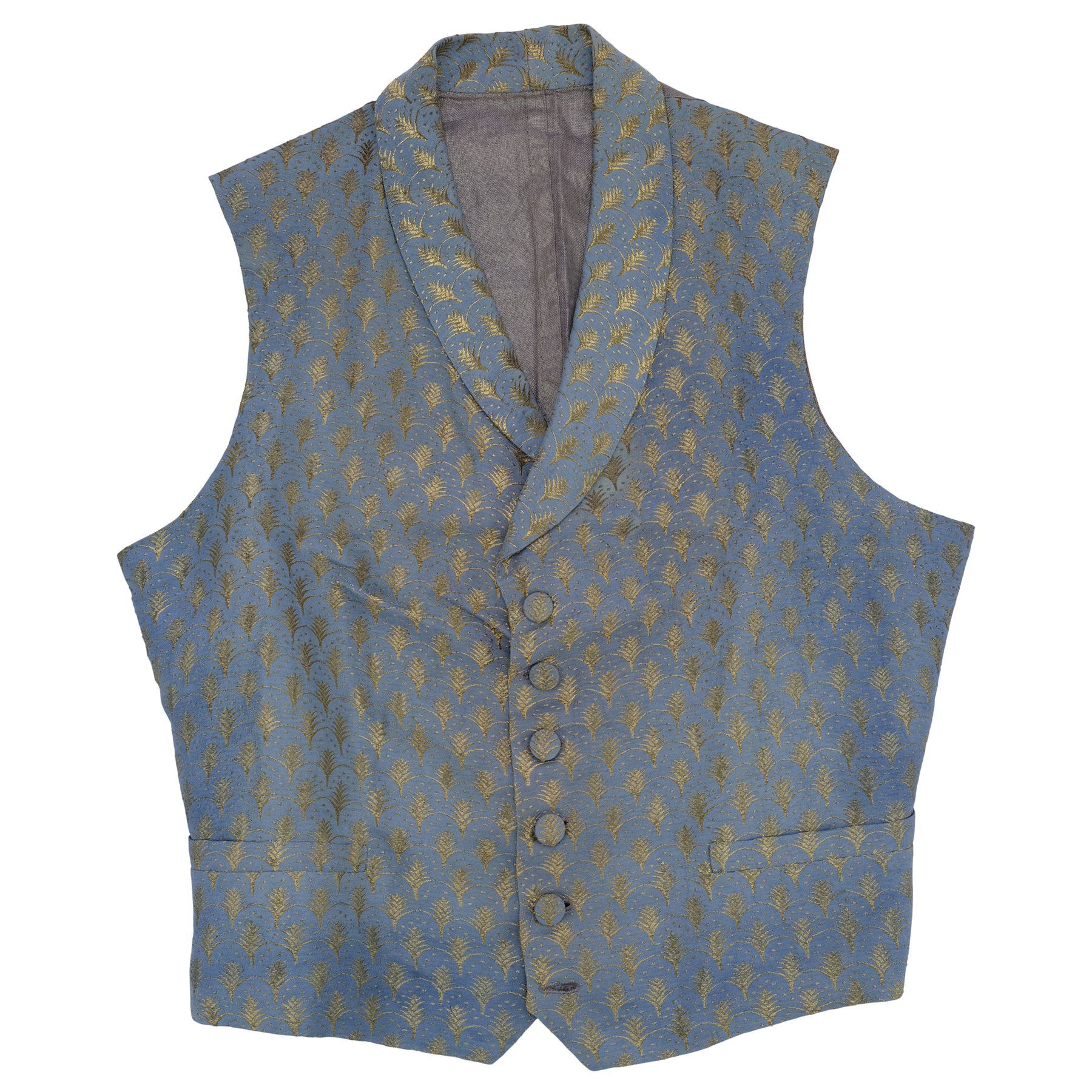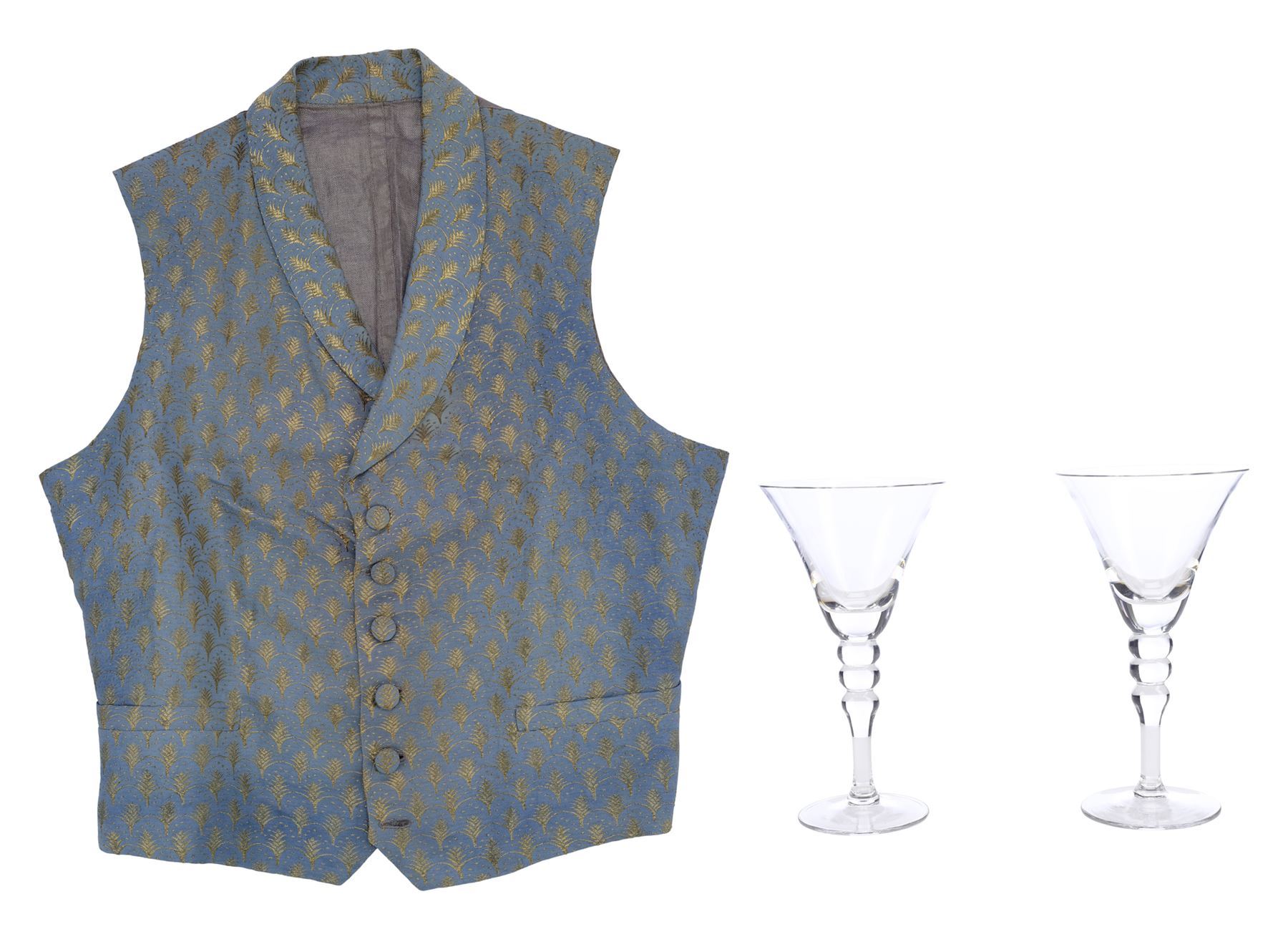 This linen waistcoat features a pale blue front embellished with an embroidered gold-color pattern throughout. A handwritten label sewn to the underarm reads "Lestat 10." The wine glasses each feature a trumpet bowl with a beaded stem. The waistcoat exhibits a blue-color run on the back panel as a result of age and use. Dimensions: (each) 4" x 4" x 7.75" (10 cm x 10 cm x 19.75 cm)