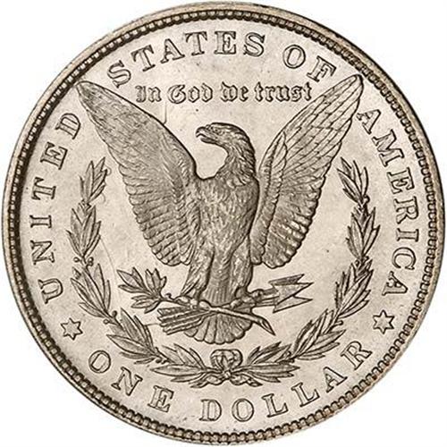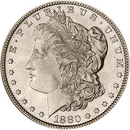 1880 Morgan Dollar. Another which has baking bright white luster on satiny surfaces. A touch of weakness is seen at the at the ear on many of this issue is completely absent here, so it is likely that the dies were spaced with the proper distance to impart this stronger metal flow in that area; the obverse details and virtually pristine. (#7096)