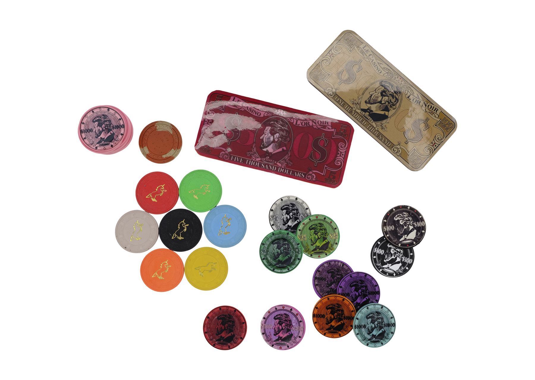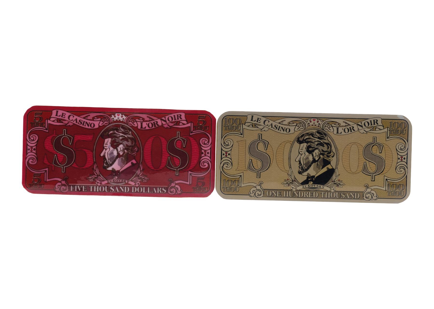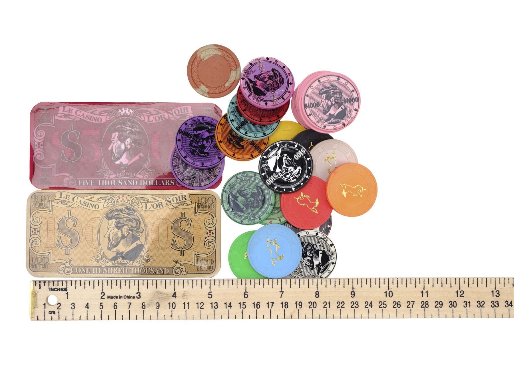 THE WORLD IS NOT ENOUGH (1999) - Set of Casino L'or Noir Plaques and Chips - Casino L'or Noir plaques and chips from Michael Apted's Bond film The World Is Not Enough. James Bond (Pierce Brosnan) visited Valentin Zukovsky's (Robbie Coltrane) Casino L'or Noir in search of information on Russian terrorist Renard (Robert Carlyle).