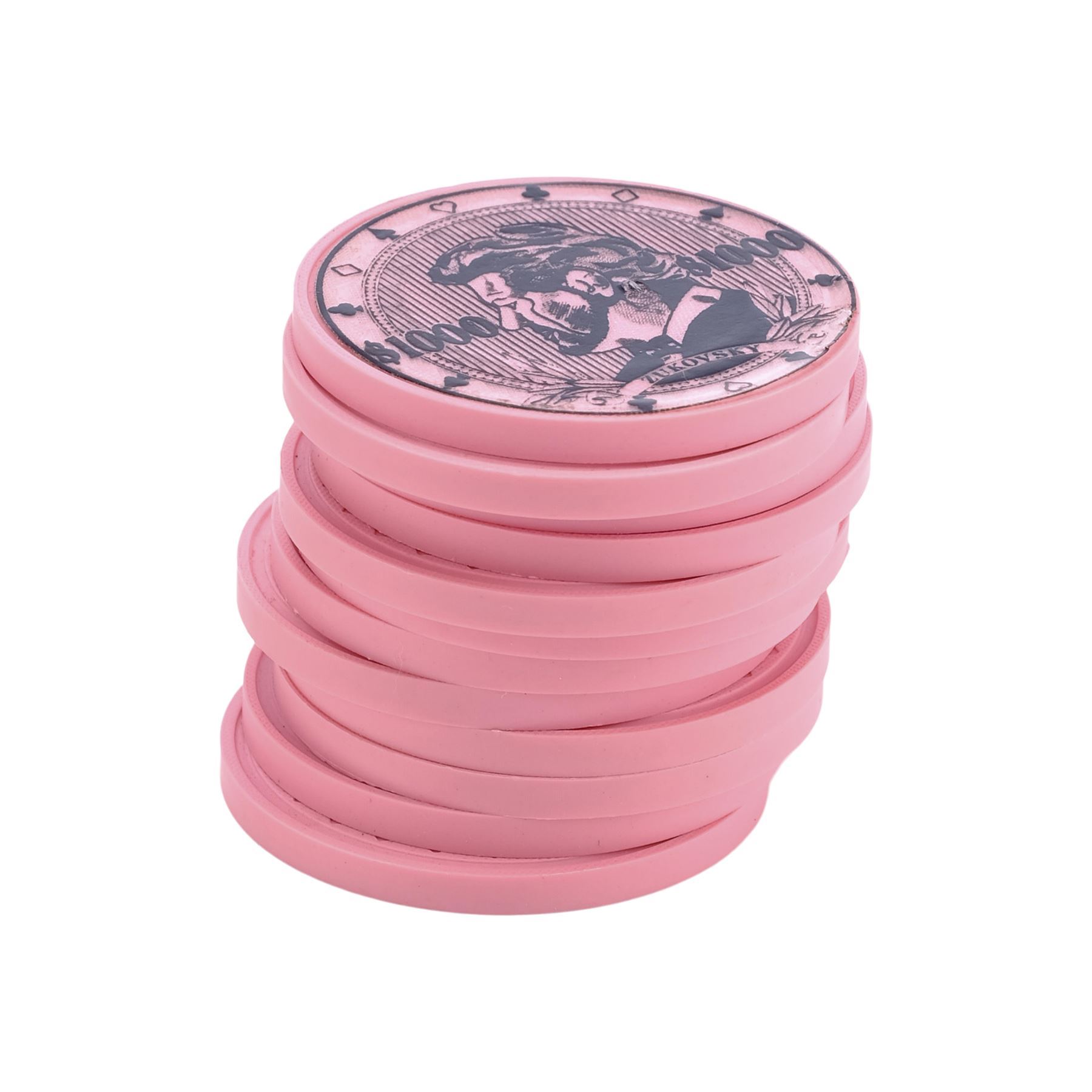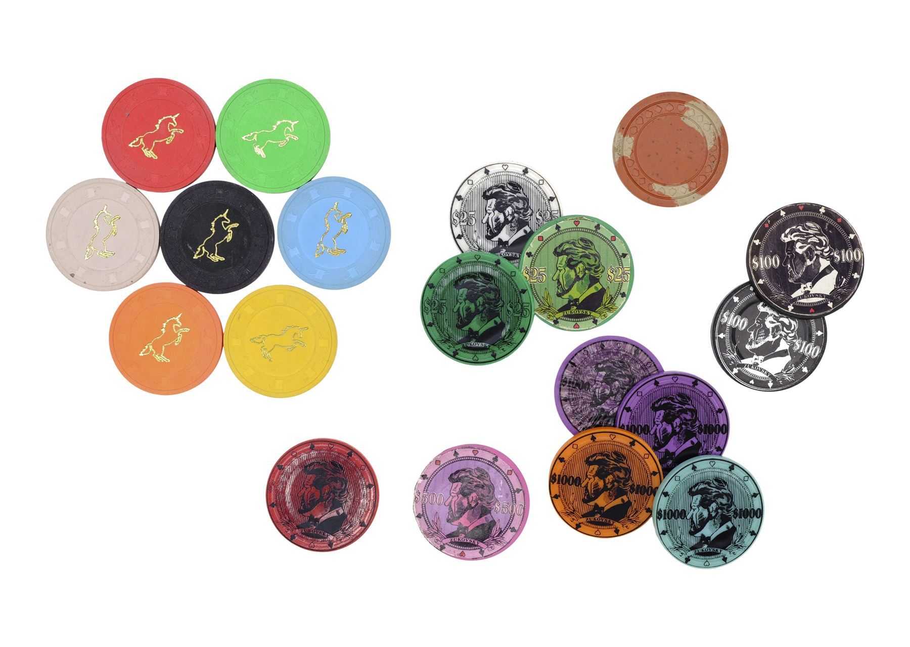 This set consists of one silver $100,000 and one red $5,000 plastic casino plaques; a plastic stack of pink $1,000 chips; and 19 plastic chips in various colors and denominations. Each is printed with Zukovsky's face printed on both sides. The set exhibits bubbling plastic, nicks, and scratching from production use. Dimensions: (plaques) 5.5" x 2.5" (14 cm x 6.5 cm); (chips) 2" x 2" (5" x 5")