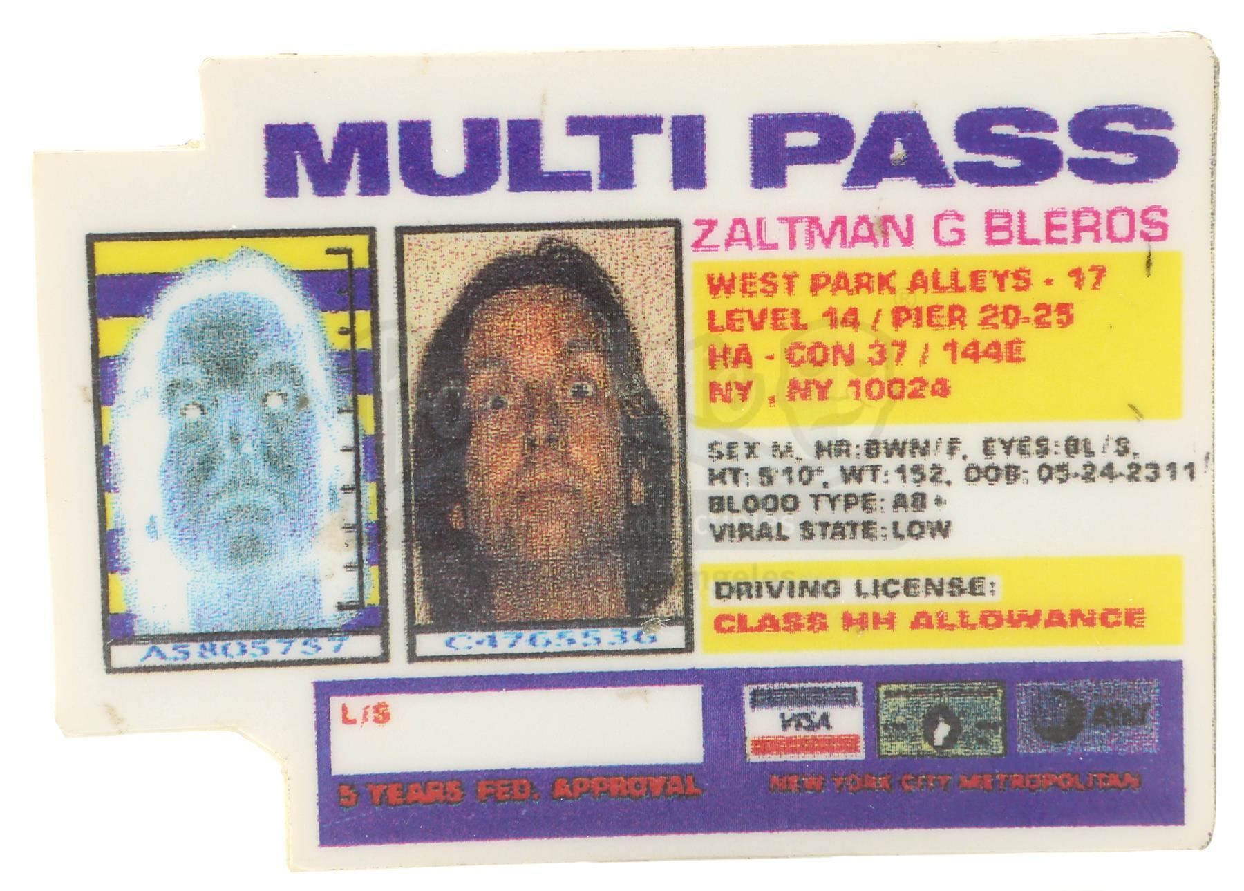 A Zaltman G Bleros Multi Pass from Luc Besson's sci-fi adventure The Fifth Element. Multi Passes were used by characters in the film as a form of identification. Zaltman Bleros was the original name of the character Korben Dallas (Bruce Willis) when Besson initially conceived the story as a teenager. The Multi Pass' photograph is of Nick Dudman, who was the production's creature design supervisor. The Multi Pass itself does not appear in the final cut of the film.