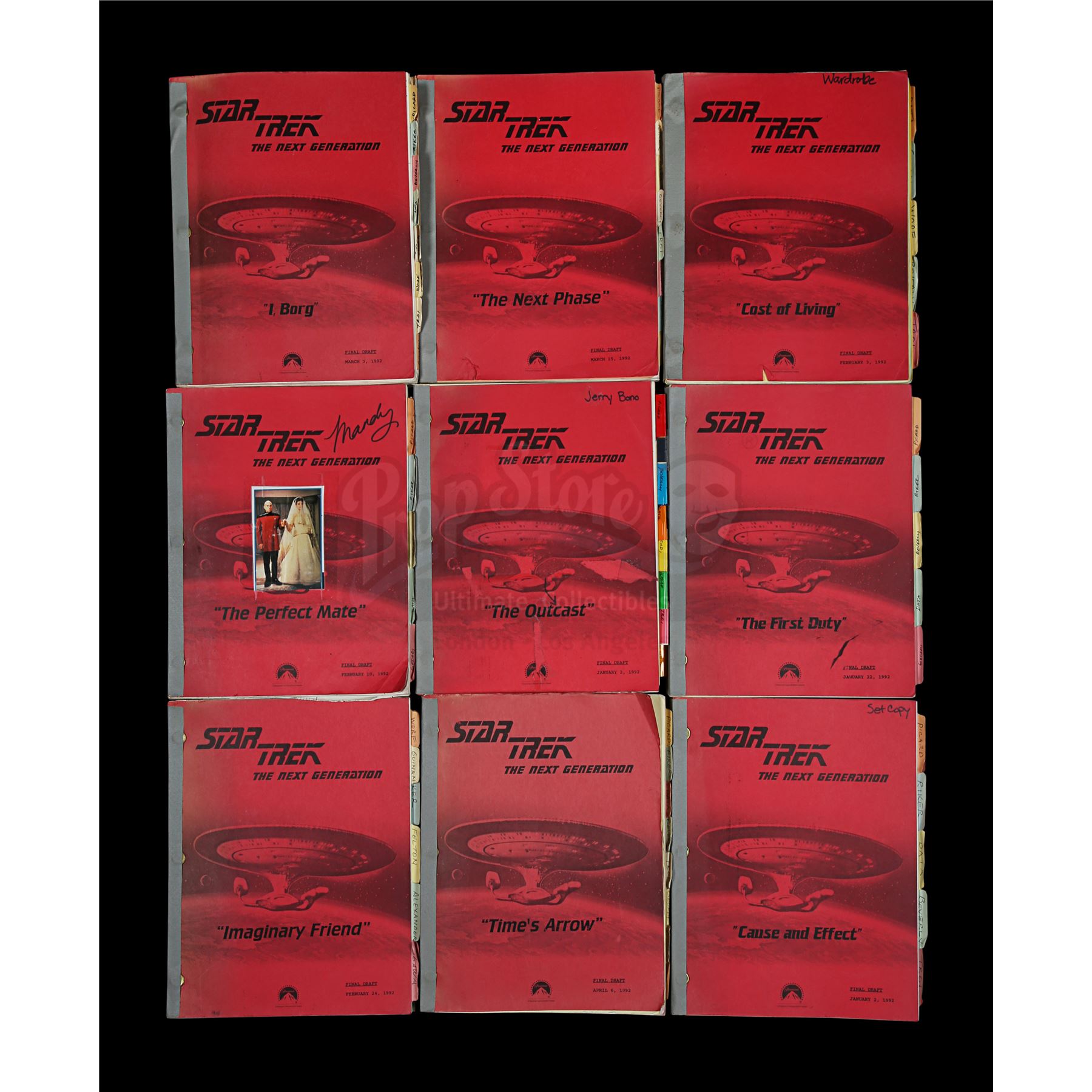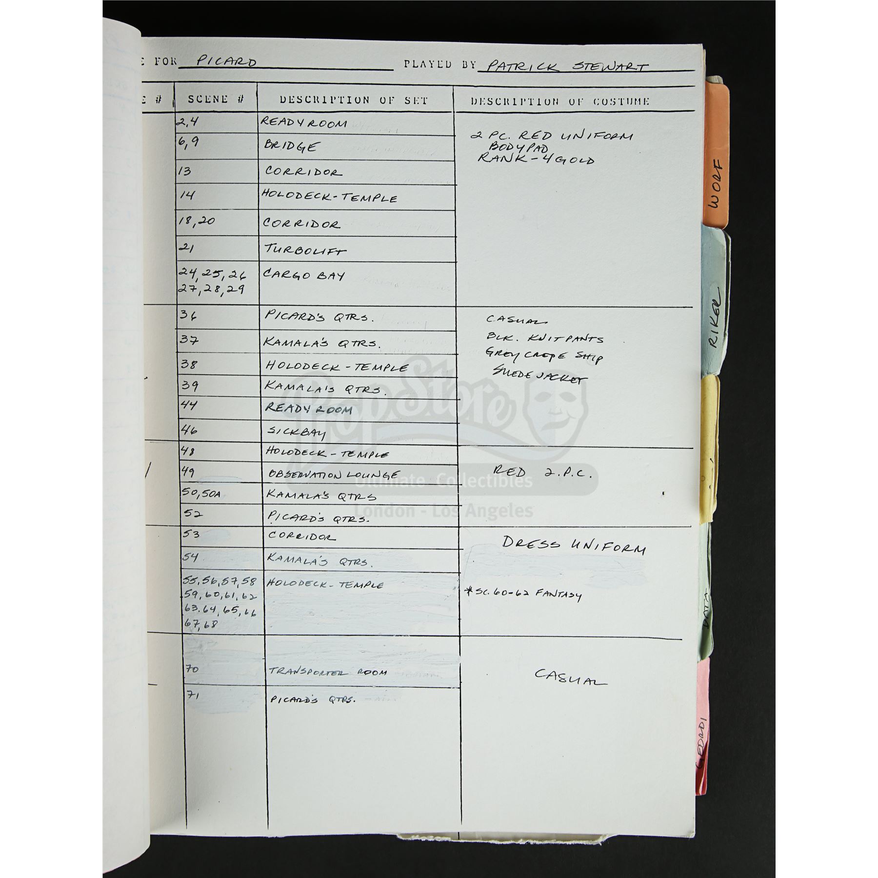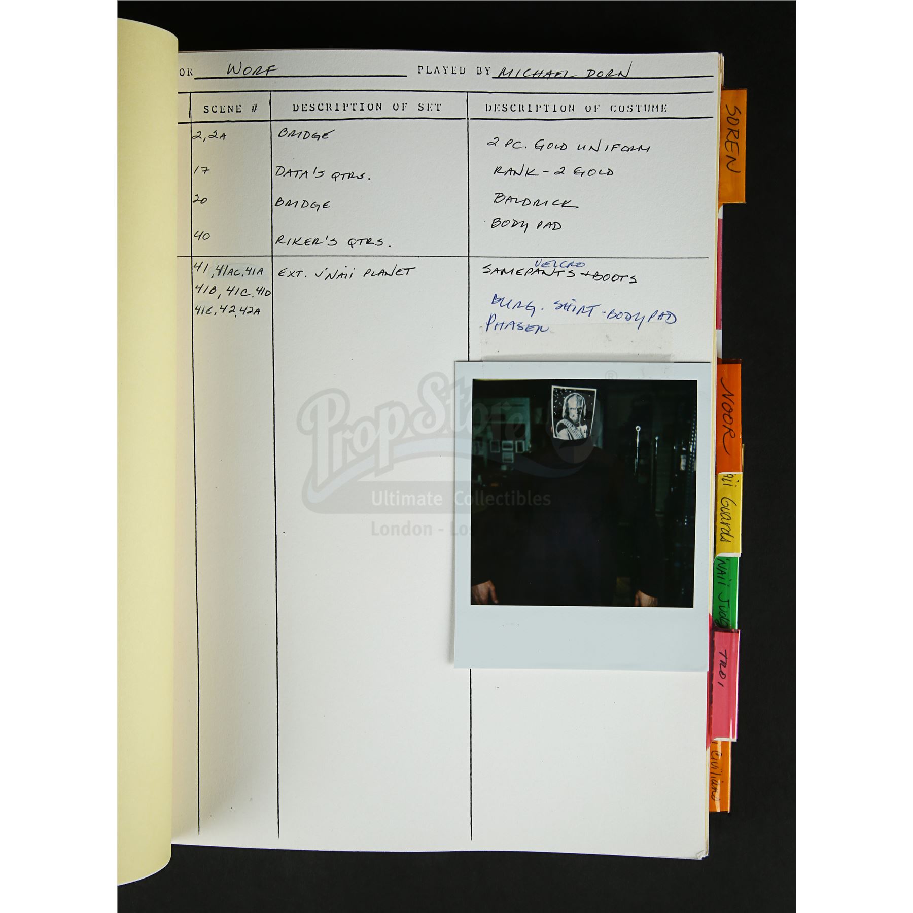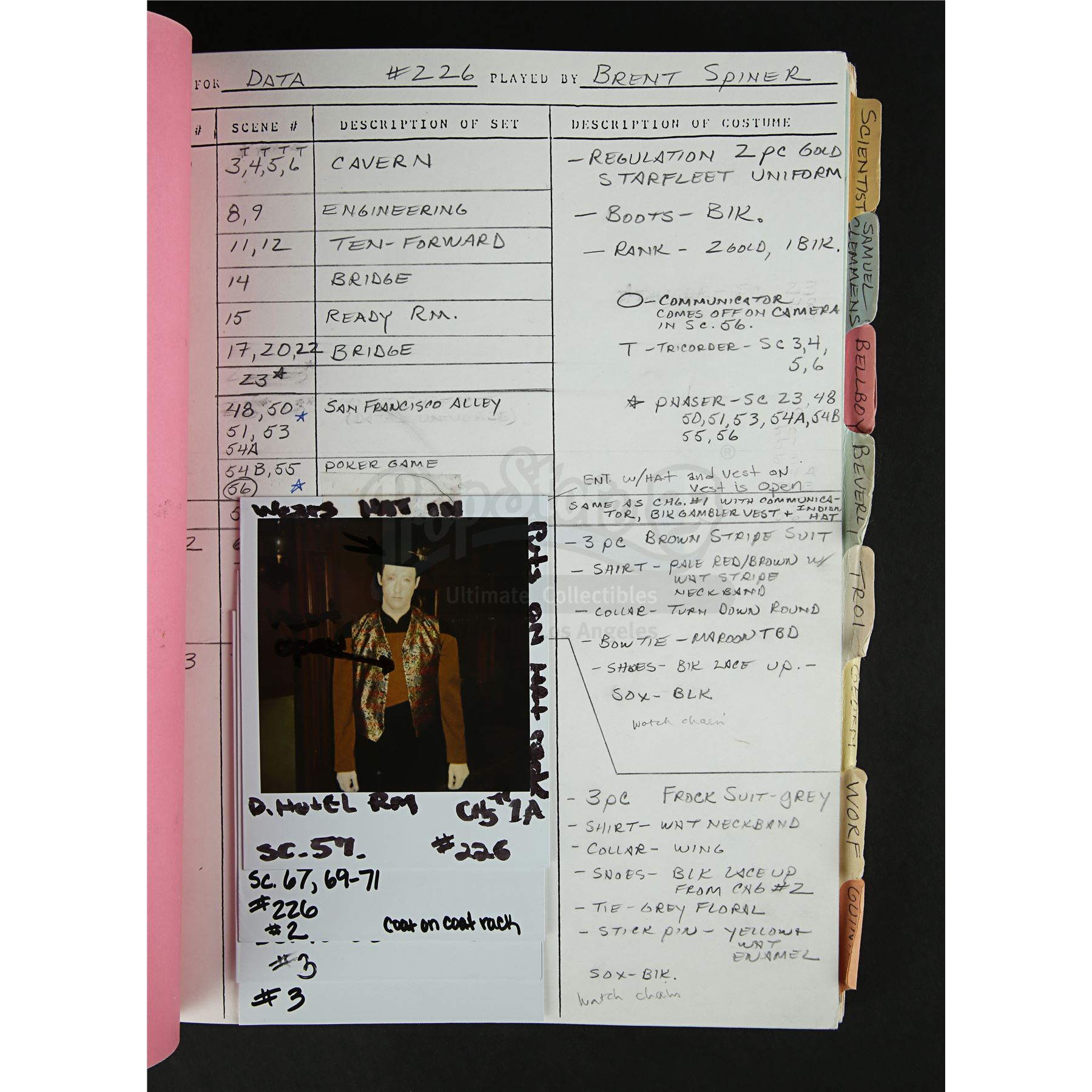 This lot will be auctioned on Tuesday, June 29th. The auction will begin at 9:00am PDT and lots are sold sequentially via live auctioneer; tune in to the live streaming broadcast on auction day to follow the pace. Note other lots in the auction may close on June 30th or July 1st. A set of costume continuity scripts from the production of the sci-fi TV series Star Trek: The Next Generation. This lot consists of scripts for nine Season 5 episodes. Some of the scripts were attributed to key costumers Amanda Chamberlin and Jerry Bono. Each document contains a revised final draft script and detailed costume breakdown sheets. There are 302 Polaroid photographs adhered to their corresponding pages, which show principal and supporting cast members, including Picard (Patrick Stewart), Riker (Jonathan Frakes), Deanna Troi (Marina Sirtis), Data (Brent Spiner), Wesley Crusher (Wil Wheaton) and Guinan (Whoopi Goldberg). The set displays minor marks, creasing, rips, and edgewear but remains in good overall condition. Dimensions: (largest script): 11" x 9" x 1.5" (28 cm x 23 cm x 4 cm) Sold without copyright; see copyright notice in the Buyer's Guide. Estimate: $4,000 - 6,000