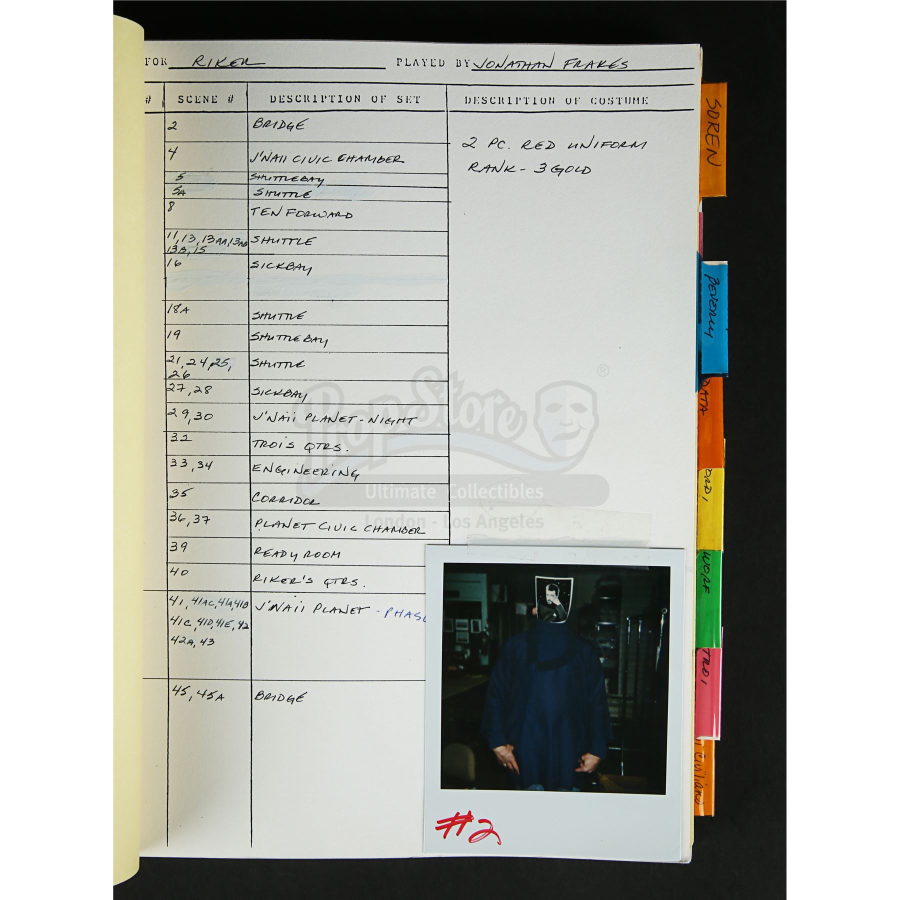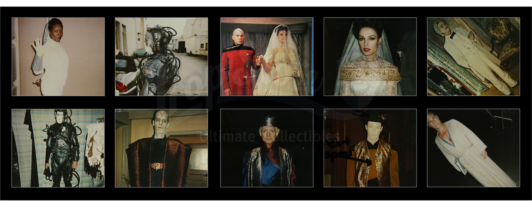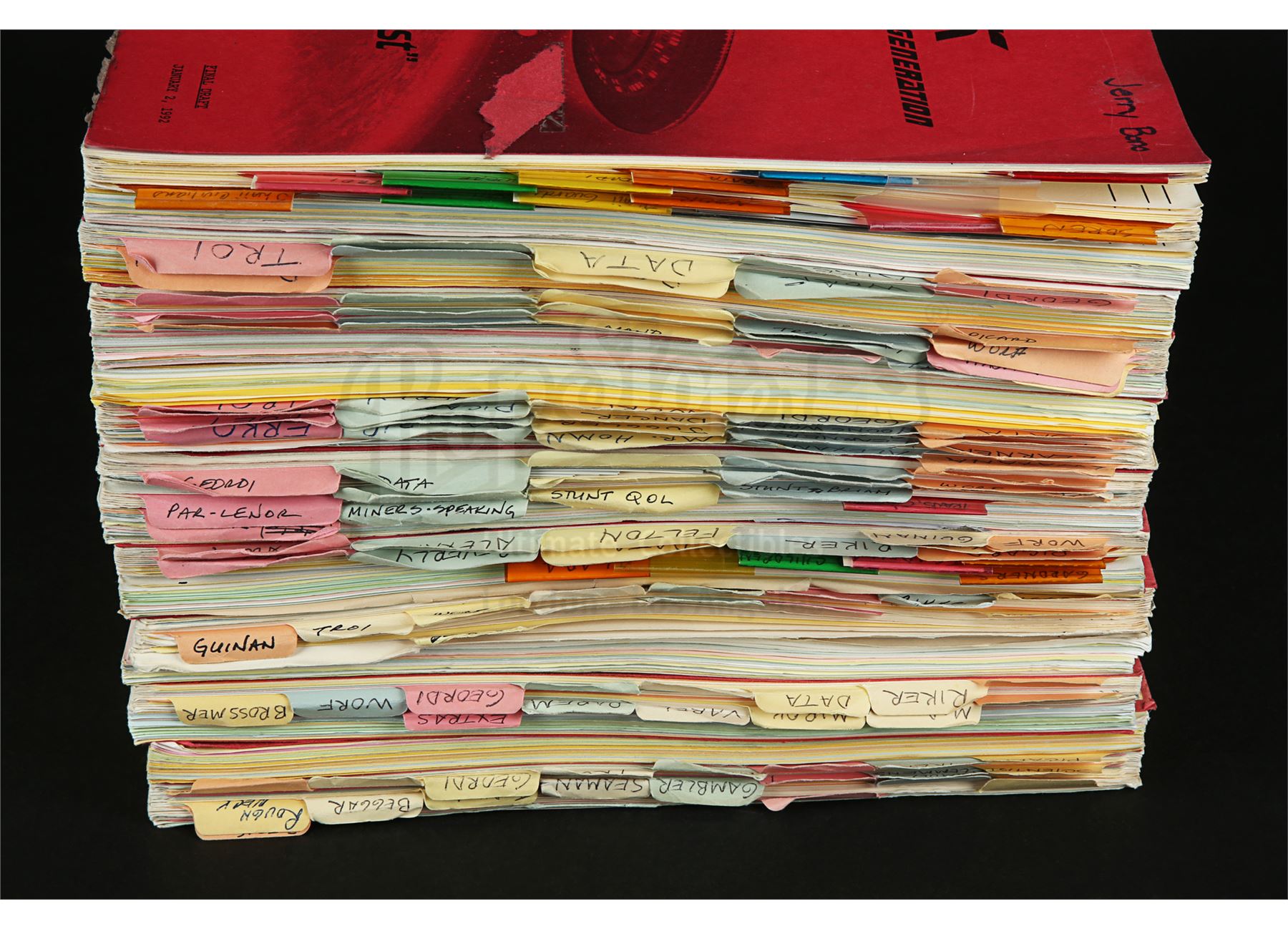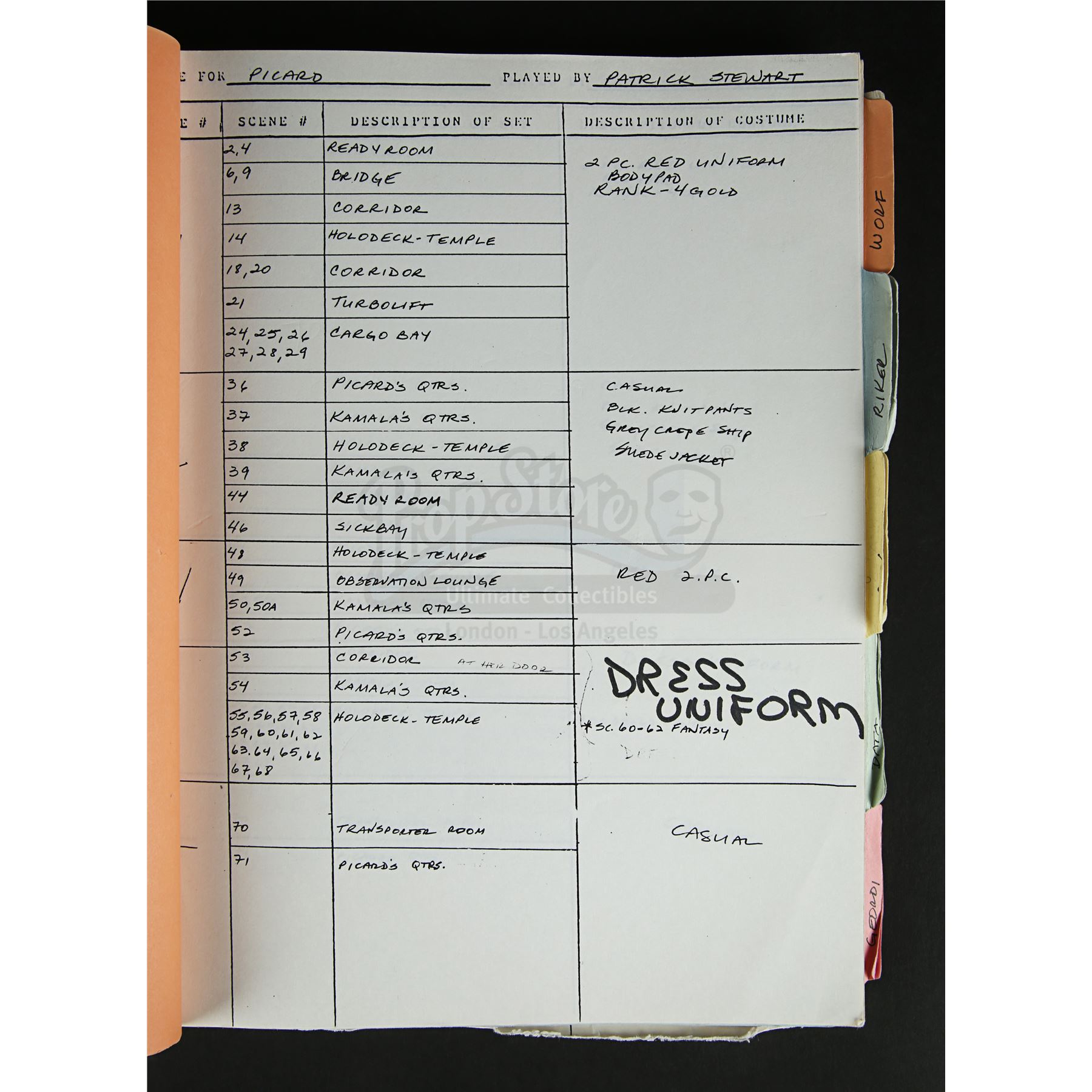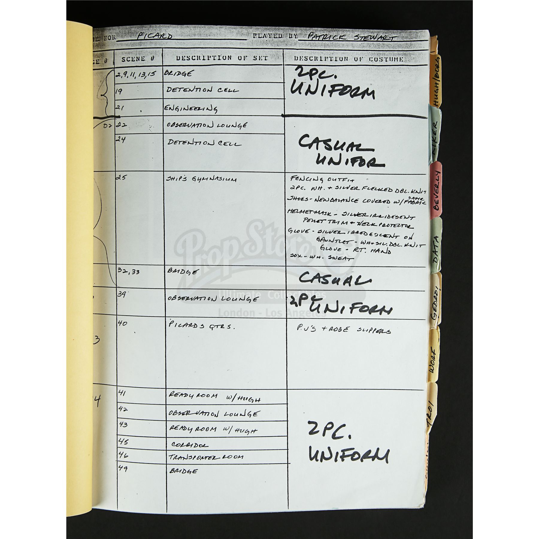 This lot will be auctioned on Tuesday, June 29th. The auction will begin at 9:00am PDT and lots are sold sequentially via live auctioneer; tune in to the live streaming broadcast on auction day to follow the pace. Note other lots in the auction may close on June 30th or July 1st. A set of costume continuity scripts from the production of the sci-fi TV series Star Trek: The Next Generation. This lot consists of scripts for nine Season 5 episodes. Some of the scripts were attributed to key costumers Amanda Chamberlin and Jerry Bono. Each document contains a revised final draft script and detailed costume breakdown sheets. There are 302 Polaroid photographs adhered to their corresponding pages, which show principal and supporting cast members, including Picard (Patrick Stewart), Riker (Jonathan Frakes), Deanna Troi (Marina Sirtis), Data (Brent Spiner), Wesley Crusher (Wil Wheaton) and Guinan (Whoopi Goldberg). The set displays minor marks, creasing, rips, and edgewear but remains in good overall condition. Dimensions: (largest script): 11" x 9" x 1.5" (28 cm x 23 cm x 4 cm) Sold without copyright; see copyright notice in the Buyer's Guide. Estimate: $4,000 - 6,000