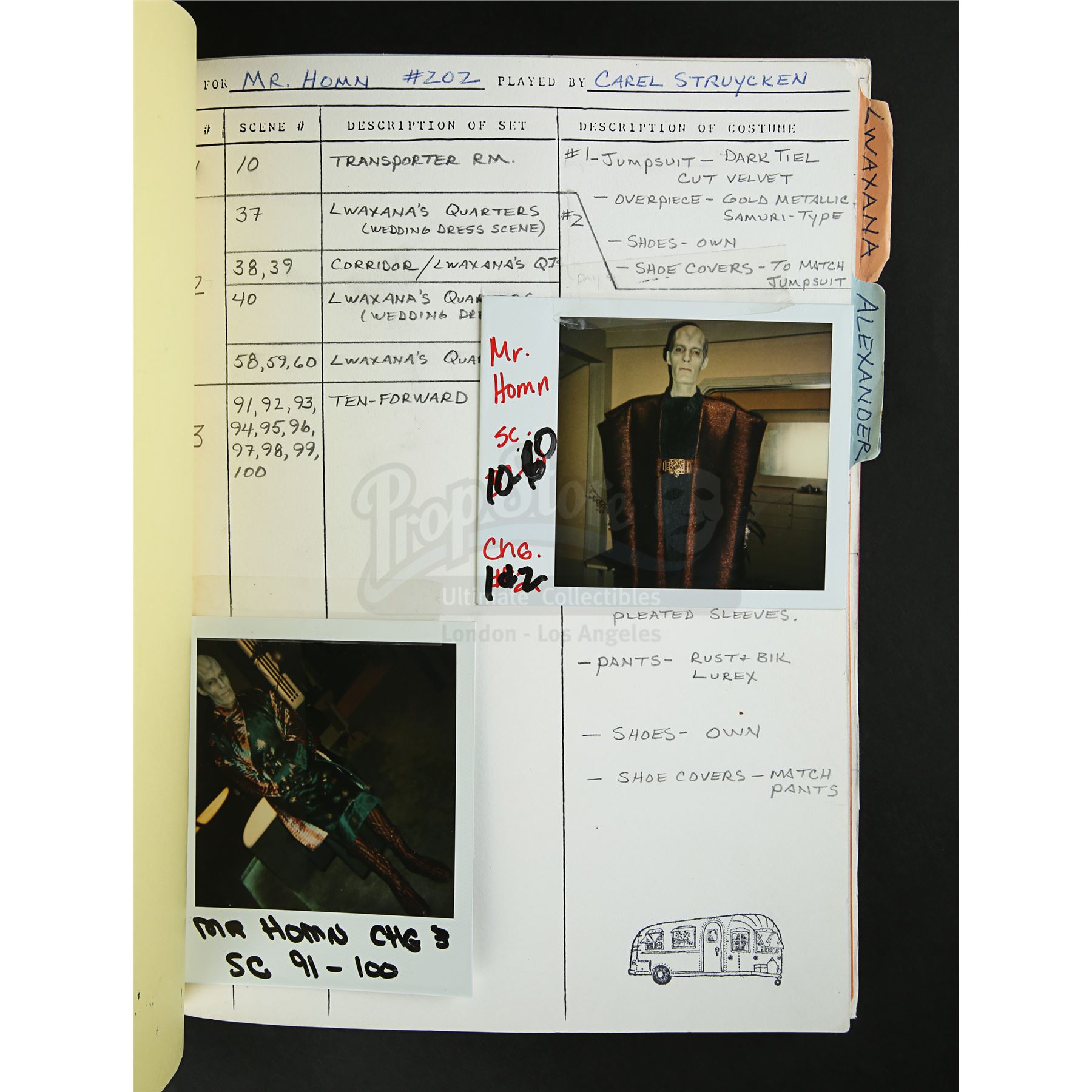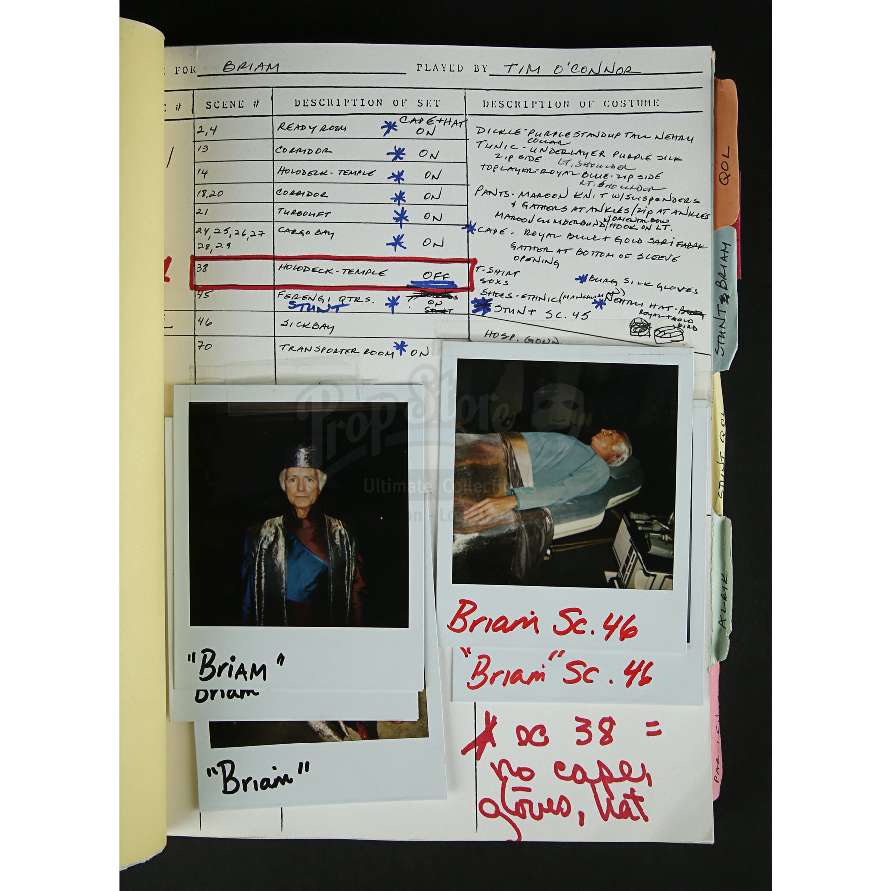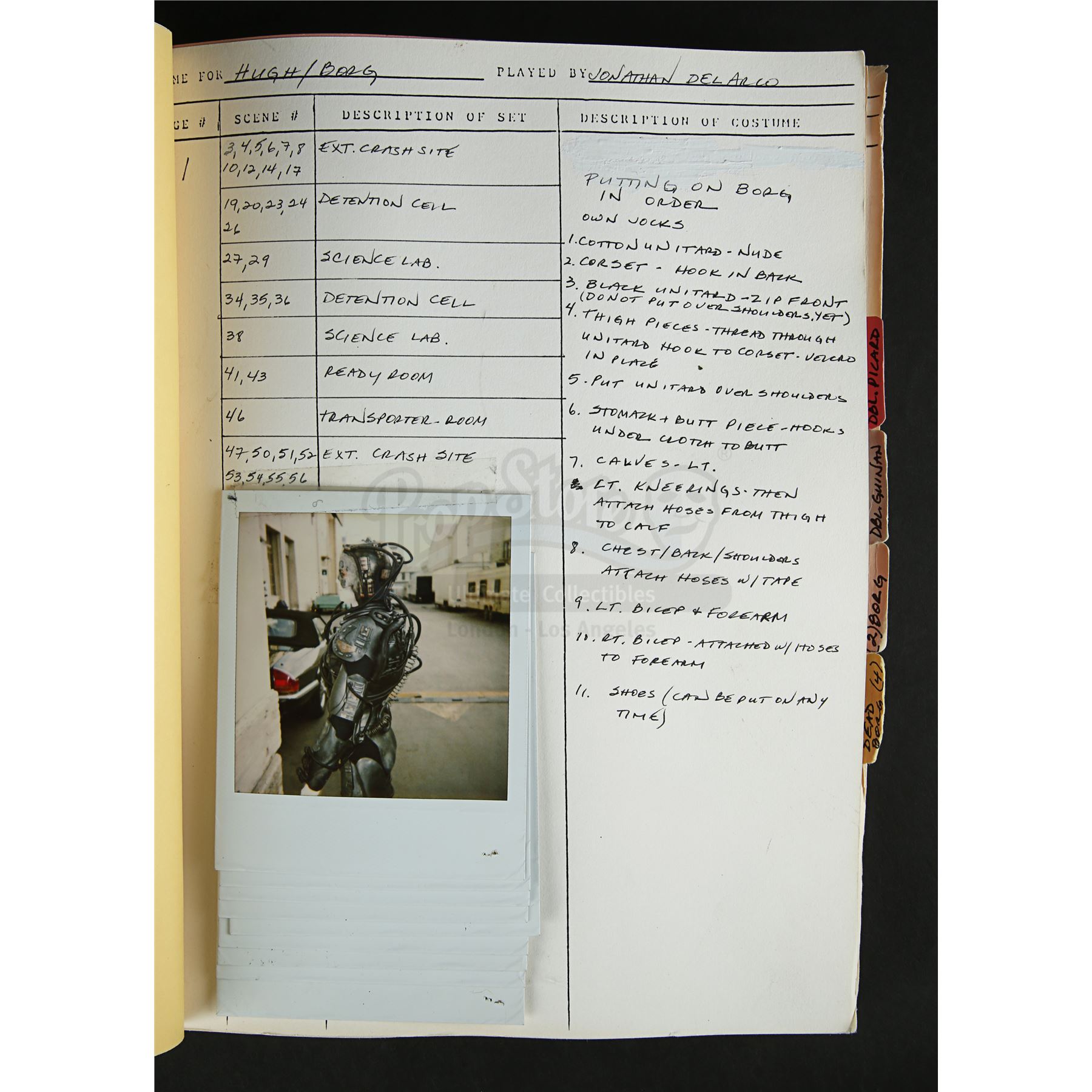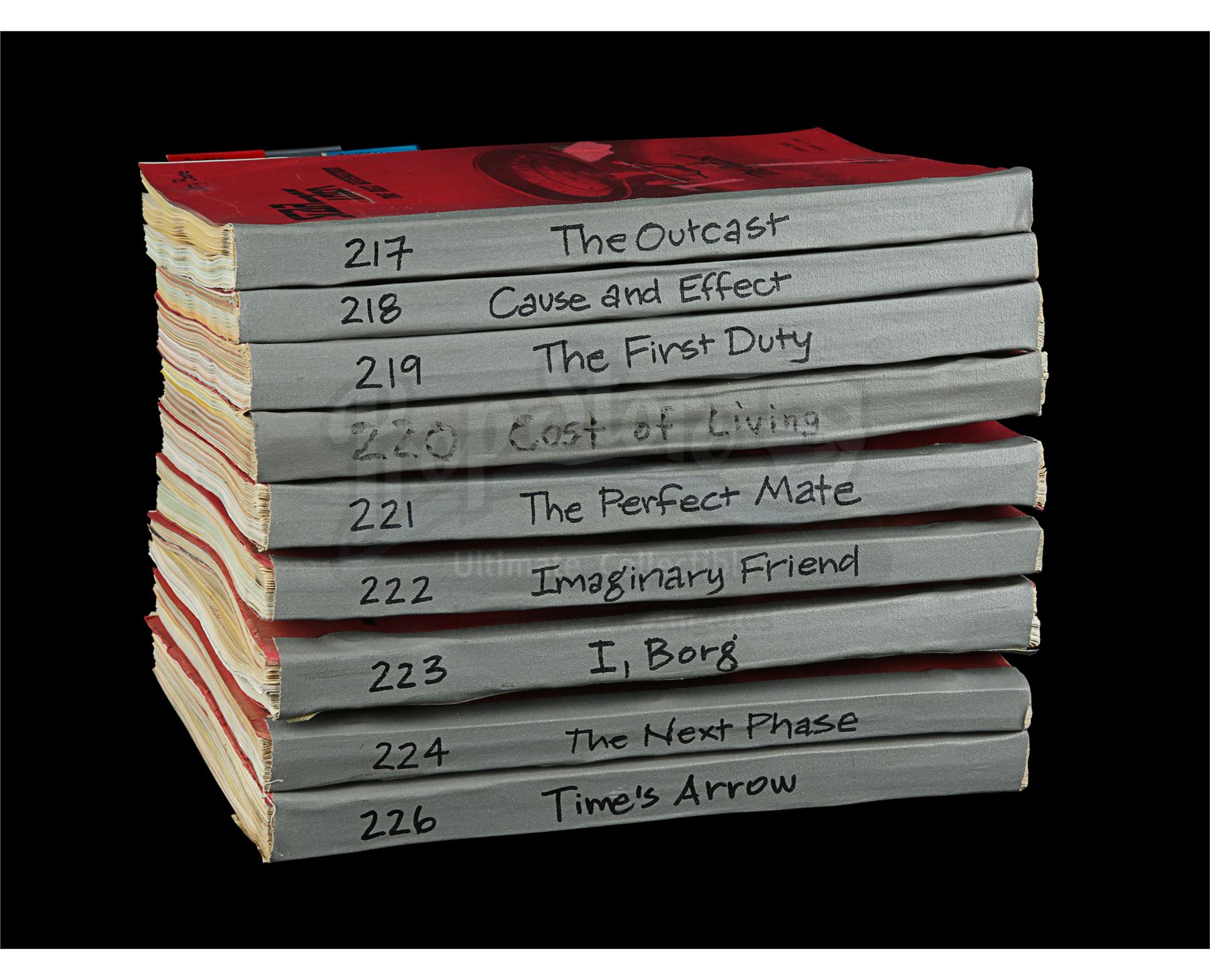 This lot will be auctioned on Tuesday, June 29th. The auction will begin at 9:00am PDT and lots are sold sequentially via live auctioneer; tune in to the live streaming broadcast on auction day to follow the pace. Note other lots in the auction may close on June 30th or July 1st. A set of costume continuity scripts from the production of the sci-fi TV series Star Trek: The Next Generation. This lot consists of scripts for nine Season 5 episodes. Some of the scripts were attributed to key costumers Amanda Chamberlin and Jerry Bono. Each document contains a revised final draft script and detailed costume breakdown sheets. There are 302 Polaroid photographs adhered to their corresponding pages, which show principal and supporting cast members, including Picard (Patrick Stewart), Riker (Jonathan Frakes), Deanna Troi (Marina Sirtis), Data (Brent Spiner), Wesley Crusher (Wil Wheaton) and Guinan (Whoopi Goldberg). The set displays minor marks, creasing, rips, and edgewear but remains in good overall condition. Dimensions: (largest script): 11" x 9" x 1.5" (28 cm x 23 cm x 4 cm) Sold without copyright; see copyright notice in the Buyer's Guide. Estimate: $4,000 - 6,000