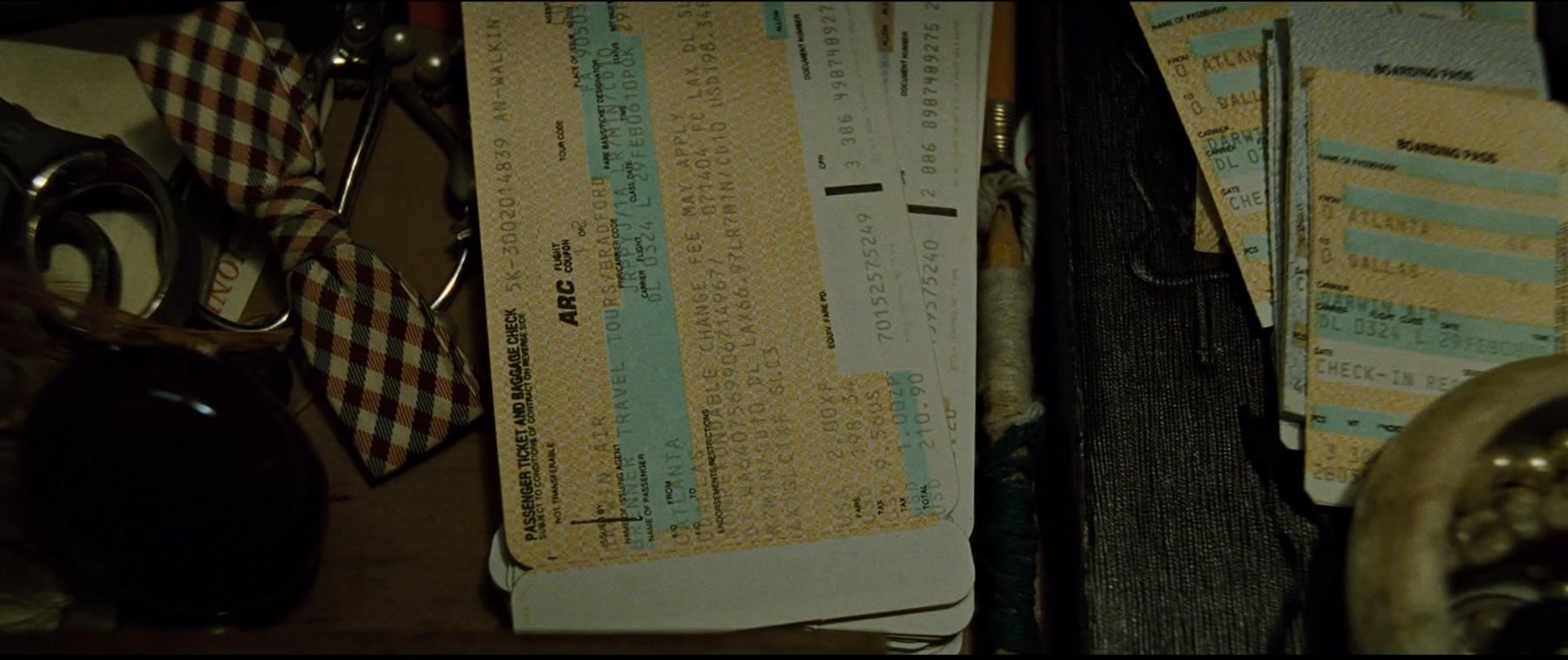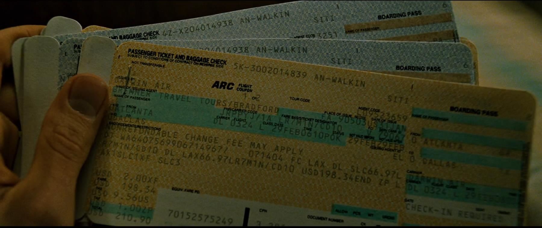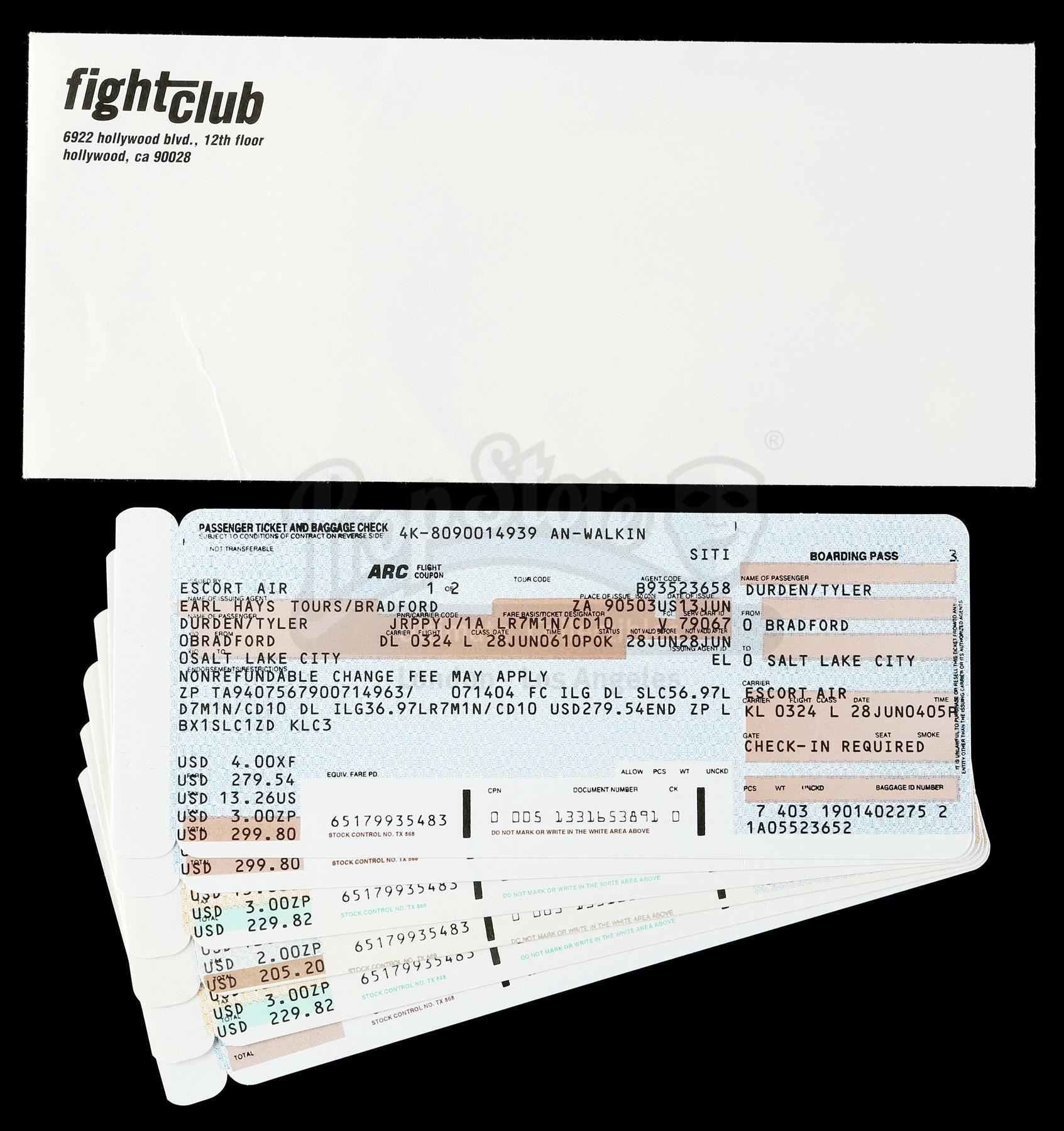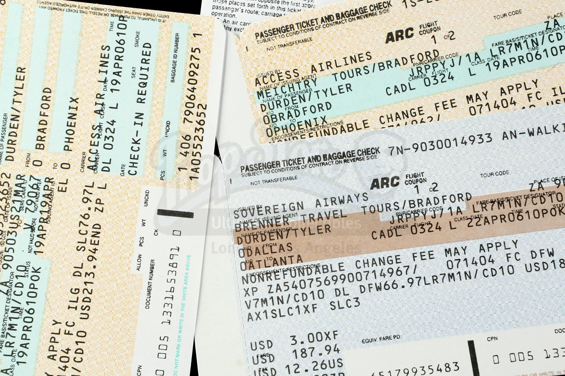 Tyler Durden's (Brad Pitt) boarding passes from David Fincher's drama Fight Club. The Narrator (Edward Norton) stumbled across multiple boarding passes when he went through Tyler Durden's belongings. The boarding passes feature information such as Tyler Durden's name, seating information, and his travel itinerary from Bradford to Phoenix.