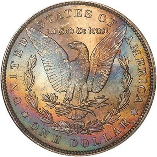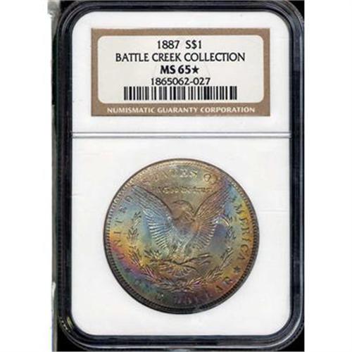 1887 Morgan Dollar. Lovely shades of color on the reverse centered around blues and amber-with-lavender shades. Thoroughly original, a solid Gem MS65 in its own right, as well. (#7172)<p><i>from The Battle Creek Collection, Part III</i>